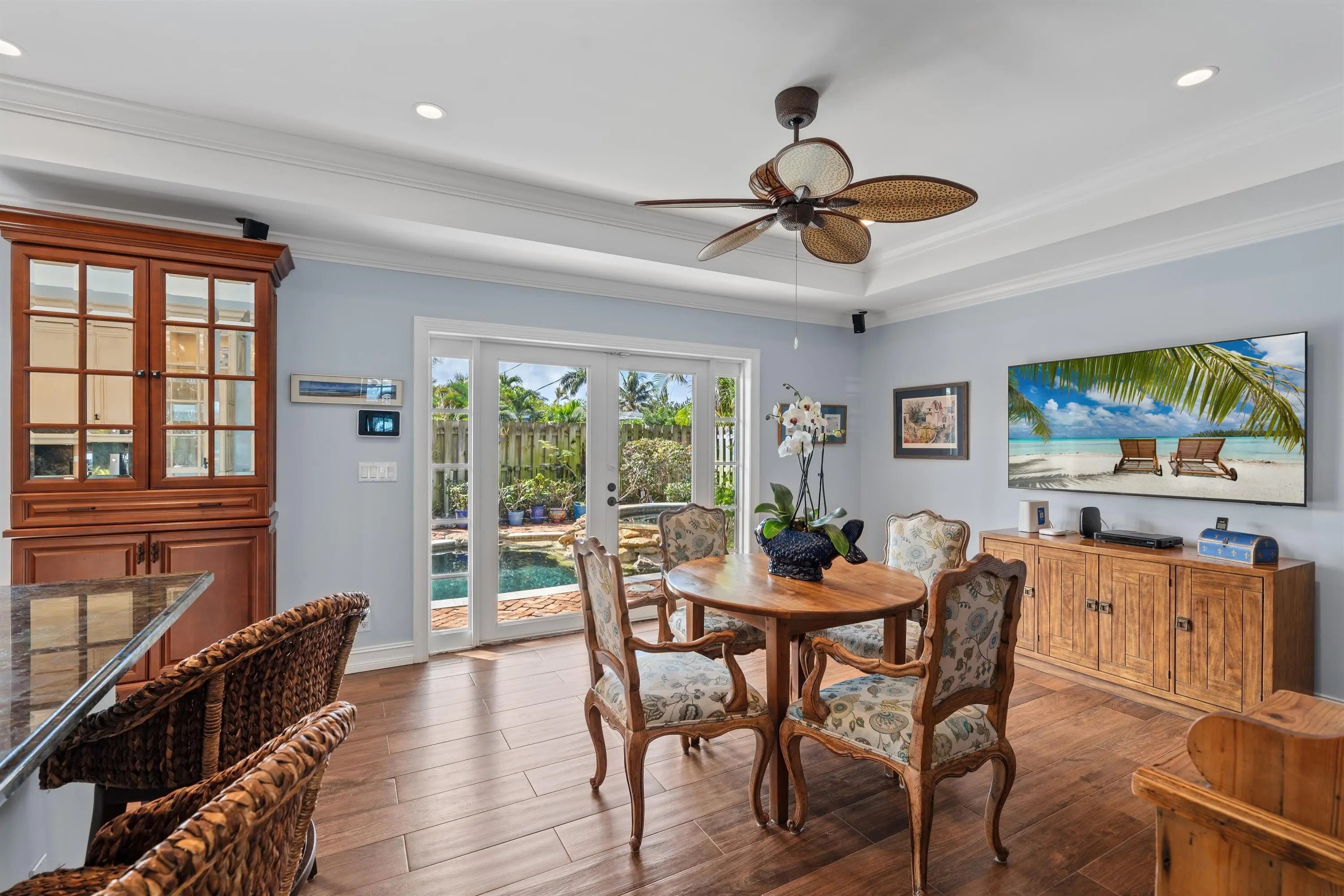 402 Lake Drive, Delray Beach, Florida: Minutes from the ocean, vibrant downtown Delray Beach and the Delray Beach Playhouse, the desirable Lake Ida neighborhood is a peaceful oasis centered on two lakefront parks on a picturesque lake offering boating and fishing. On a corner parcel, the lagoon-style pool with a spillover spa is set within a Chicago brick-paved patio in the tropically landscaped, hedged back yard. A new carport was added in front and a newly fenced and turfed side yard that also has a shed provides a play area for children and pets. Ready for immediate enjoyment, this exquisitely renovated, freshly painted residence, with three bedrooms and 2,065± total square feet, defines tropical elegance with uncompromising upgrades and curated detailing. In the living room, French doors flanked by windows bring in abundant natural light, while the peaked ceiling adds volume and character. The formal sunken dining room is finished with a built-in bar and wall of cabinetry with banks of French doors that open to the pool terrace. The open-concept kitchen and adjoining family room/lounge also offer French doors to the pool terrace for seamless indoor/outdoor living. Fittings in the kitchen include a prep island with a sink, wood cabinetry including a built-in china cabinet and pantry, granite counters and premier appliances. The privately sited primary suite comprises custom-fitted closets, a dressing area and a tiled bathroom. Sharing a bathroom are two guest bedrooms, one with a built-in desk and bookcases, and the other with built-in closets and a dresser. Completing the layout are a powder room, laundry room and a new carport. Amenities include LED lighting, plantation shutters and Chicago brick, wood-look tile and bamboo flooring. Conveniences include a metal roof, a tankless hot-water heater, a propane gas tank and impact windows and doors. DISCLAIMER: Information published or otherwise provided by the listing company and its representatives including but not limited to prices, measurements, square footages, lot sizes, calculations, statistics, and videos are deemed reliable but are not guaranteed and are subject to errors, omissions or changes without notice. All such information should be independently verified by any prospective purchaser or seller. Parties should perform their own due diligence to verify such information prior to a sale or listing. Listing company expressly disclaims any warranty or representation regarding such information. Prices published are either list price, sold price, and/or last asking price. The listing company participates in the Multiple Listing Service and IDX. The properties published as listed and sold are not necessarily exclusive to listing company and may be listed or have sold with other members of the Multiple Listing Service. Transactions where listing company represented both buyers and sellers are calculated as two sales. "No payments made until title passes" Some affiliations may not be applicable to certain geographic areas. If your property is currently listed with another broker, please disregard any solicitation for services. Information published or otherwise provided by seller, listing company or its representatives is deemed reliable but are not guaranteed and subject to errors, omissions, or changes without notice. Copyright 2026 by the listing company. All Rights Reserved.