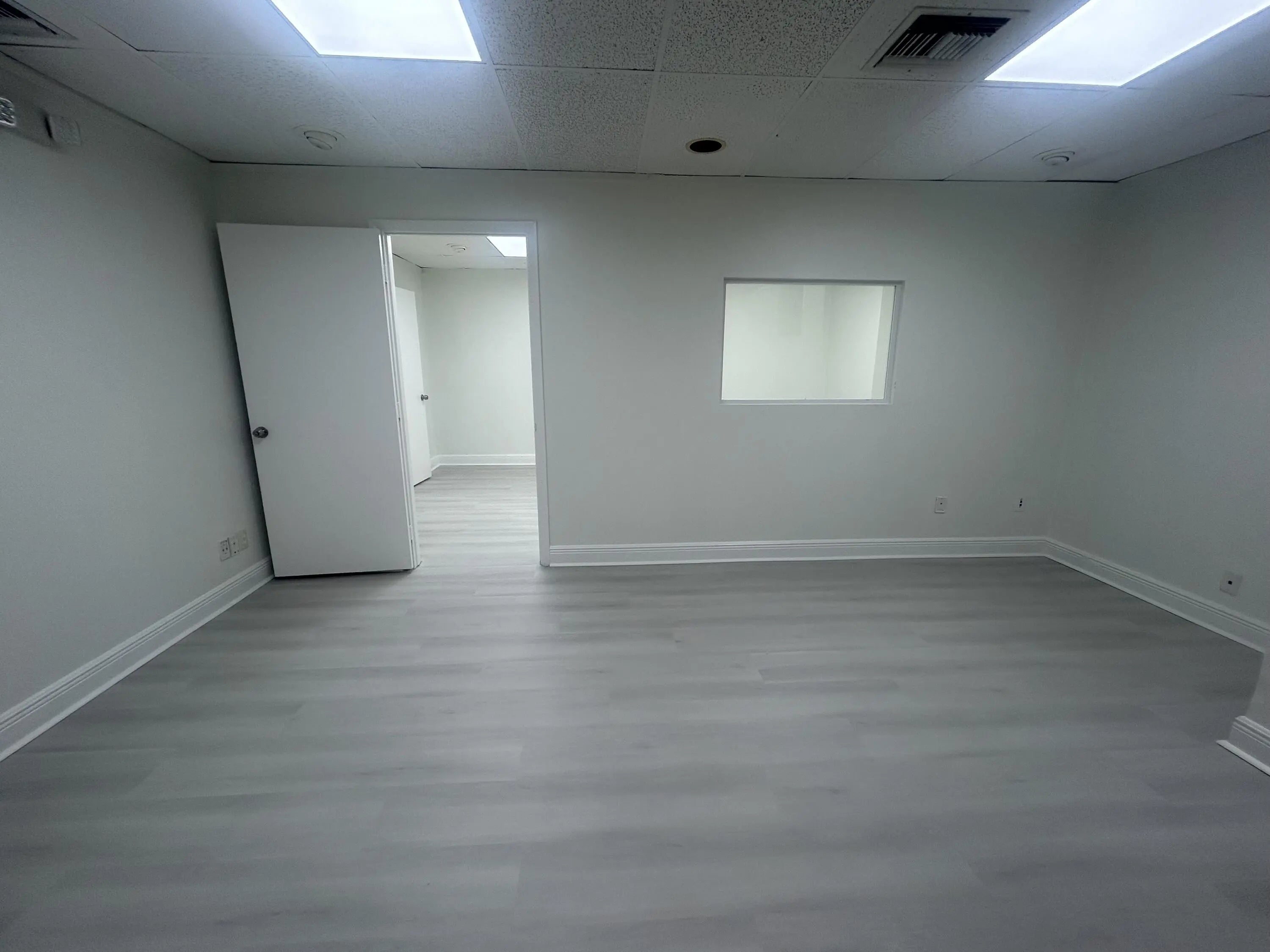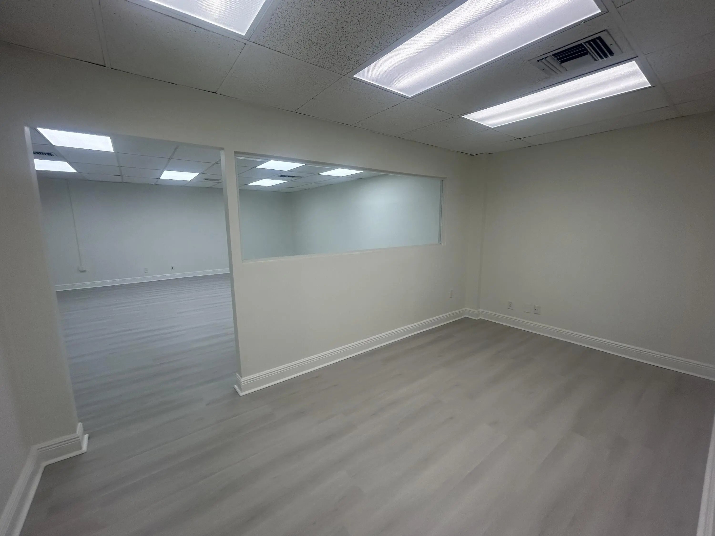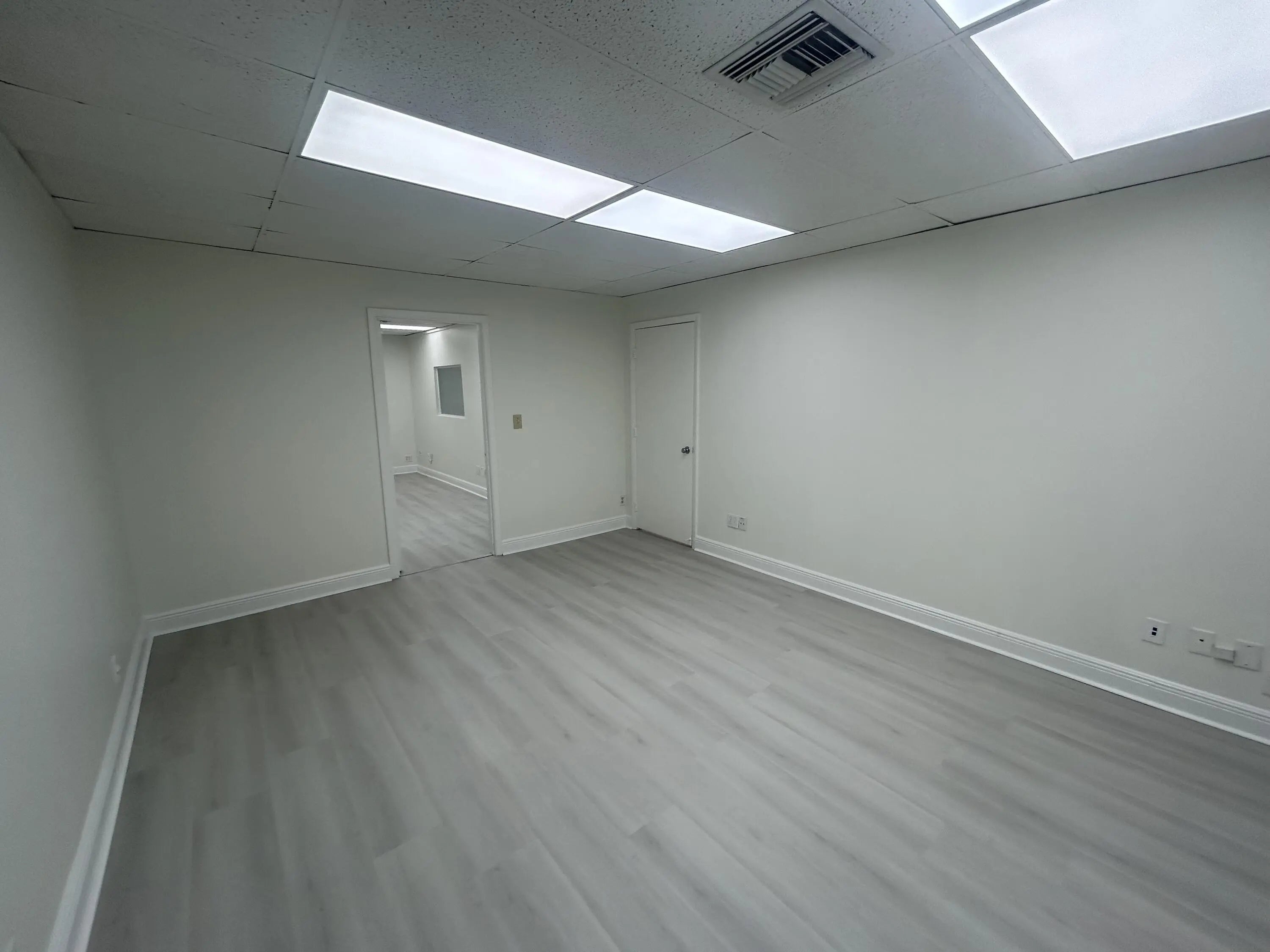 Unit 104, in its entirety is 1300 square feet and rents for $2,600/month. It is a newly renovated 5-room office with a kitchen and two entrances in an excellent location in Coral Springs. Electricity, A/C, and access to building's private parking included. However, it can also be divided into smaller units. 590 square feet space (3-room office) available for $1,180/month. 710 square foot space (2-room office with a kitchen/dining area and 2 entrances) for $1400/month. Or add a third room (additional 200 square feet) to that configuration and make it $1800/month.