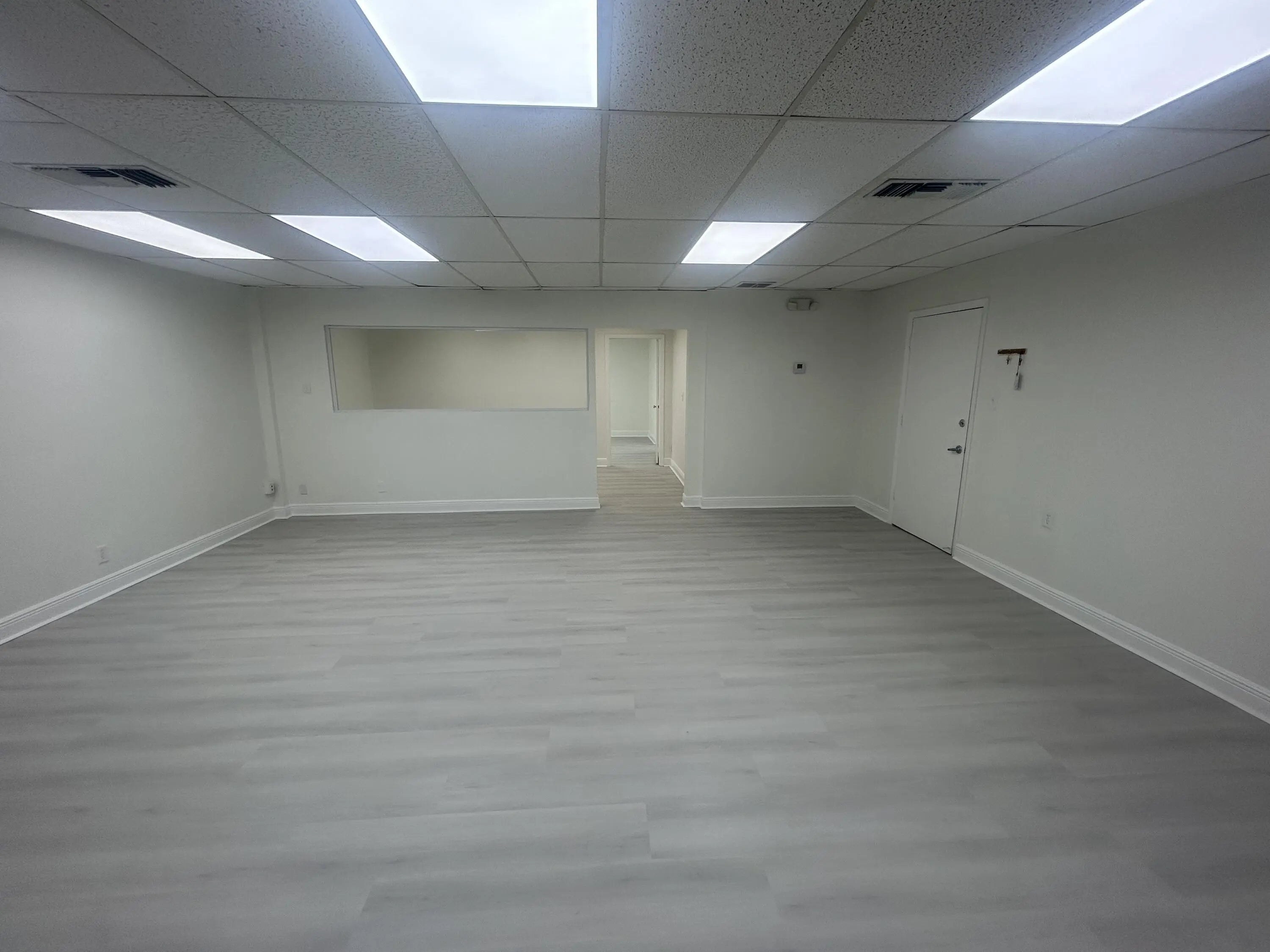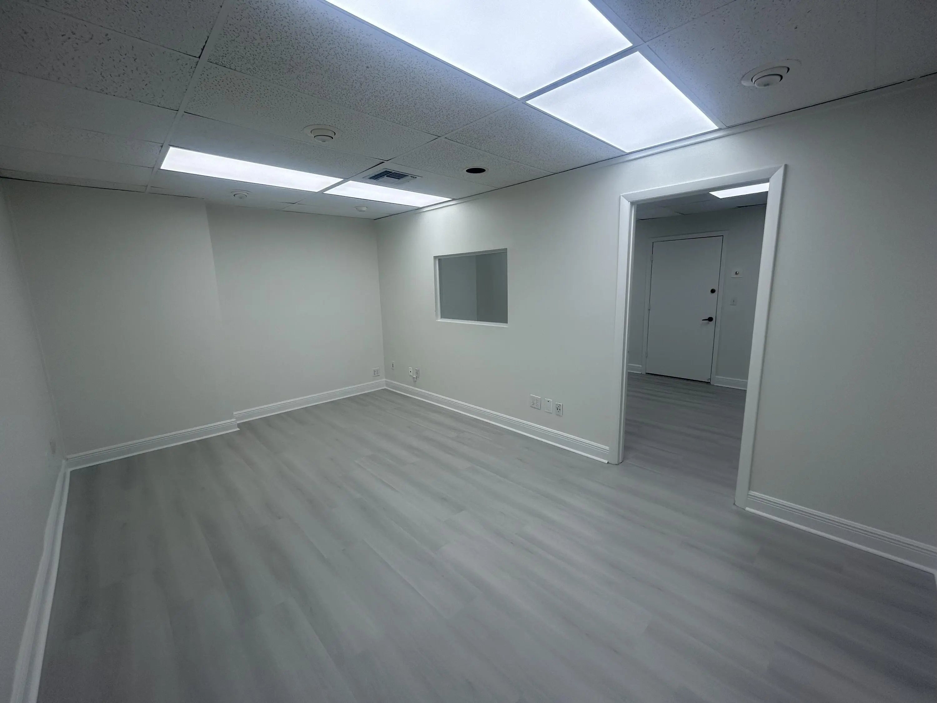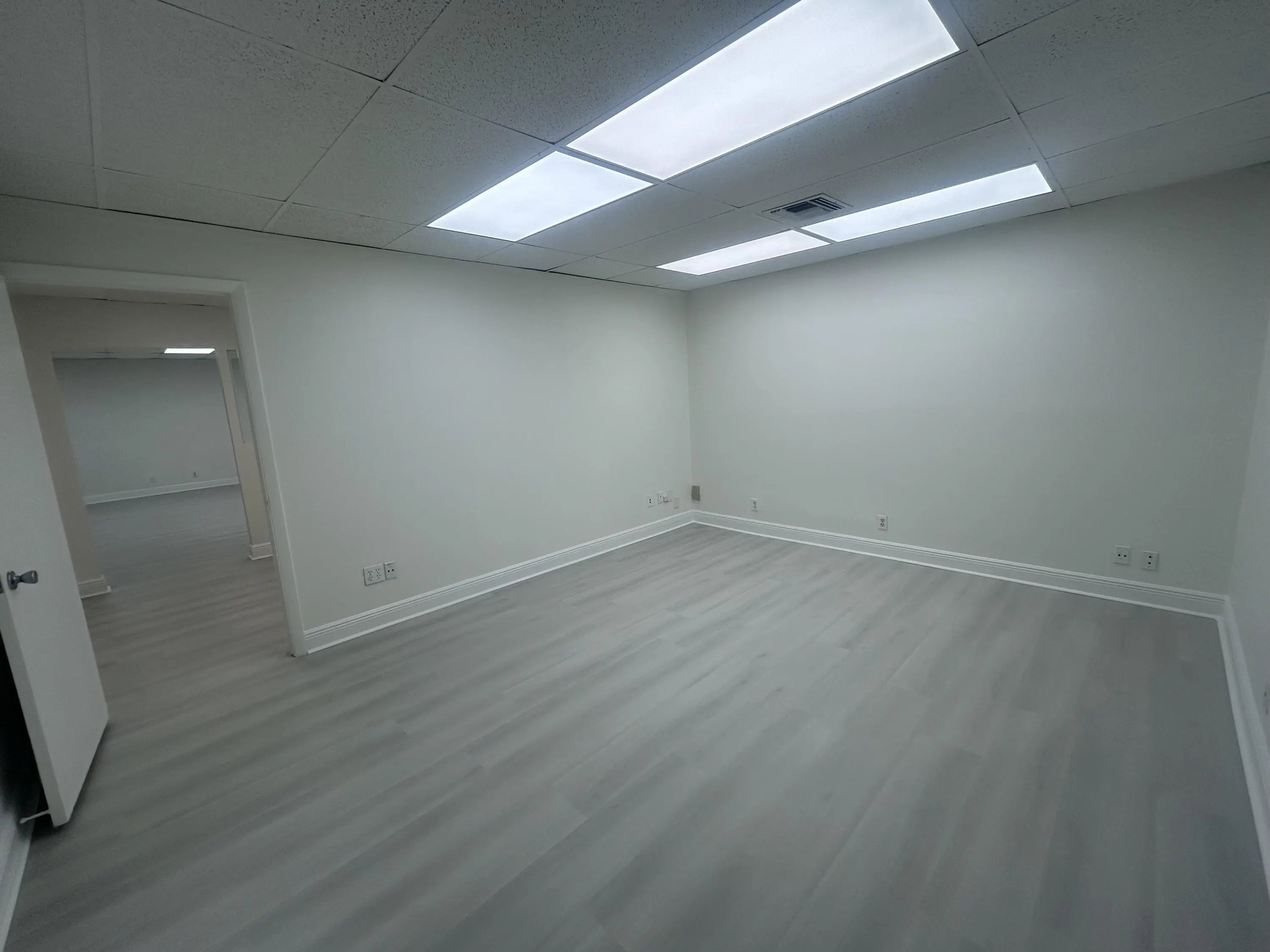 Unit 104, in its entirety is 1300 square feet and rents for $2,600/month. It is a newly renovated 5-room office with a kitchen and two entrances in an excellent location in Coral Springs. Electricity, A/C, and access to building's private parking included. However, it can also be divided into smaller units. 590 square feet space (3-room office) available for $1,180/month. 710 square foot space (2-room office with a kitchen/dining area and 2 entrances) for $1400/month. Or add a third room (additional 200 square feet) to that configuration and make it $1800/month.