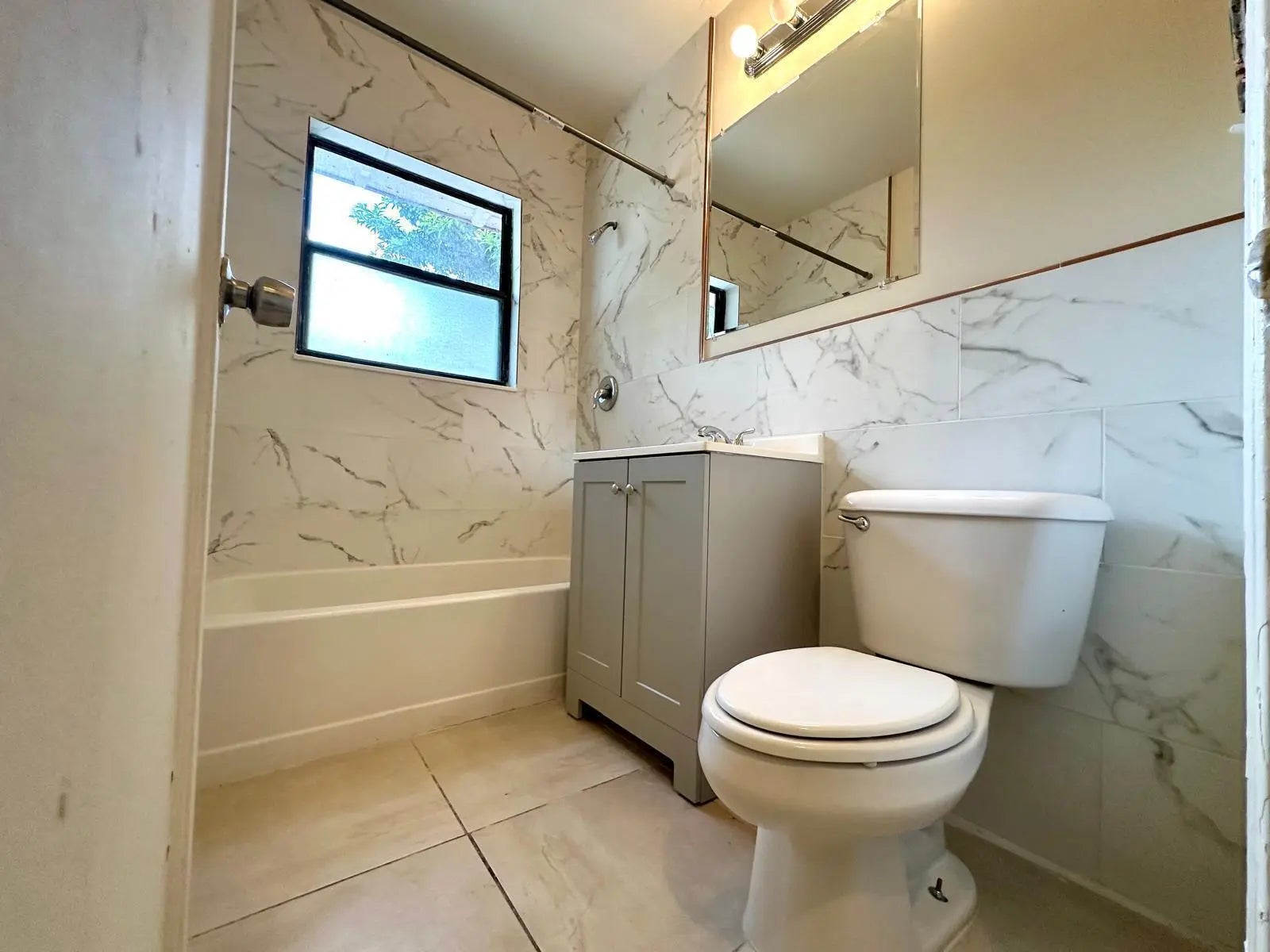 2 bedroom, 1 Bath. Renovated unit: New floors in both bedrooms and living room, New Bathroom, Kitchen 1 year old. Large fenced in patio. Laundry facilities, water included.