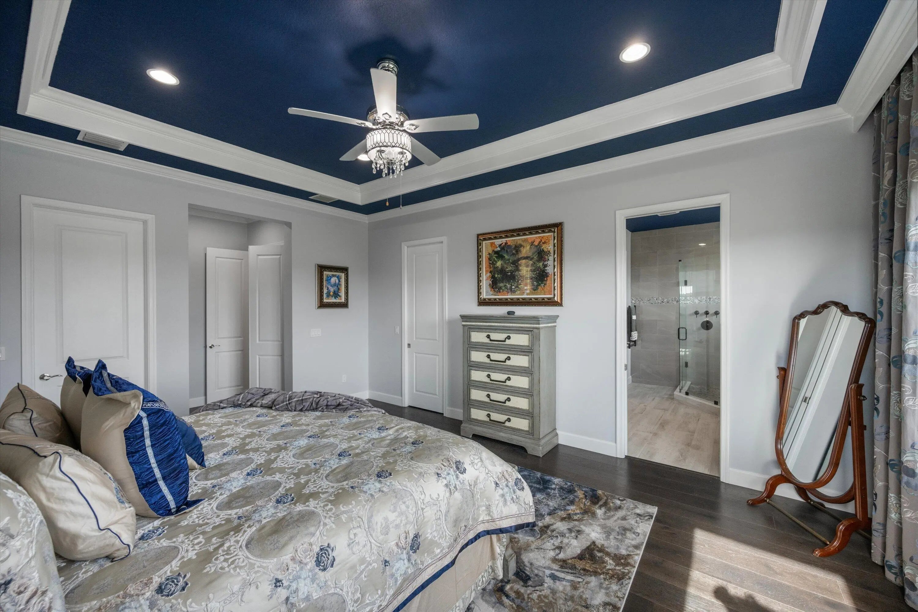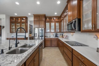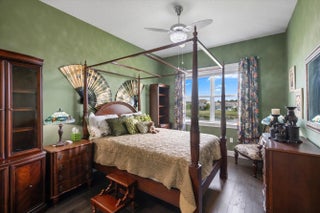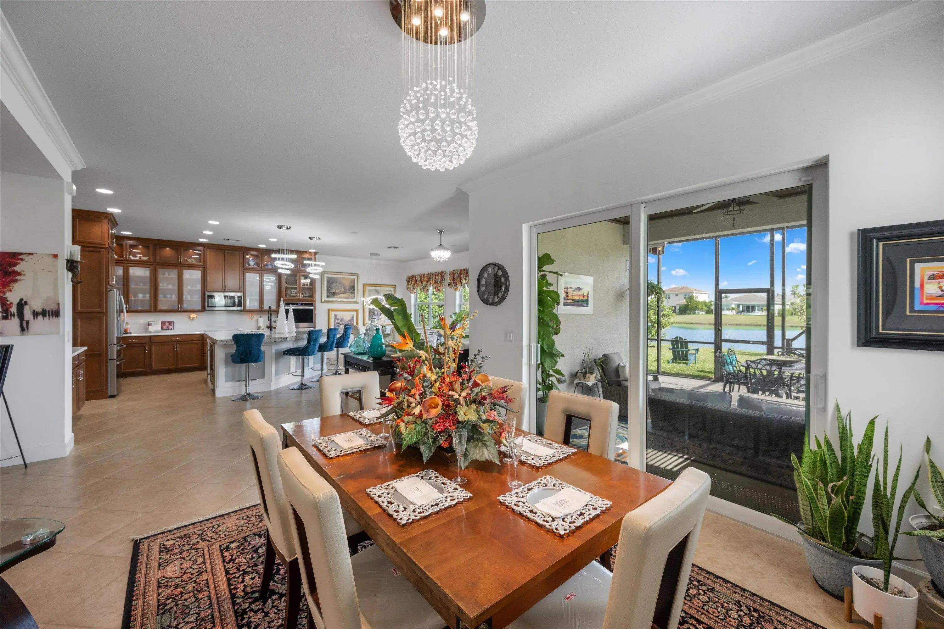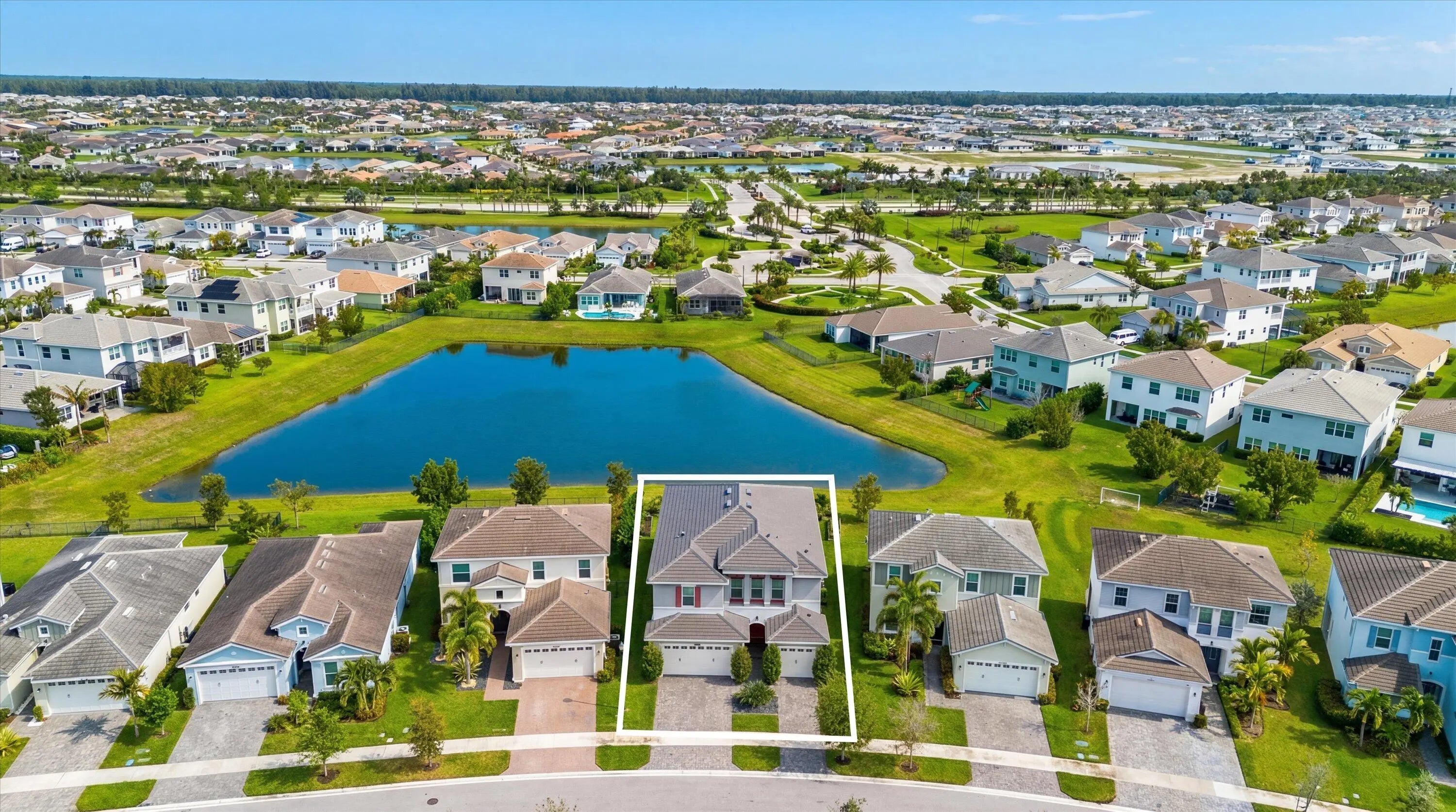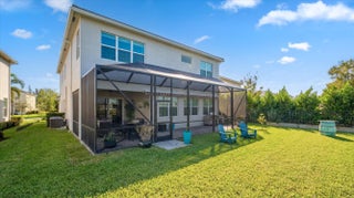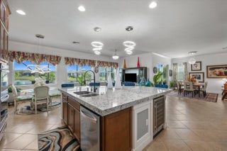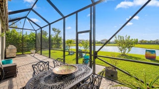 True showstopper. This exceptional five-bedroom lakefront residence stands apart with custom finishes and design details not typically found in Westlake's newer construction homes. A grand double etched-glass entry with bespoke wood ceiling, opens to a striking wood staircase with custom inlay and rich engineered wood flooring that extends through the office, staircase, and entire second level, all complemented by crown molding throughout. A refined front living space with dramatic coffered beam ceilings, private office with double glass doors, spacious family room, and a reimagined dining area create a layout that is both elegant and functional. The fully upgraded kitchen impresses with ceiling-height cabinetry with glass accents, quartz countertops with a bold mitered edge, a decorative wood-paneled island, double ovens, cooktop, upgraded appliances, wine cooler, and reverse osmosis system. A beautifully finished butler's pantry with glass-front cabinetry and quartz counters, along with a custom-built pantry, adds exceptional storage and style. Upstairs, a generous loft leads to five bedrooms, including a stunning primary suite with lake views, custom drapery, and a dramatic navy designer ceiling accented with detailed double crown molding. The spa-like primary bath features a frameless glass shower, dual square sinks, upgraded lighting, wood-look tile flooring, and a smart toilet with built in bidet, auto flush, heated seat and air-drying function. Enjoy exceptional outdoor living with a covered lanai featuring a custom wood ceiling, plus an extended screened-in patio enclosure—perfect for relaxing or entertaining while taking in the serene lake views—enhanced by electric retractable awnings. Additional highlights include a three-car garage with epoxy flooring and overhead storage, impact windows and doors, keyless entry, and custom trim work throughout. Residents enjoy resort-style amenities including Adventure Park with lagoon pool, waterslide, splash pad, fitness trail, dog park, playground, and more.