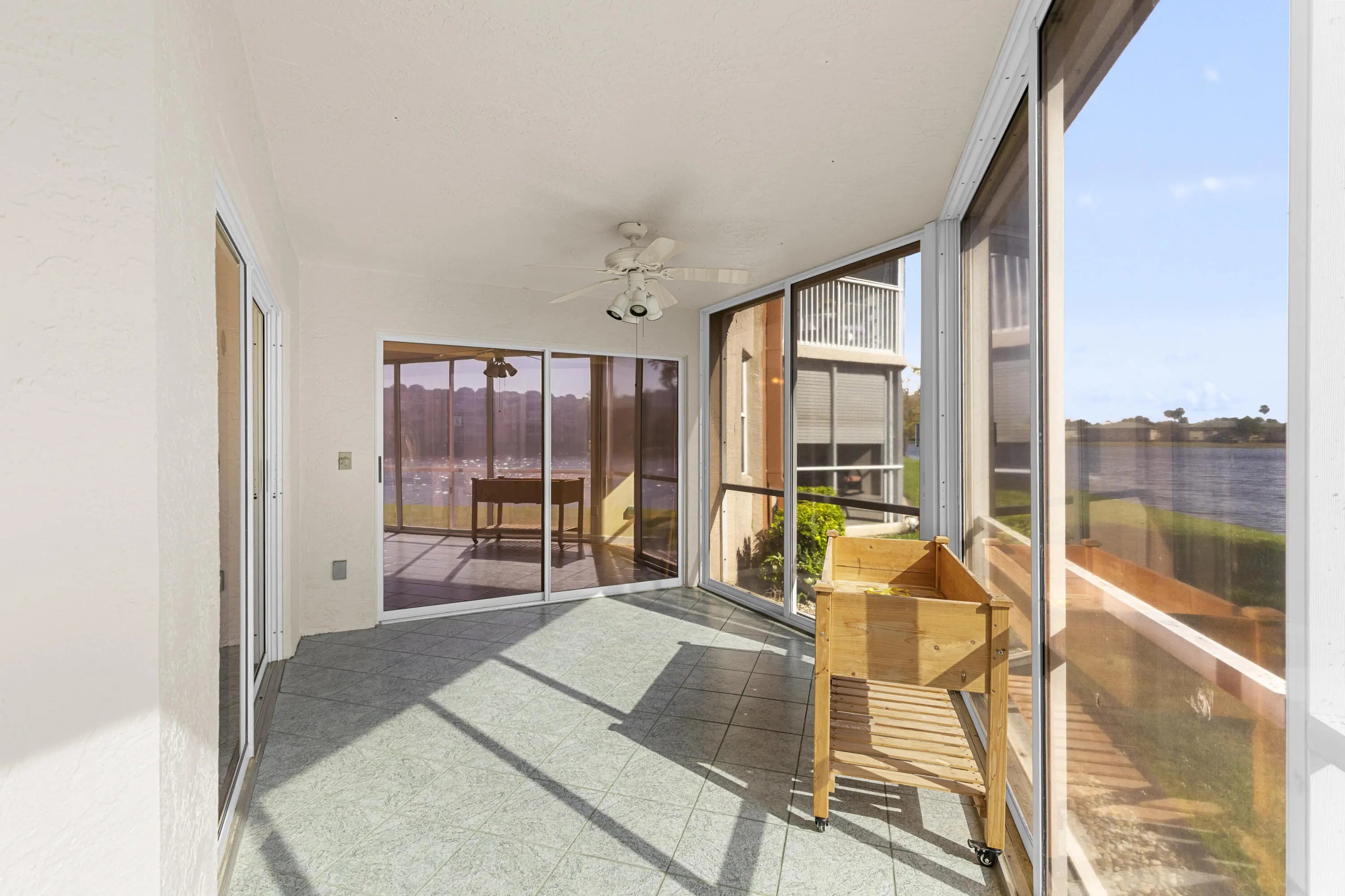 Rarely available first floor 2BR/2BA lake view residence in the desirable Granville neighborhood of Kings Point, a vibrant 55+ guard-gated community. This spacious 1,500 sq ft unit features a private gated courtyard entry, fresh paint and brand new flooring throughout. The layout offers a desirable split floor plan with a large living room, den, breakfast nook, separate laundry room and plenty of storage including a private exterior storage closet. Enjoy beautiful lake views from the glass-enclosed patio with sliding door access from both the living room and main bedroom, providing a gorgeous ground-level setting. Kings Point residents enjoy resort style amenities including pools, fitness center, tennis, pickleball, hobby rooms, business center, BBQ areas, clubhouses, and theatre.