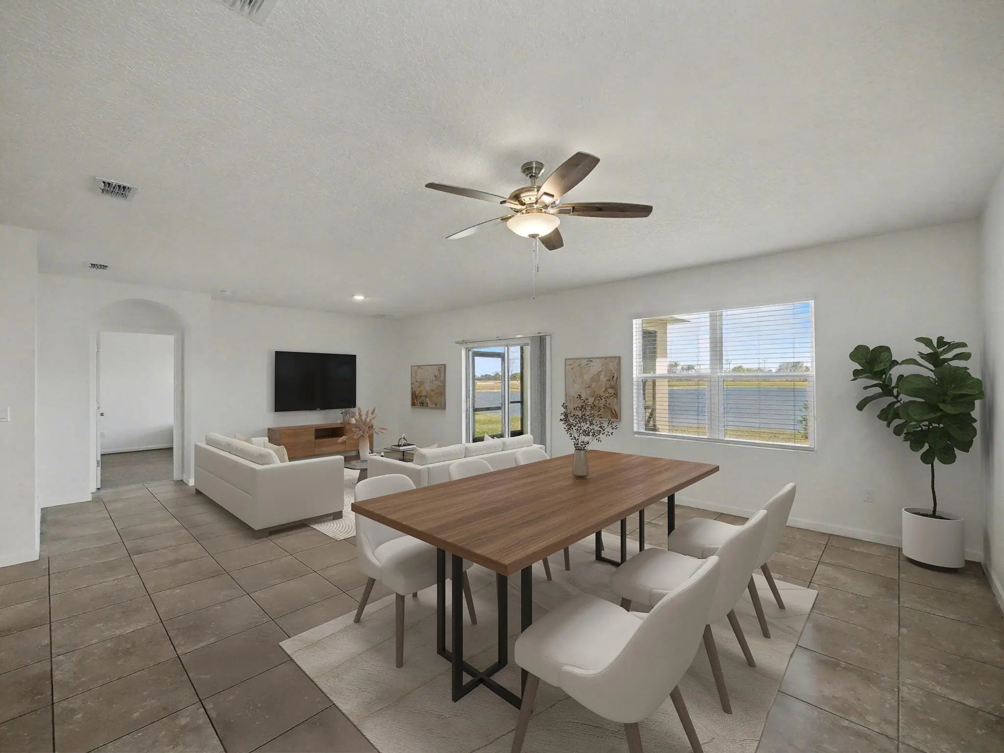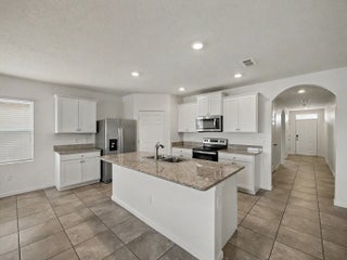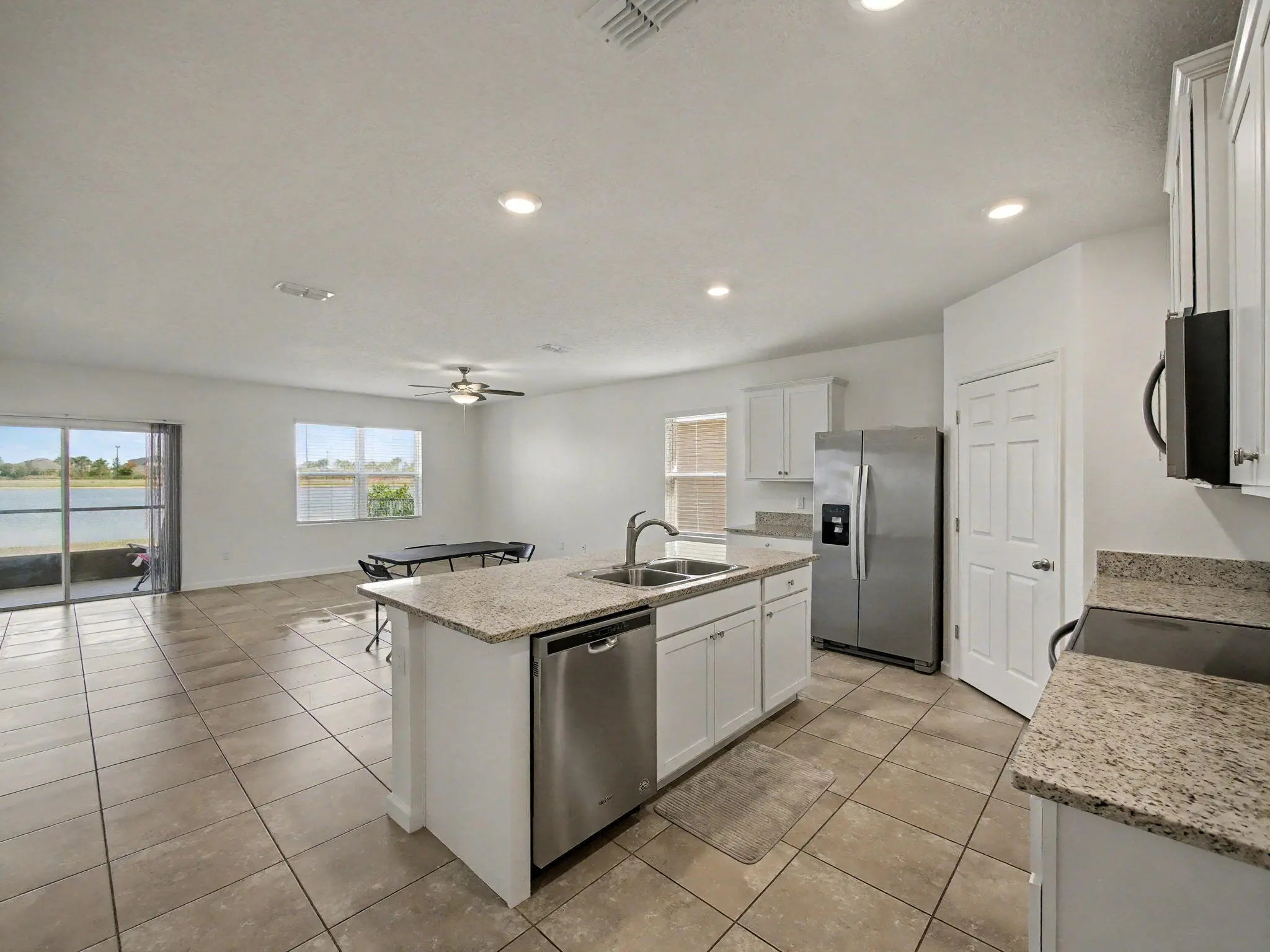 Welcome to this beautifully updated 4-bedroom, 2-bathroom lakefront home in the highly sought-after Preserve at The Estates of Tradition. Freshly painted and featuring brand-new flooring throughout, this move-in-ready residence blends modern style with everyday comfort. Step inside to a spacious open-concept floor plan designed for both relaxed living and easy entertaining. The expansive living and dining areas flow effortlessly into the kitchen, creating a bright and airy space filled with natural light and enhanced by serene lake views. The kitchen offers ample cabinetry and counter space, perfect for gathering with family and friends. The primary suite serves as a private retreat, complete with peaceful water views and a well-appointed en-suite bathroom. Three additional bedrooms provide plenty of flexibility for guests, a home office, or growing households. Enjoy the best of Florida living outdoors, where the backyard overlooks the tranquil lake—ideal for morning coffee, evening sunsets, or weekend relaxation. The home also features a functional layout, generous storage, and inviting curb appeal. Residents of The Preserve at The Estates of Tradition enjoy added value with an HOA that includes cable, high-speed internet, landline phone, lawn care, and access to a community pool—providing convenience and low-maintenance living.
