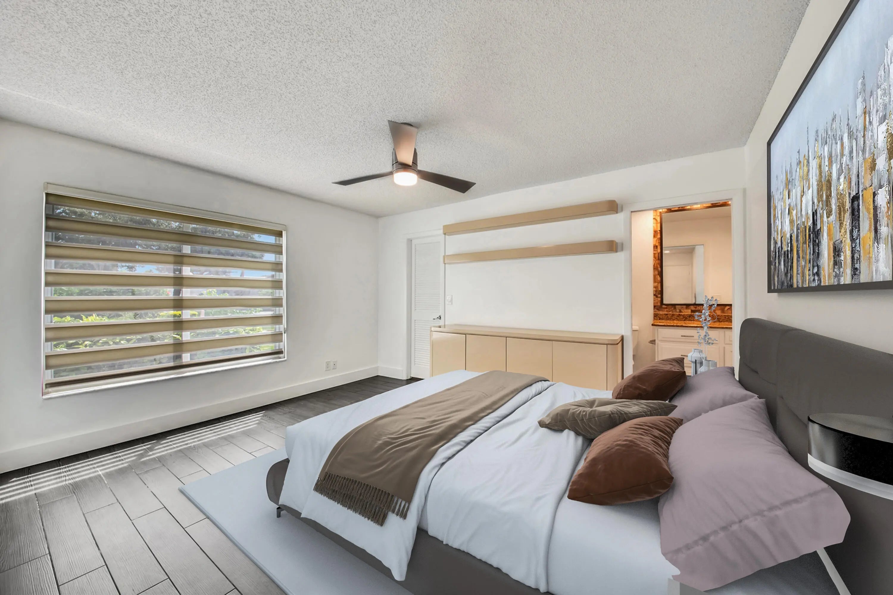Welcome to this exquisite home, perfectly situated on a peaceful cul-de-sac. Step inside to discover an expansive open floor plan featuring smooth wall, high hat lighting, and beautiful wood-like tile flooring throughout. The vaulted ceilings and transom windows create a bright and airy atmosphere. The updated kitchen is a culinary masterpiece, boasting Quartz countertops, Modern European cabinets, a tiled backsplash, stainless steel appliances, a vented hood, and a pantry with pull-out drawers. The spacious great room flows effortlessly into the dining area, ideal for hosting family and friends. This home offers two luxurious master retreats, each with updated baths for ultimate comfort. dditional features include partial impact windows, a garage with epoxy flooring, storage cabinets, and a utility sink for added convenience. Enjoy outdoor living on the large, screen-enclosed patio, perfect for relaxing or entertaining. This home combines modern elegance with thoughtful details for comfortable living in a serene setting.