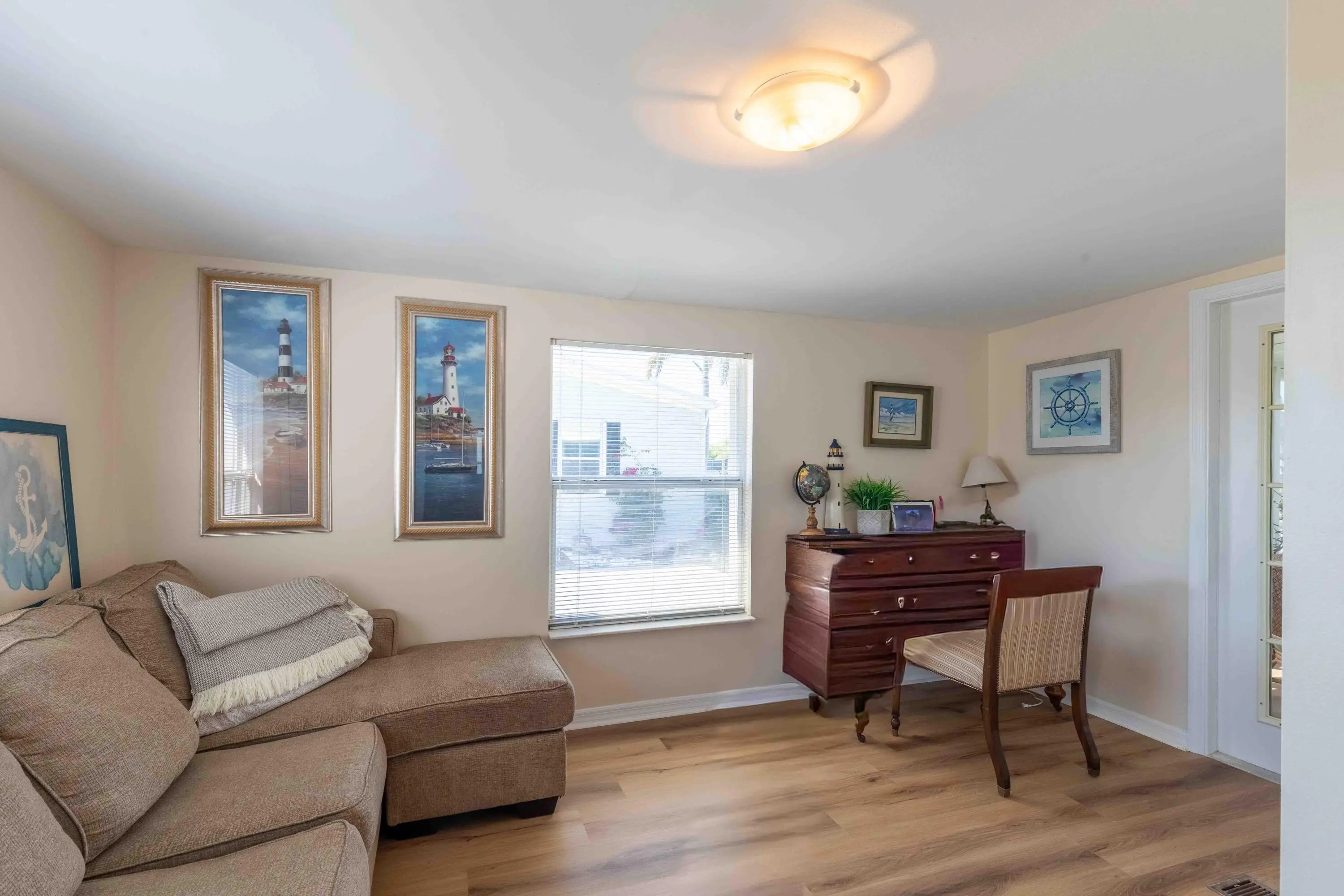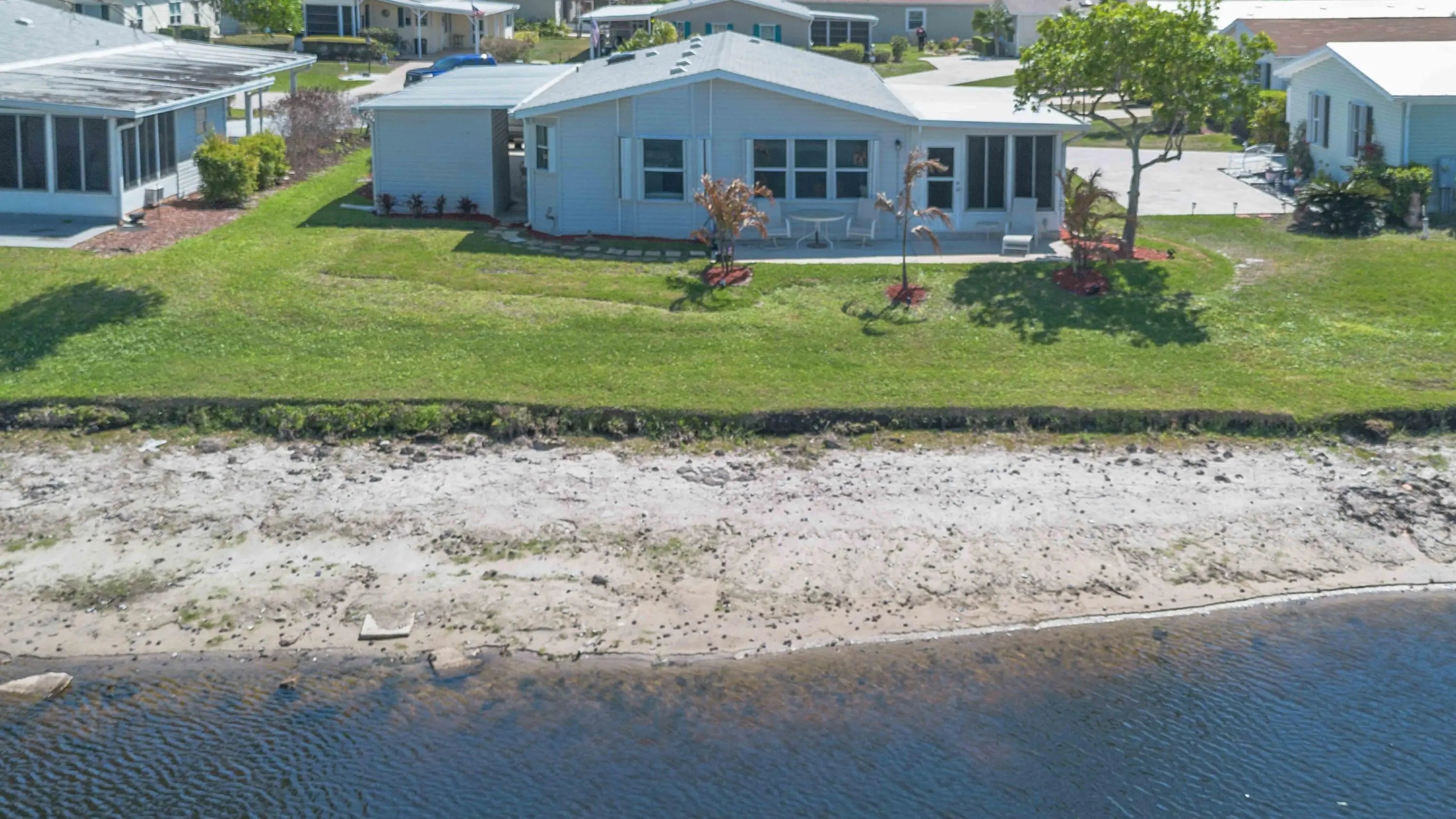 Welcome to your MOVE-IN READY fabulous ALL NEW waterfront home with 2 bedrooms, 2 baths + den/office, enclosed porch, and open patio. New A/C 2025, newer roof, new kitchen, new baths, interior newly painted, all new vinyl flooring, screening and appliances, granite. Accordion shutters. Lake and Savanna views!!! Open patio with beautiful sunsets. OFFERED FULLY FURNISHED. THIS WILL NOT DISAPPOINT!!!! Leased land property.
