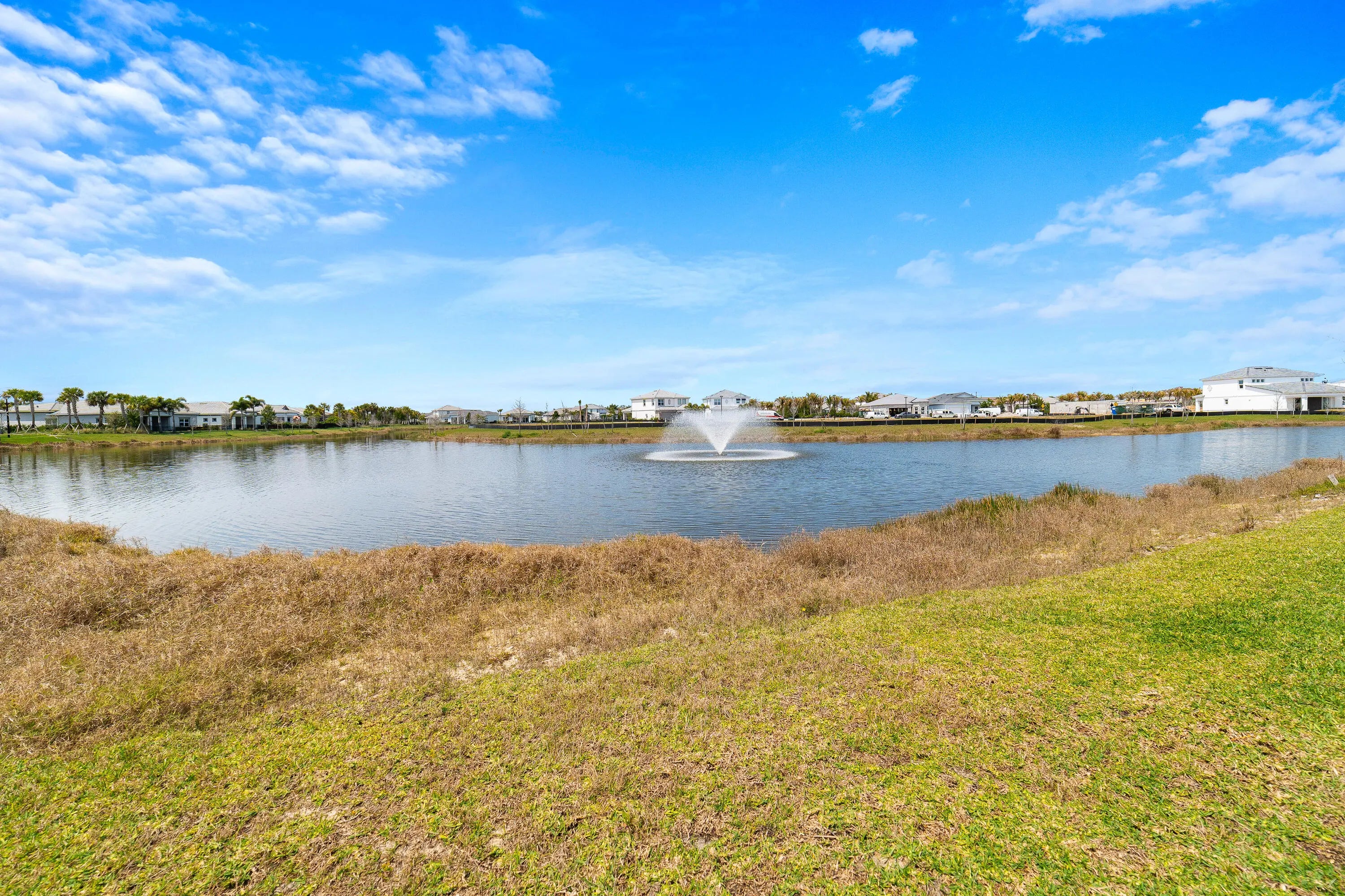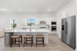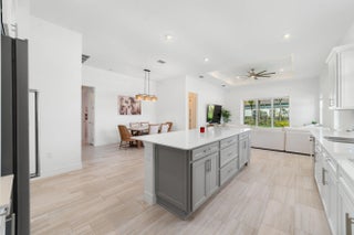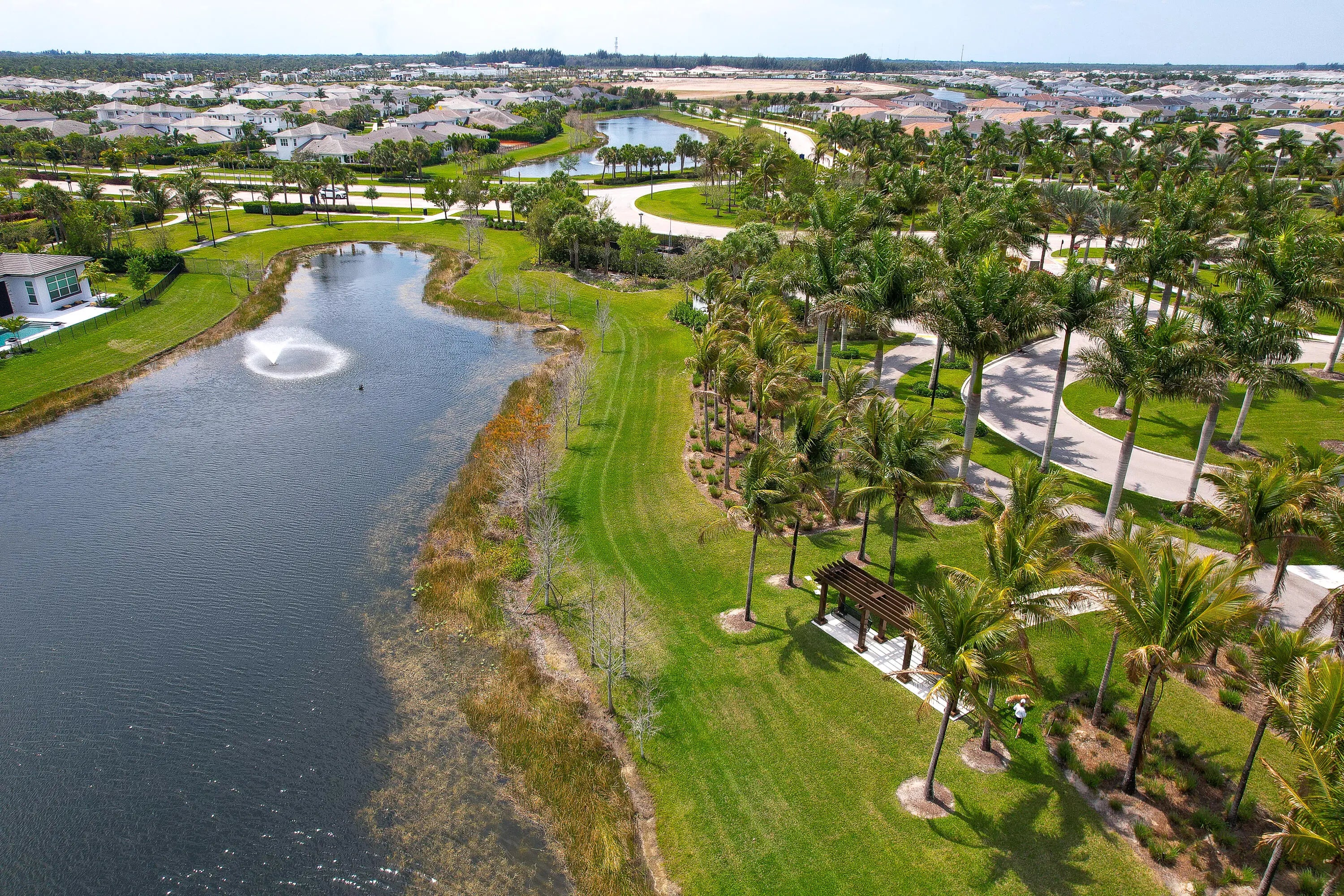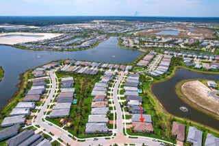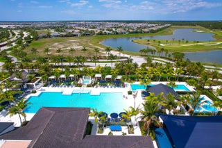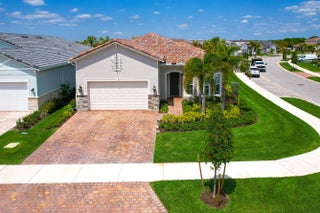 Welcome to the desirable, gated Avenir community. The stunning Mainstay model offers 3 bedrooms plus a den/office and 2 full bathrooms. This home features a builder-upgraded kitchen with stainless steel appliances and an enhanced laundry room. The primary suite and spa-like bath include a builders upgrade with an extended walk-in shower. Situated on a corner lot with partial lake views, it provides ample parking and abundant natural light. Porcelain tile flooring runs throughout, no carpet, complemented by volume ceilings that create an open, airy feel. Additional upgrades include modern lighting, a pool hookup, and a gas line for a future summer kitchen. The community offers a clubhouse, fitness center, resort-style pool, lap pool, pickleball and tennis courts, and a children's park, all within a 24/7 gated setting. HOA includes amenities, lawn care, and security.