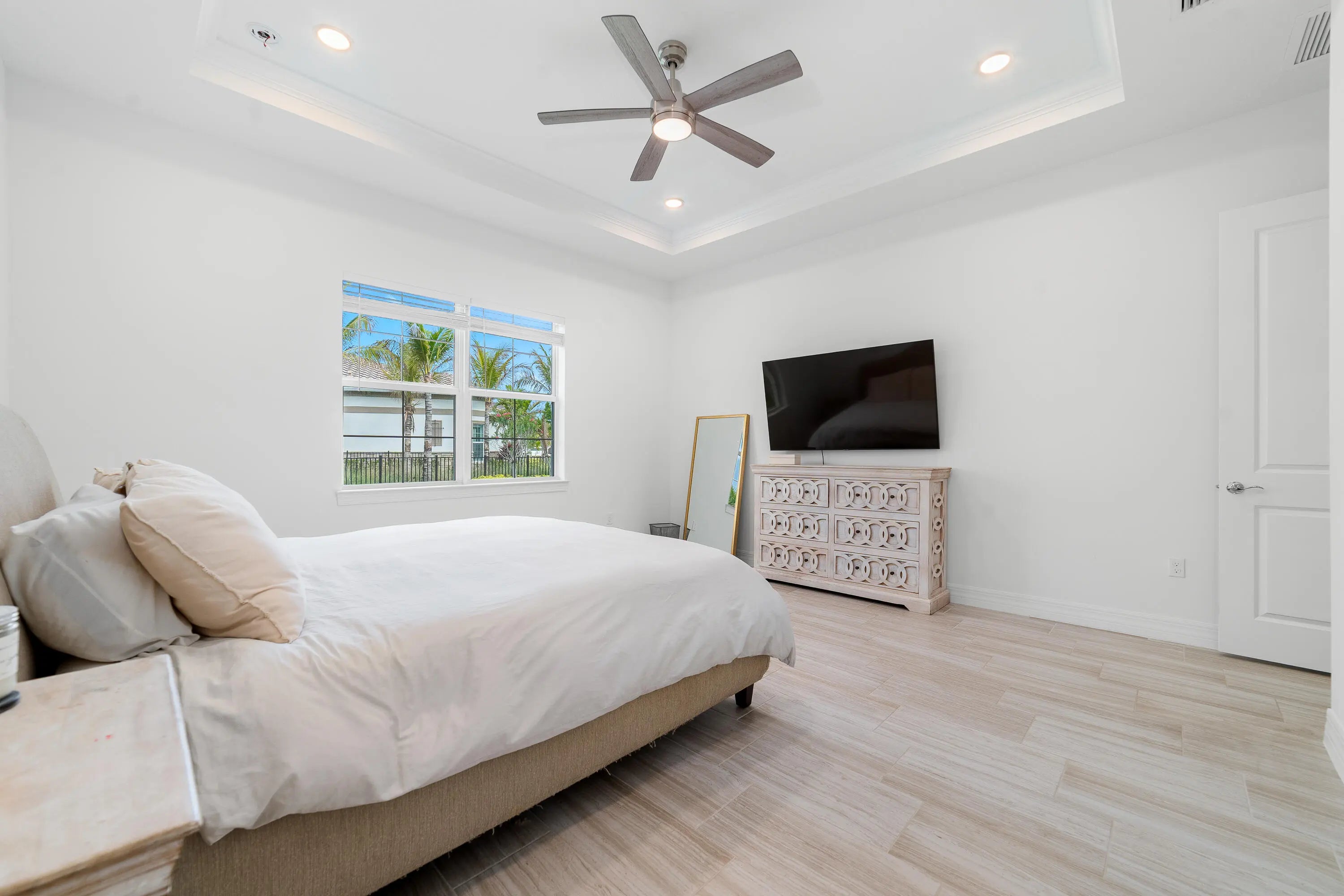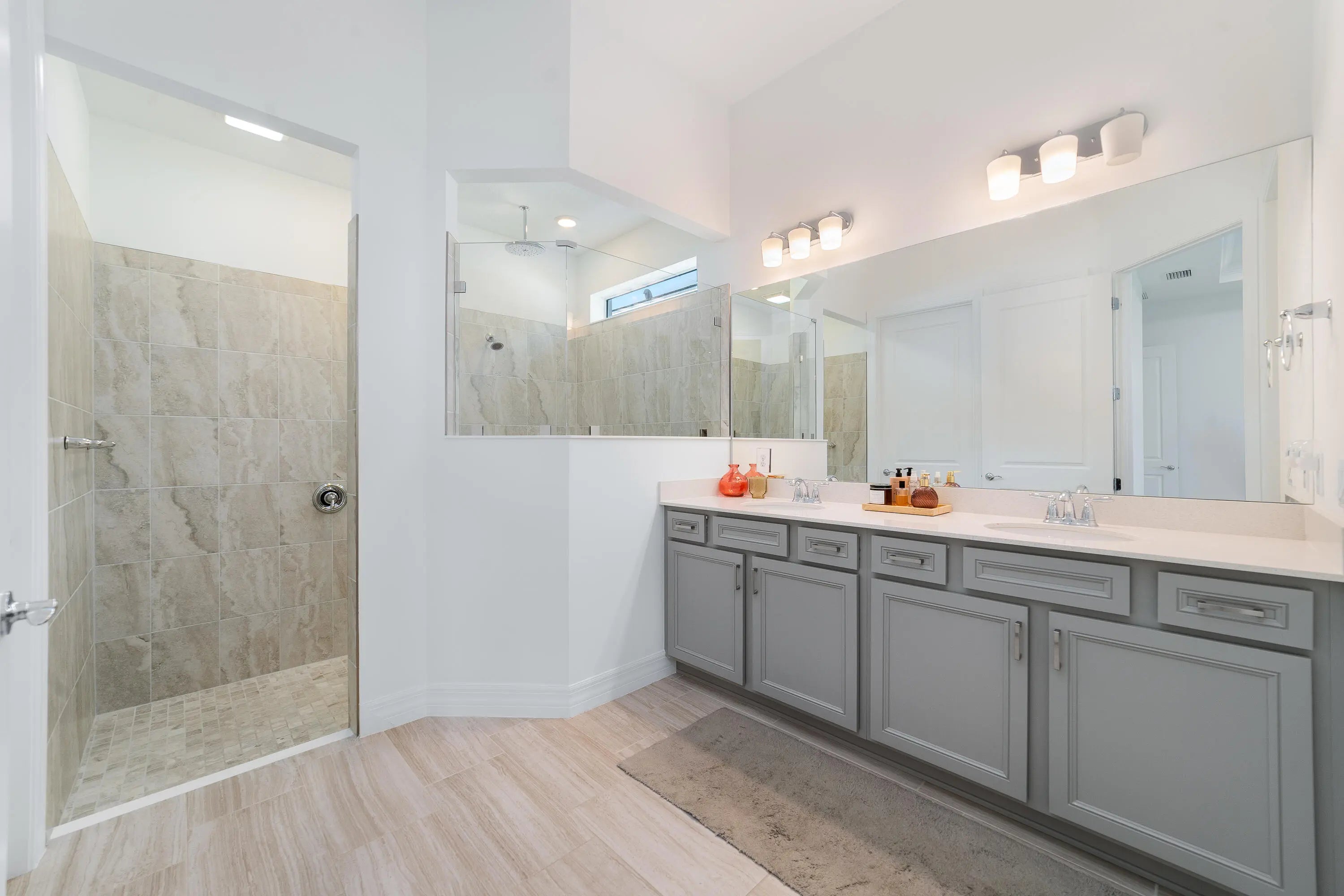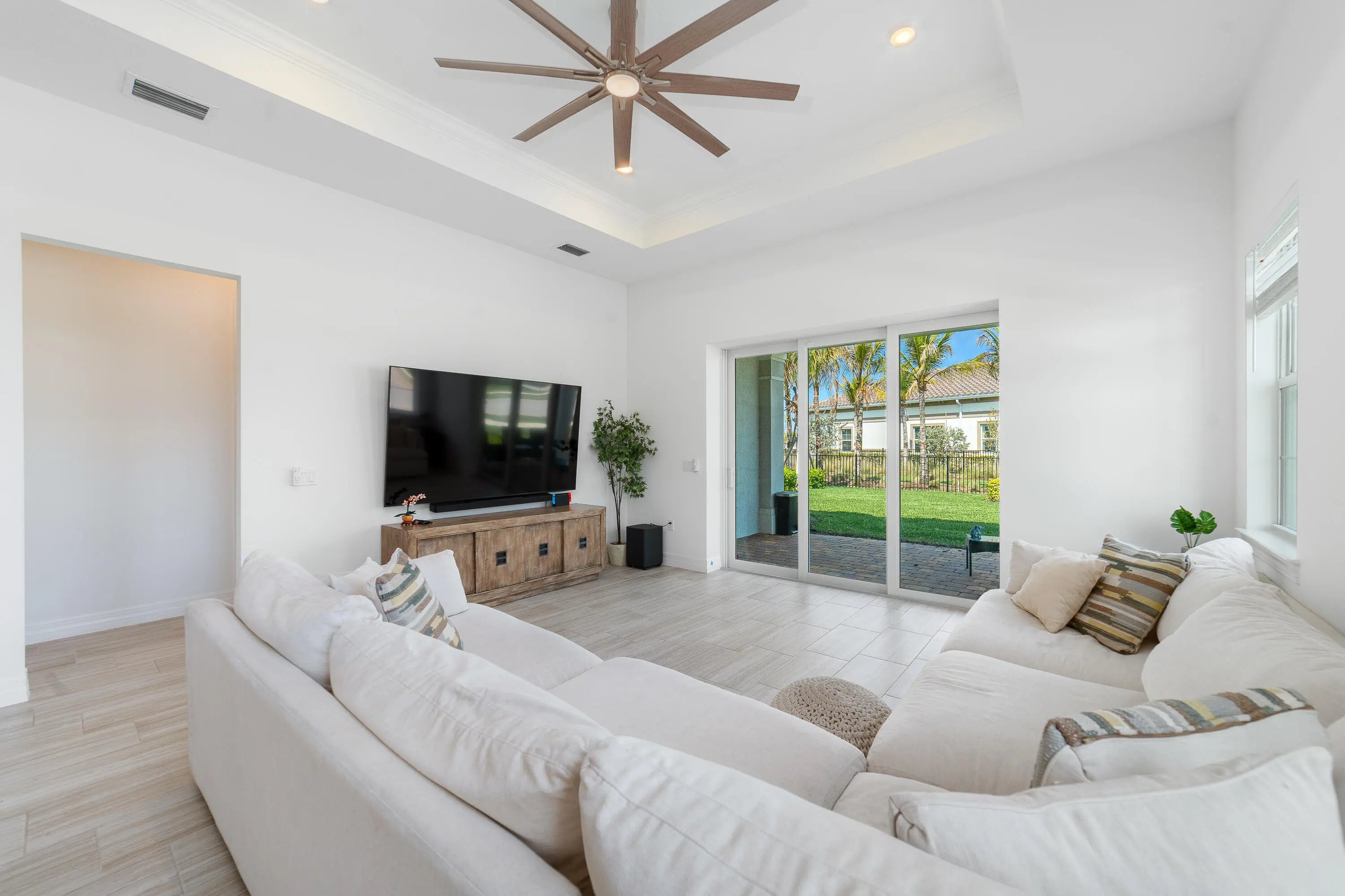 Welcome to the desirable, gated Avenir community. The stunning Mainstay model offers 3 bedrooms plus a den/office and 2 full bathrooms. This home features a builder-upgraded kitchen with stainless steel appliances and an enhanced laundry room. The primary suite and spa-like bath include a builders upgrade with an extended walk-in shower. Situated on a corner lot with partial lake views, it provides ample parking and abundant natural light. Porcelain tile flooring runs throughout, no carpet, complemented by volume ceilings that create an open, airy feel. Additional upgrades include modern lighting, a pool hookup, and a gas line for a future summer kitchen. The community offers a clubhouse, fitness center, resort-style pool, lap pool, pickleball and tennis courts, and a children's park, all within a 24/7 gated setting. HOA includes amenities, lawn care, and security.