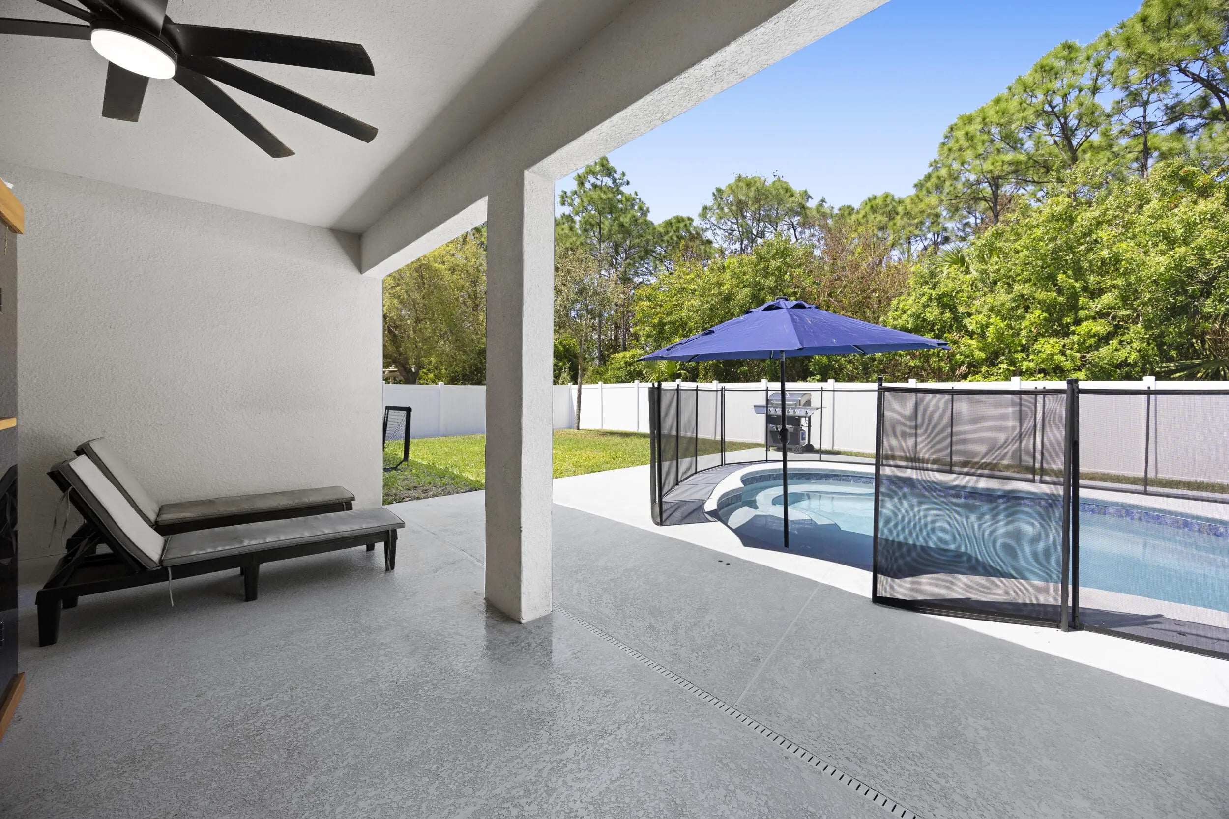 A stunning 2020-built home featuring 4 bedrooms plus a den, offering the perfect blend of style and functionality. Enjoy low energy costs with 41 solar panels. The open-concept layout showcases high ceilings, abundant natural light, and modern finishes throughout, including a gourmet kitchen with quartz countertops and ample prep space. Step outside to your private backyard oasis with a custom pool featuring a sun shelf, umbrella holder, heater, and chiller, all within a fully fenced yard and no rear neighbors for added privacy. Additional highlights include shiplap accents, epoxy garage floor, whole-home water filtration system, full sprinkler system, gutters, and double-pane windows.