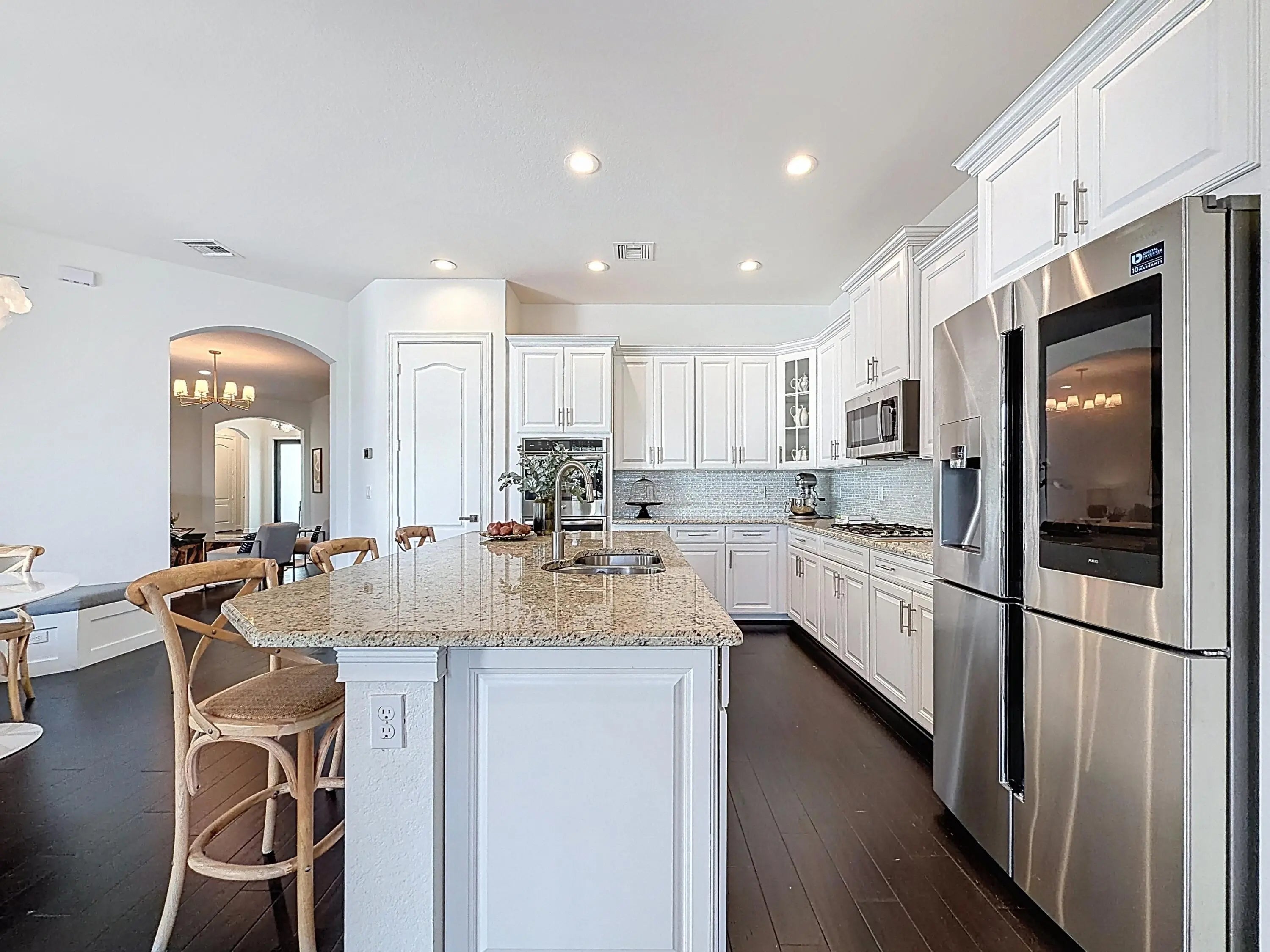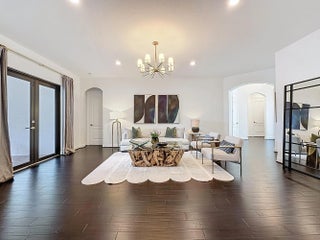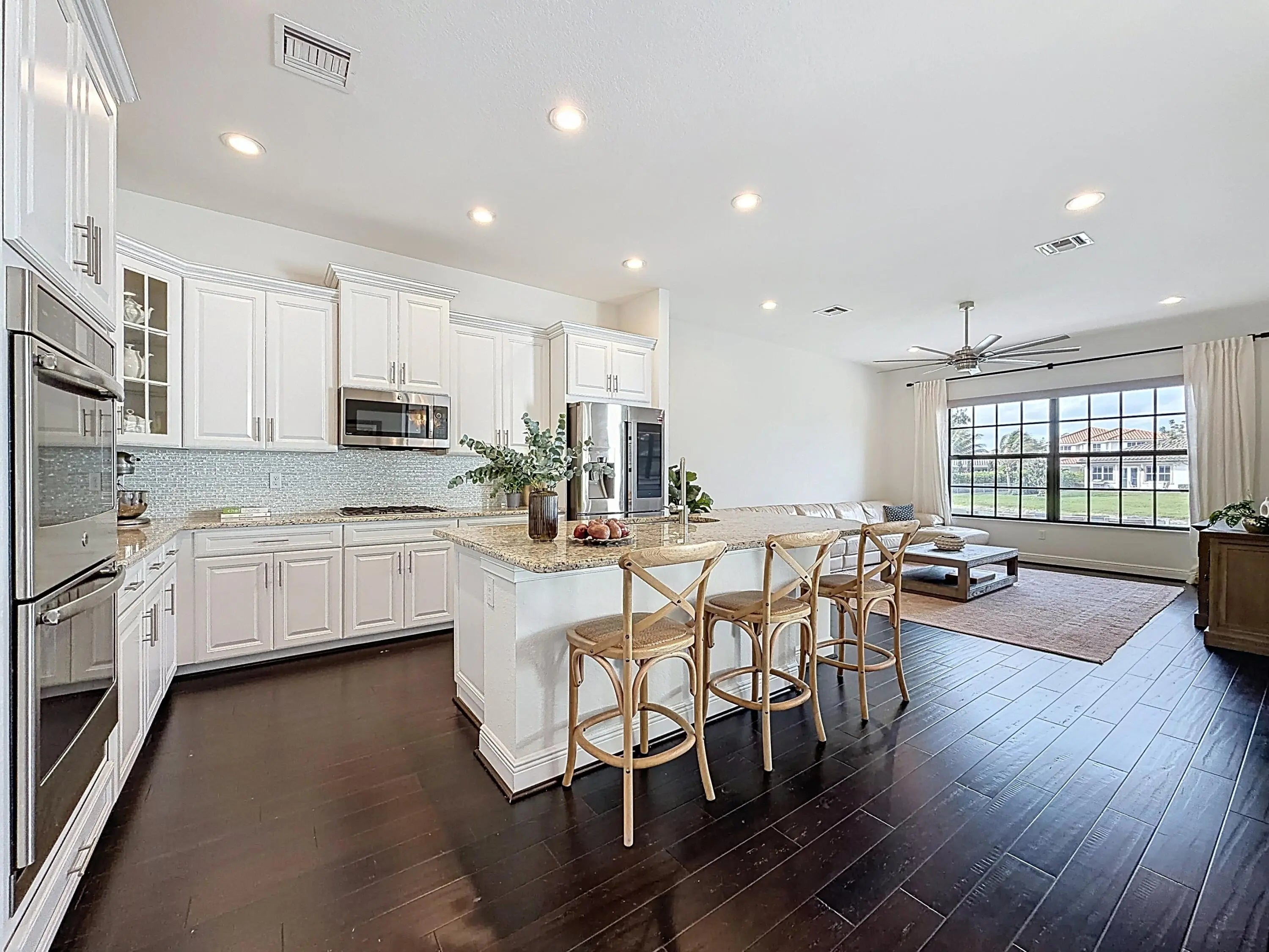 Rarely available turnkey one-story Cumberland model featuring 4 bedrooms, 3 baths, and a 3-car garage with over 2,900 sq ft under air on a premium waterfront lot. This beautifully maintained home offers impact windows and doors, gas service, and a desirable tri-split floor plan. The chef's kitchen includes granite countertops and stainless steel appliances, complemented by wood flooring throughout. Enjoy a formal dining area ideal for entertaining and a spacious patio perfect for relaxing. The expansive primary suite features a sitting area, custom walk-in closets, and a luxurious bath with separate vanities, shower, and Jacuzzi tub. Resort-style amenities, 24-hour guard gate, A-rated schools, and HOA landscaping included.