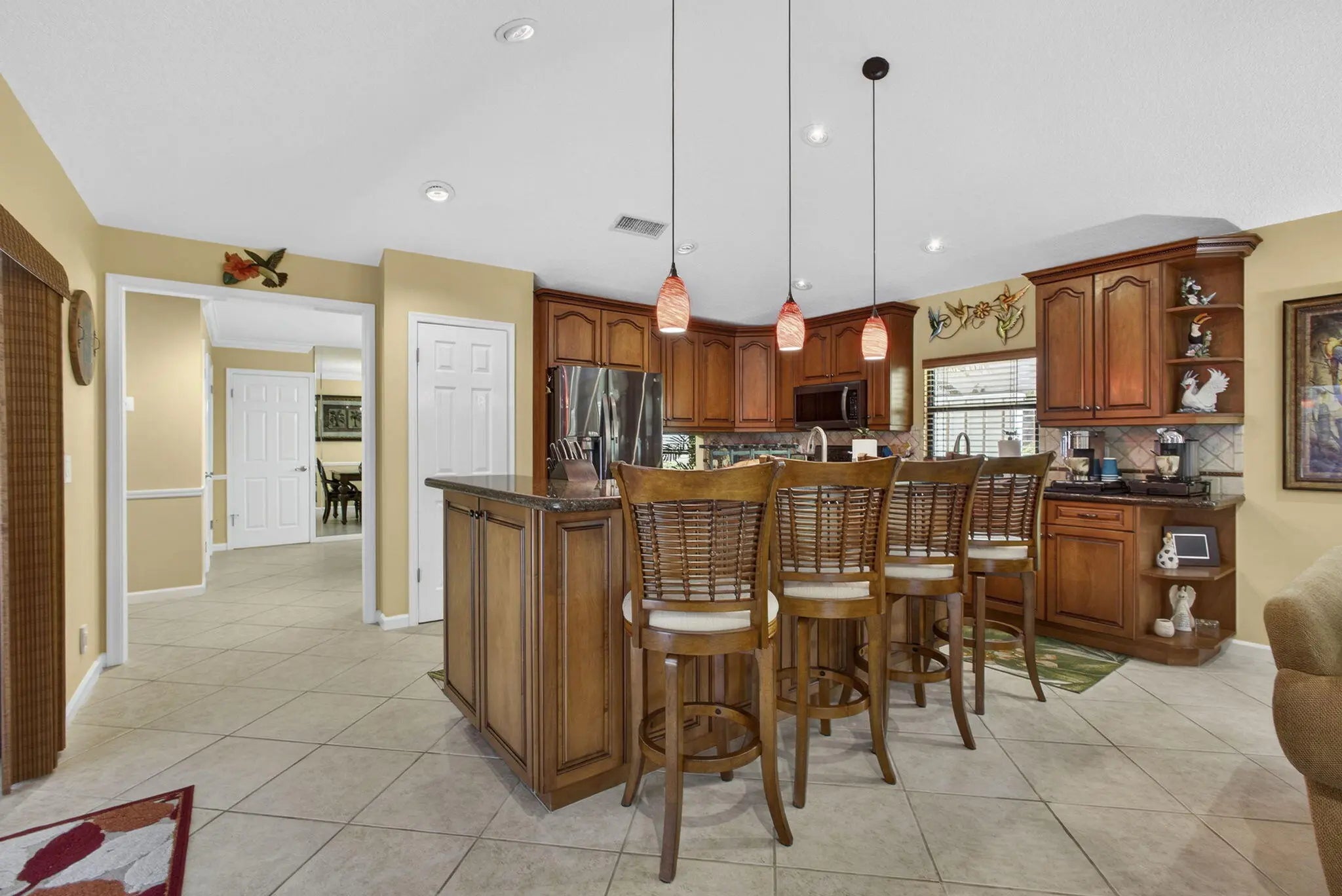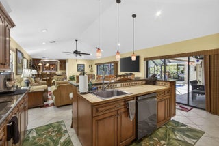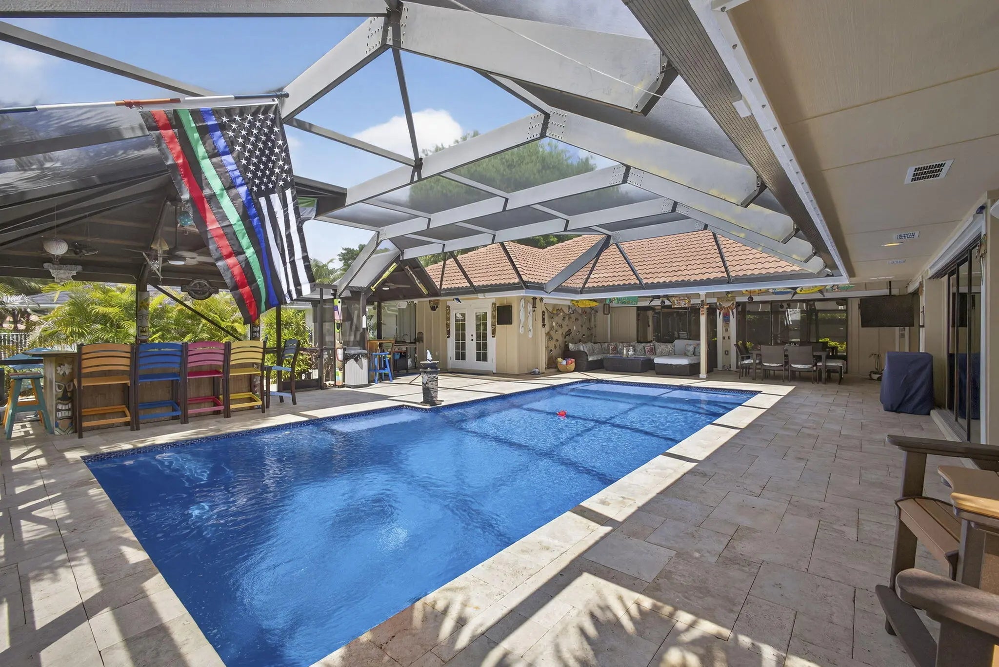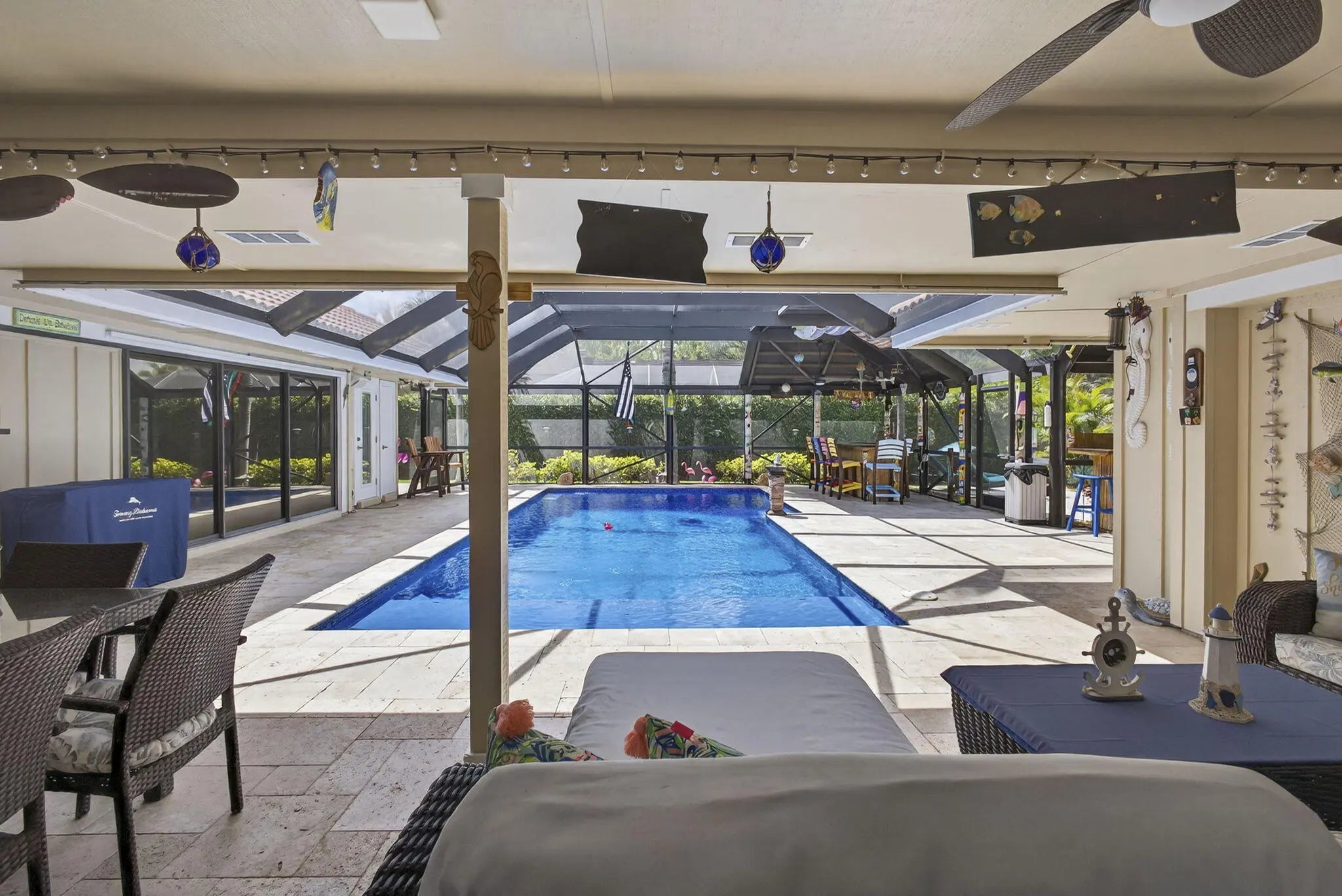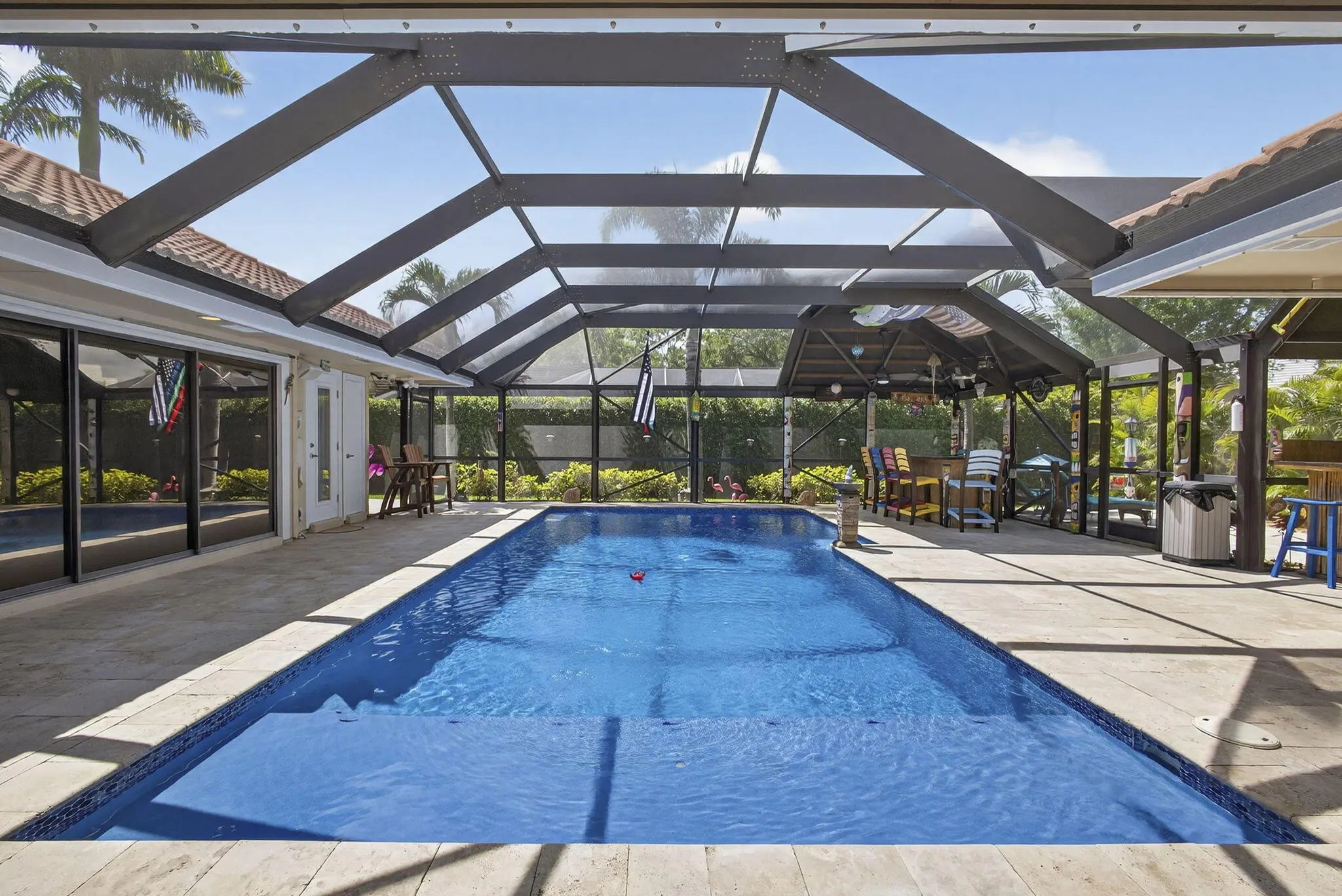 Welcome to 9 Kintyre Road, a beautifully updated custom pool home located in the sought-after Glenngary community within PGA National. This former builder's residence offers 3 br, 2.5 ba, over 2,300 sqft of living space, designed for both comfort and entertaining. Step inside to an open floor plan highlighted by vaulted ceilings, a spacious great room, and a custom-built bar with wine fridge—perfect for hosting. The updated eat-in kitchen features granite and butcher block countertops, maple cabinetry, stainless steel appliances, dual sinks, and a large island with ample storage. Pocket sliding glass doors create seamless indoor-outdoor living, opening to a private, resort-style backyard. Enjoy a screened-in saltwater pool with sun deck, custom tile work, & an expansive patio finished.. with elegant marble pavers—ideal for relaxing or entertaining year-round. Additional highlights include a formal dining room, split-bedroom layout, attached 2-car garage, and a prime location within a gated golf community offering world-class amenities. Built in 1984 and situated on a generous lot, this home combines timeless design with modern upgrades in one of Palm Beach Gardens' most desirable neighborhoods.