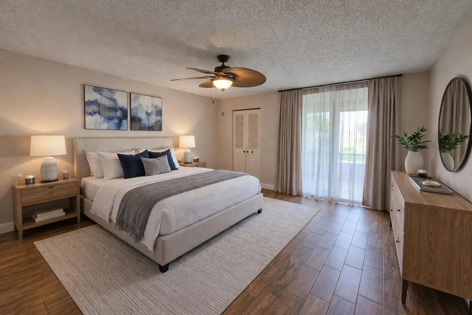 Remodeled 2BR/2BA 1st-floor condo w/ serene lake views in desirable Palm Lakes 55+. Spacious layout features large kitchen, newer appliances & in-unit full-size Washer/Dryer. Wood-look plank tile thru-out, no carpet. Primary suite features large walk-in closet & custom enlarged shower. Updated bath. Oversized screened & tiled patio, fenced patio entry, and extra storage room. New roof (assessment paid). Assigned parking in front plus ample guest parking. Newer A/C. Water, trash, sewer, pest control, basic cable w/HBO included in Assoc fee. Active community: 2 pools, clubhouse, fitness room, tennis, pickleball, sauna & more. Pet friendly (2). Close to shopping, dining, highways & Coral Square Mall, approx. 10 miles to beach. Min credit 650, income $40K. Rentals OK after 1 yr.