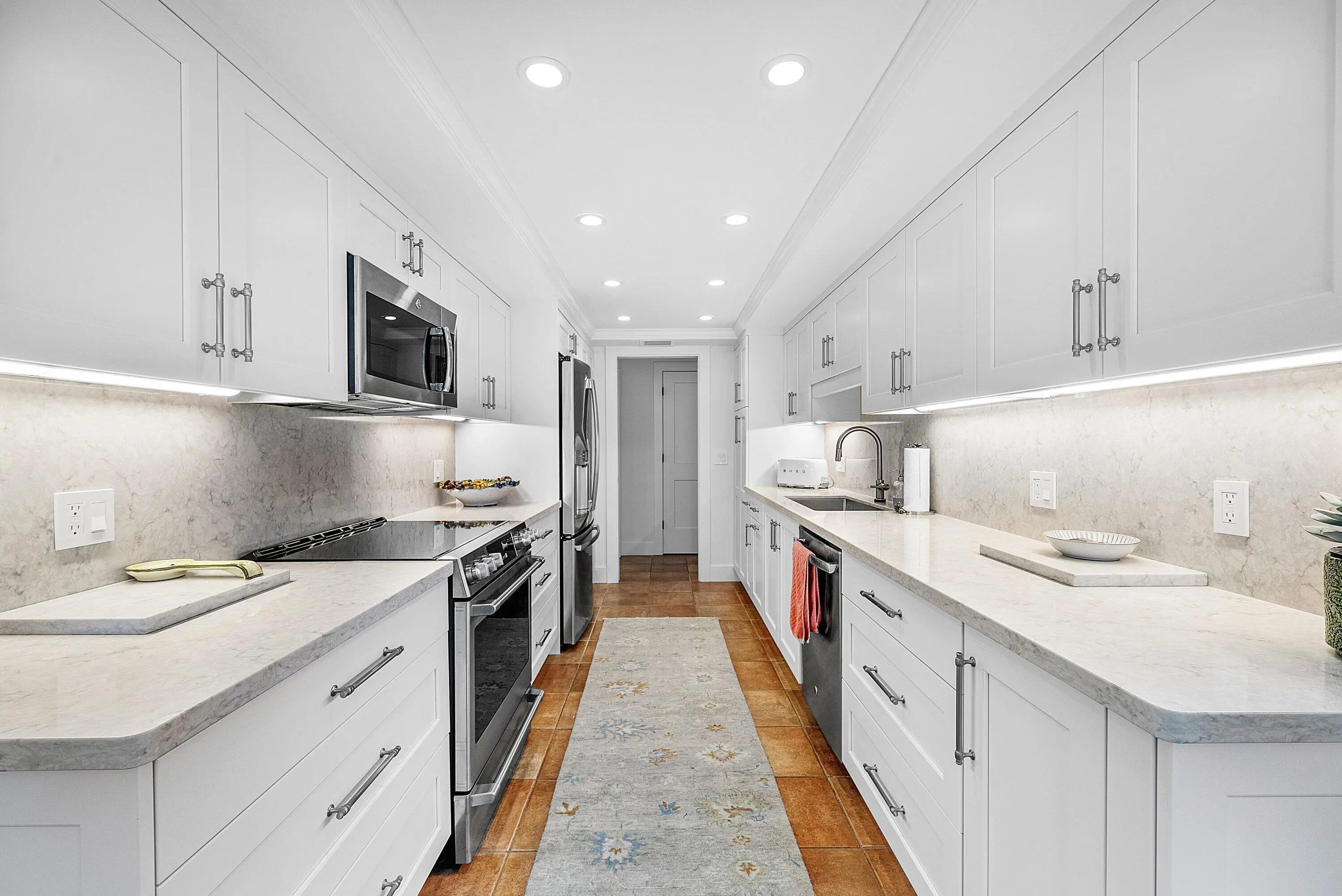 Move right in to this renovated 2BR + DEN & 2BA split-plan has south facing views of the ocean, Intracoastal, gardens & pool area. Inside this spacious floor plan you'll find excellent workmanship and beautiful detail. The galley style kitchen has white custom cabinetry, stainless steel appliances & a breakfast room offering stunning views. The primary bedroom is light & bright with 2 custom walk-in closets. The primary bathroom been redesigned using stylish porcelain and offers a large walk-in shower, tub & custom cabinetry. The guest suite & den provide privacy and comfort for family and friends. Carlton Place is a luxury oceanfront complex with a manned gatehouse, newly renovated fitness area & pool, hot tub and BBQ area, beach pavilion with lounge chairs & umbrellas & 2 Garage Spaces