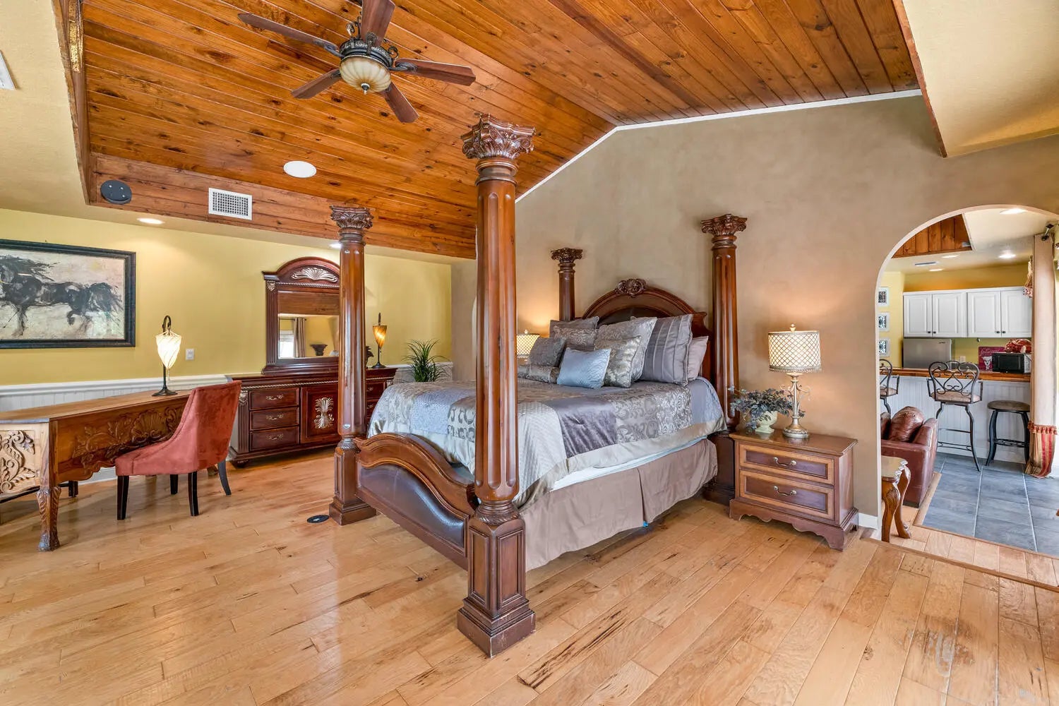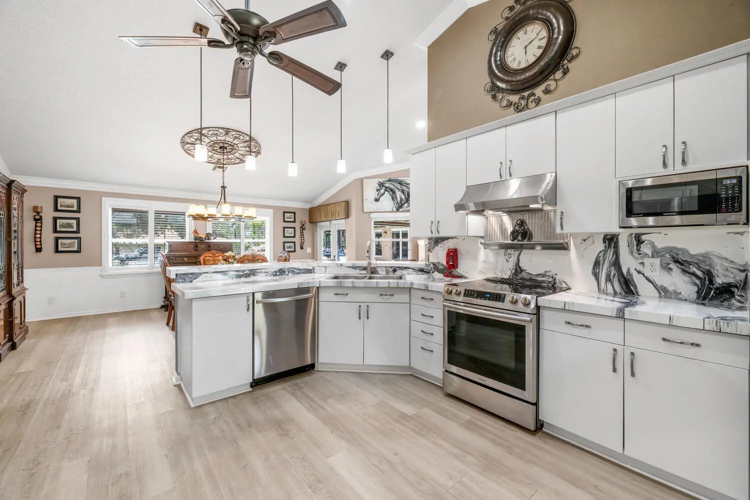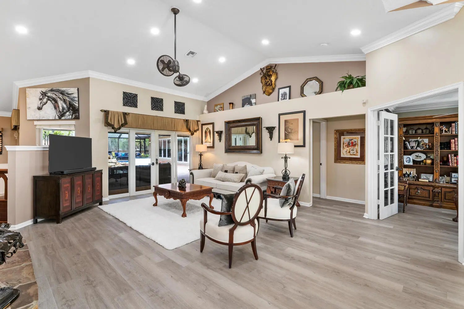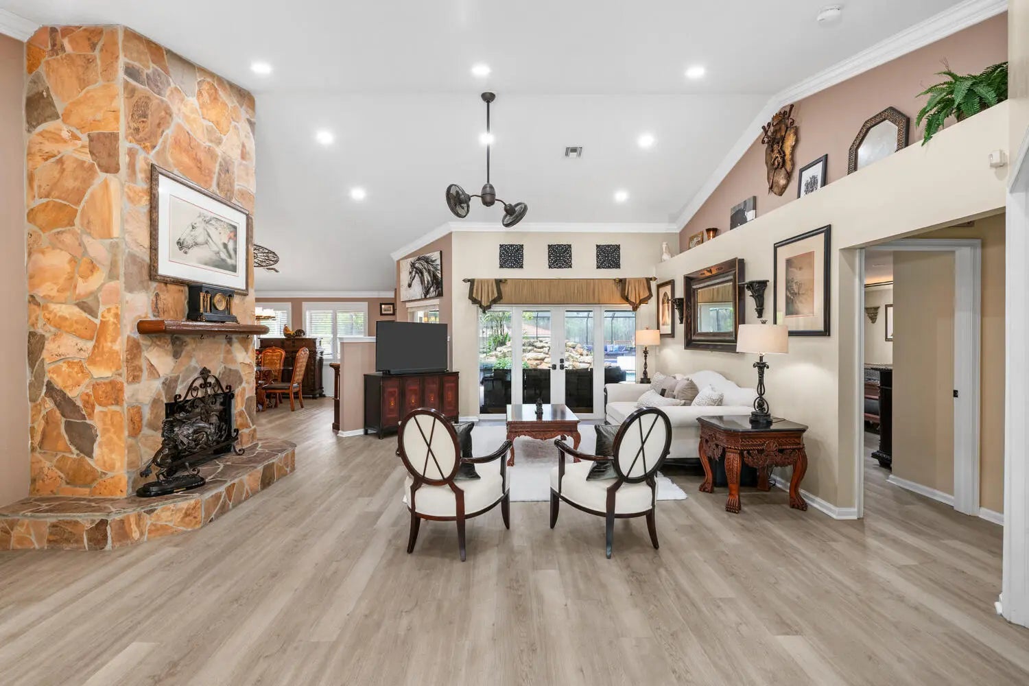 Nestled on 5 pristine, fully fenced acres in the exclusive gated equestrian community of Deer Run. This exceptional property offers the perfect blend of family living and premier equestrian amenities. The beautifully updated main residence features 3 bedrooms plus large office (can be 4 bedrooms), 2 bathrooms, and a 2+ car garage, showcasing new flooring, renovated bathrooms, and a spacious, open-concept layout. A large kitchen flows seamlessly into the expansive family room, complemented by a formal dining space ideal for entertaining. Step outside to an oversized screened patio overlooking a stunning pool with a waterfall feature and fire pits—creating a true private oasis. A fully equipped 1-bedroom, 1-bathroom guest house with full kitchen and impact glass provides the perfect space for visitors, staff, or rental income potential. This property has been thoughtfully upgraded for efficiency and peace of mind, including new hurricane impact double front doors, new house roof (2025), top of the line Bora Steel tile roof with cooling insulation and 225 wind mitigation, updated pool and irrigation pumps (2025), new AC (2025), and a whole-farm generator supported by two underground propane tanks (1,000 and 500 gallons). The home also features a top-of-the-line reverse osmosis water system and remarkably low monthly electric costs. Equestrians will appreciate the professionally designed 5-stall center aisle barn with an oversized 14-foot aisle. Barn features a tack and feed room with washer/dryer, fly spray system, fridge/freezer, easy fill water system for each stall, and stall runouts. Additional features include four covered tack-up areas, a CBS manure bin, storage shed with electric, and a resurfaced driveway (2025). A new wraparound deck (2024) overlooks the barn, perfect for relaxing or entertaining after a ride. Ideally located less than one mile from White Fences Equestrian Center, riders can easily access schooling and recognized shows year-round. Gate access at rear of property leads to miles of scenic trail! Located just 4 miles to local shopping, and only 13 miles from Wellington International and Global Dressage Festival. This is a rare opportunity to own a turnkey equestrian estate in one of South Florida's most desirable riding communities.