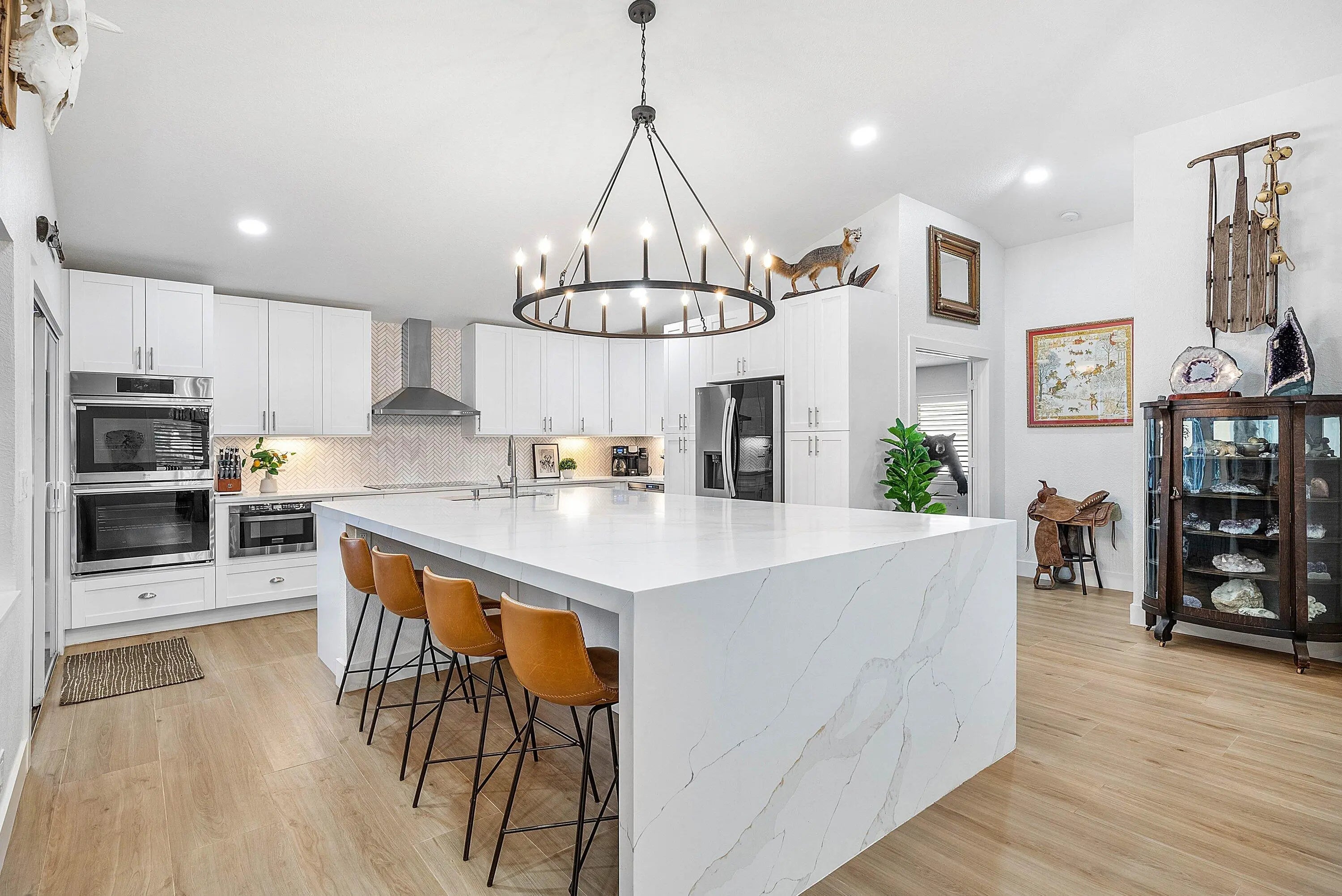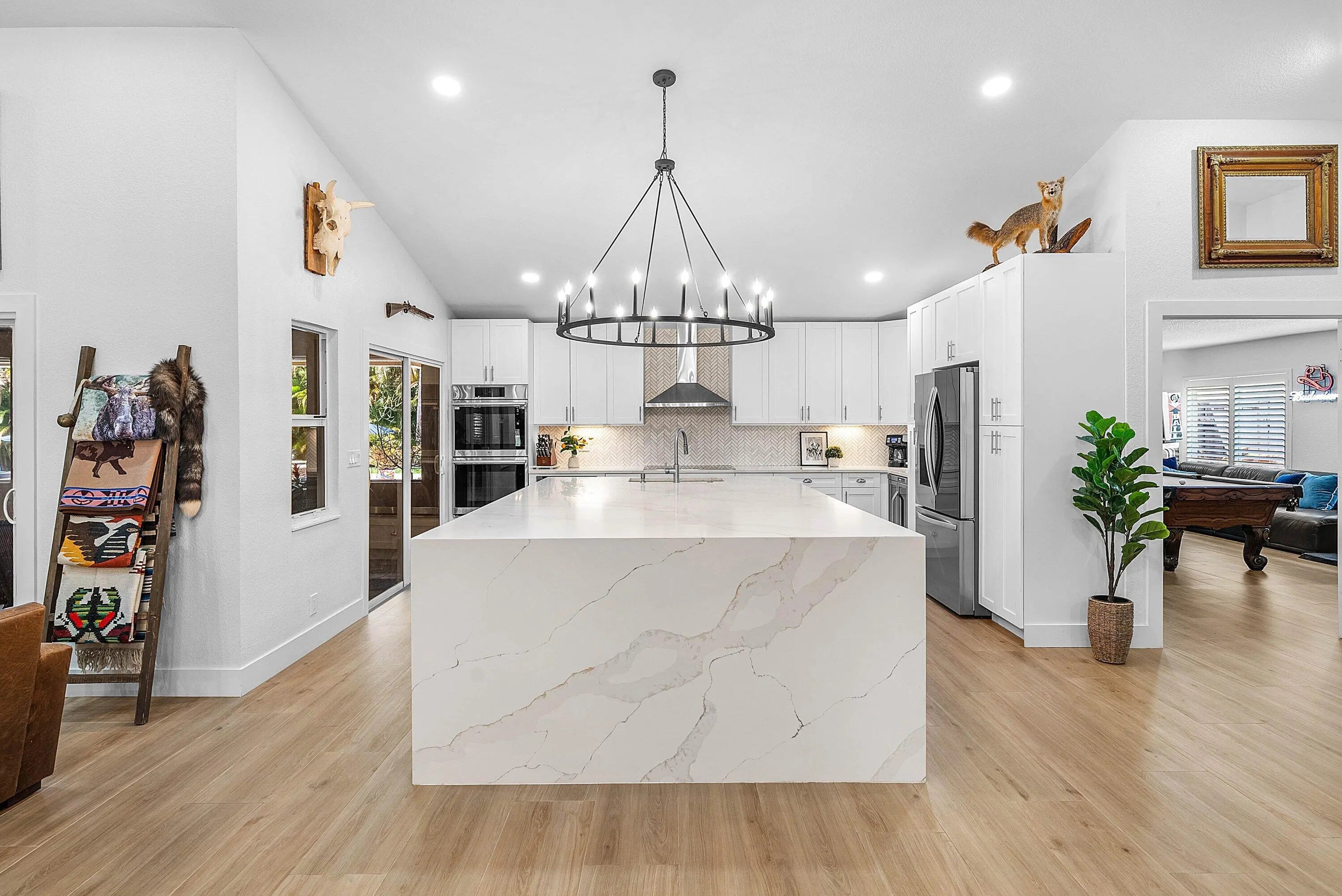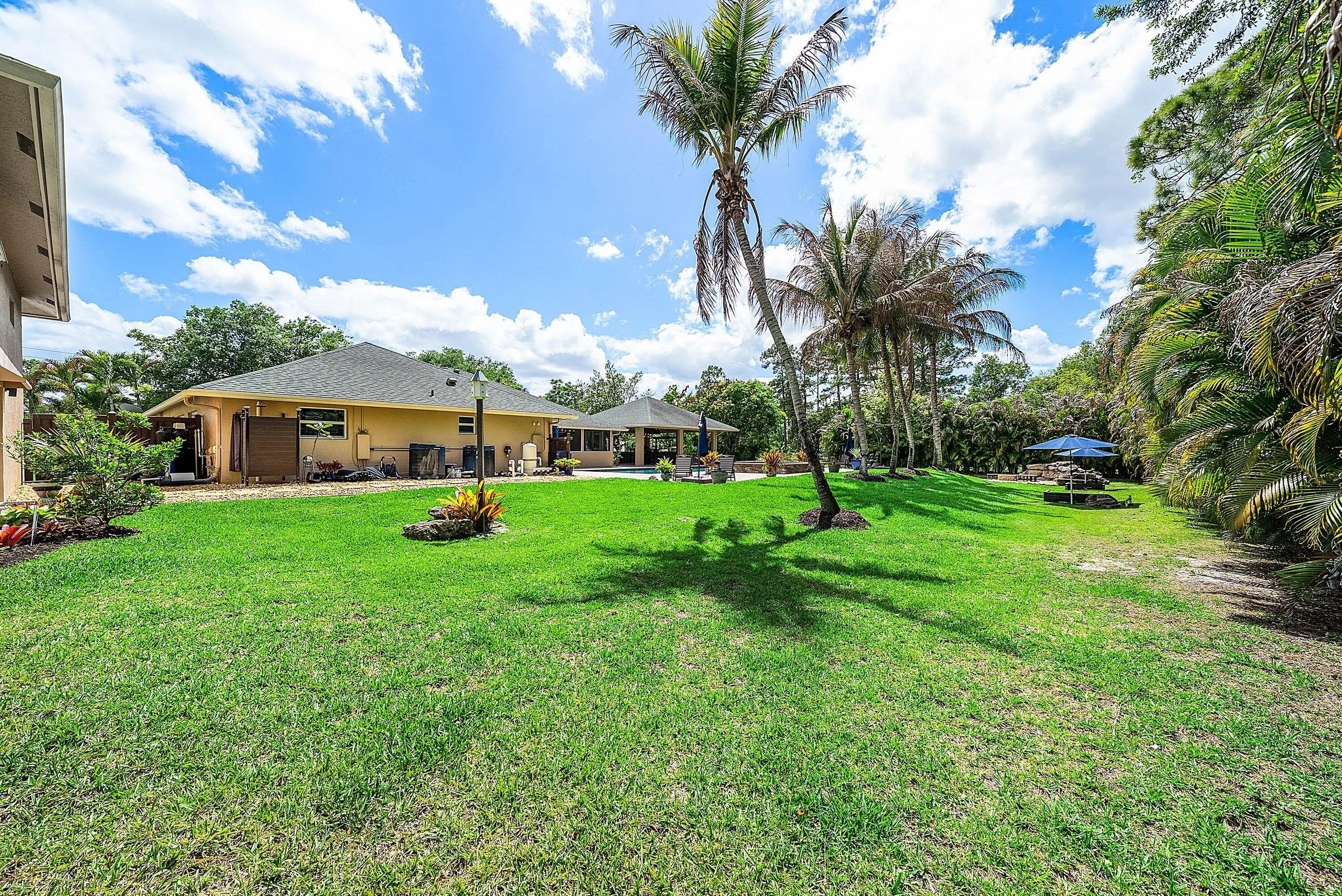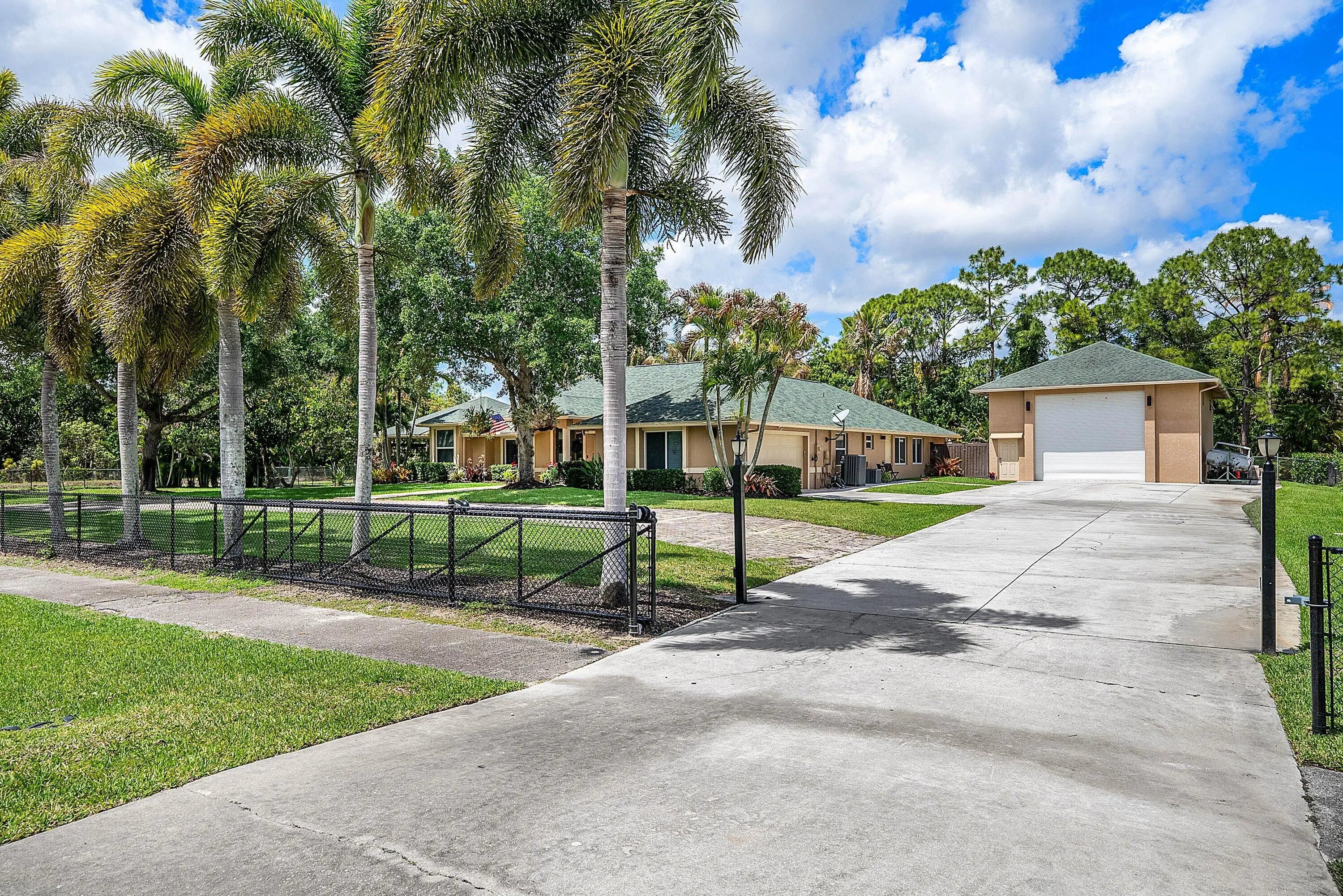 Elevated, ESTATE HOME appointed with every high-end feature you can think of! Completely remodeled and reimagined in 2023/2024! Premium, 1.37acre lot bordered by canal and on a PAVED ROAD! 4 bedrooms, 3 baths, 2 car garage + 1,200 CBS GARAGE/WORKSHOP + POOL/SPA and 725sq ft GAZEBO! 2019 ROOF. Completely fenced property w/ circular driveway and (2) gates for easy ingress/egress. Everything is NEW inside making this a ONE-OF-A-KIND property! Custom glass double IMPACT door entry greets guests as they walk into soaring ceilings and an open concept floor plan. Great room is impressive with floor-to-ceiling stacked stone fireplace. Porcelain wood-plank flooring throughout. Dining room is substantial with room to seat 12+. You will notice thoughtfully chosen details like custom lighting, LED recessed cans, new doors/millwork and neutral on-trend finishes are sure to please anyone. Plantation shutters and IMPACT WINDOWS AND DOORS throughout. Gathering kitchen is a WOW factor with huge 10 ft. island, bar seating for 8 and finishes second to none! Calcutta Quartz counter tops w/ waterfall edge, white shaker style cabinetry, herringbone marble backsplash, undercabinet lighting, deep single bowl sink, 6 burner cooktop, pantry w/ roll-outs, double oven and commercial-style drink/wine fridge. Finally, the kitchen of your dreams and the heart of the home . Primary bedroom is private w/ walk-in custom closet & incredible spa-like bathroom. Freestanding soaking tub, lighted vanity space, double sinks w/ hotel style backlit mirrors, shaker-style cabinetry, Quartz counter tops and dramatic walk-in shower w/ frameless glass enclosure. Adjacent to primary bedroom is the 4th bedroom or office/den. 3rd bedroom is private w/ custom closet and adjacent bath with same quality finishes as the primary. Tucked away but still easily accessible is a guest wing of the home that can stand alone as a guest house/mother-in-law quarter. Features its own entrance, additional living room and full kitchen remodeled to perfection. Additional secondary bedroom feels like a 2nd primary suite including a large walk-in closet and "cabana" door leading out to the pool and yard. En-suite remodeled bath w/ double sinks and large shower complete with high-end touches. Laundry room features built-in cabinetry, deep sink and front-loading washer/dryer. Adjacent 2 car garage is finished with "diamond cut" epoxy flooring. The property is an oasis and must be seen to appreciate! Mature trees, orchid garden, Koi Pond, boulder enhanced fire pit, horseshoes, screened & covered patio + 700 sq ft CBS gazebo is the perfect space for quiet time, cozy family gatherings, entertaining during game time or simply enjoying Florida living at its best! Huge, heated pool & spa for 12 makes this truly a resort-style retreat. Featuring a 1,200 SQ FT (40X30) detached garage/workshop/storage building on its own electrical meter! Built for maximum storage including a second story loft. Workshop is built out with custom shelving, tool storage, ample electric, huge commercial fan, impact windows, motorized 16ft door, dedicated concrete driveway with extra side storage for trailer/additional vehicles & RV HOOKUP. Incredibly rare to have a CBS detached garage built to the same quality as the main house. Bring your toys, pets, business, hobbies and large family - all can be accommodated at this property. No HOA! An oasis in the country but close to everything! Easy commute as it's steps away from Northlake and the Beeline. Convenient and close to all the new Avenir shops and restaurants open now and more opening in 2026!