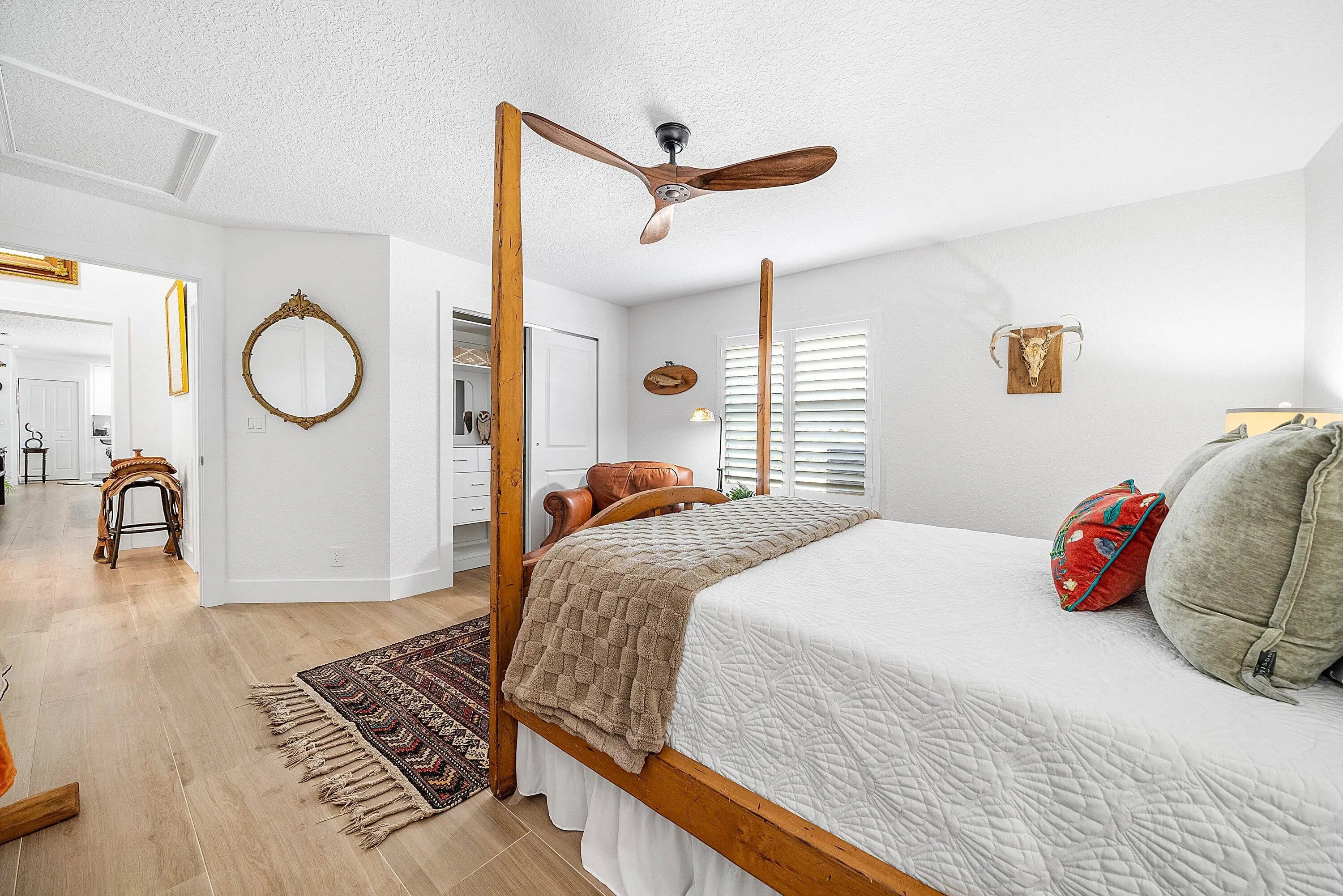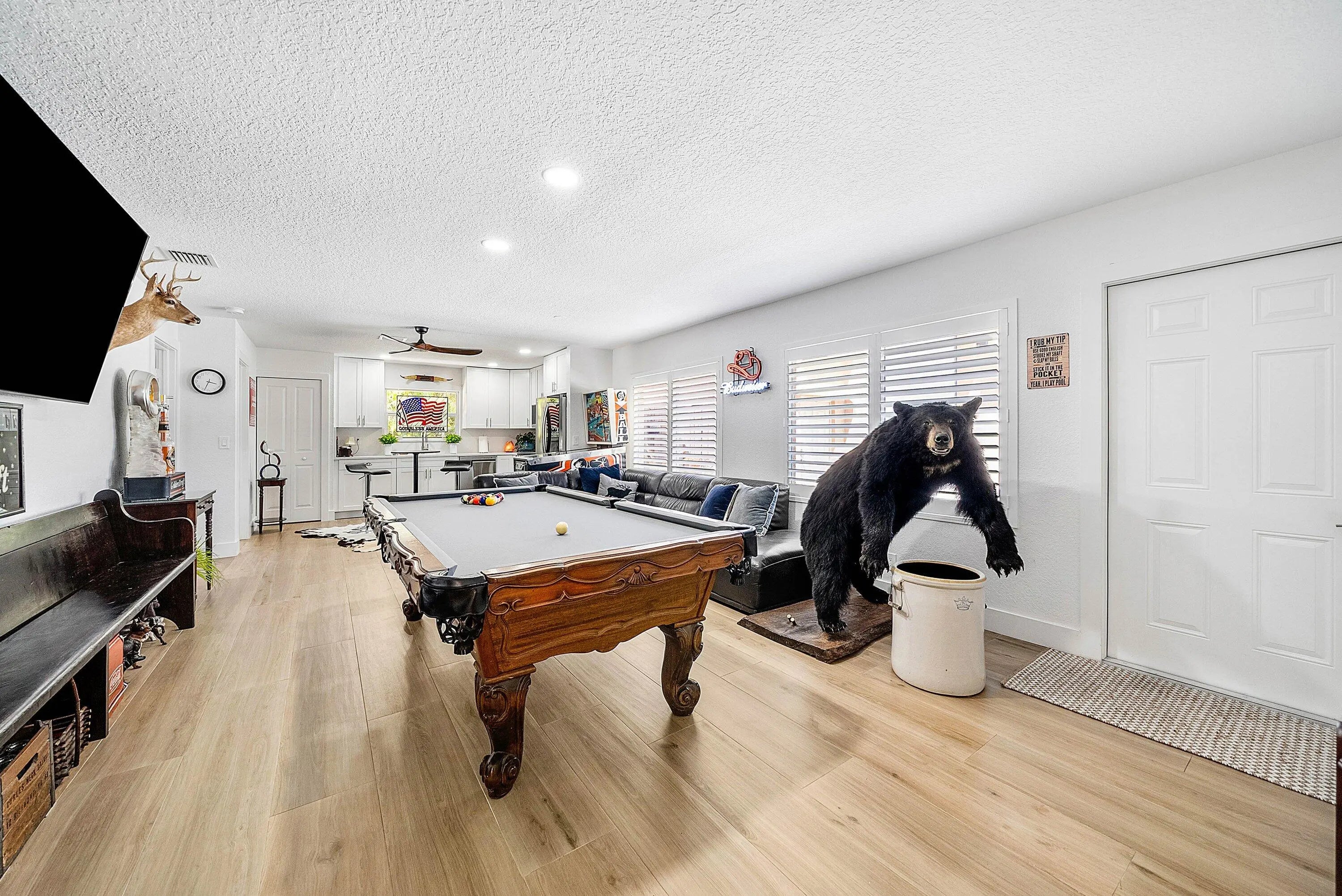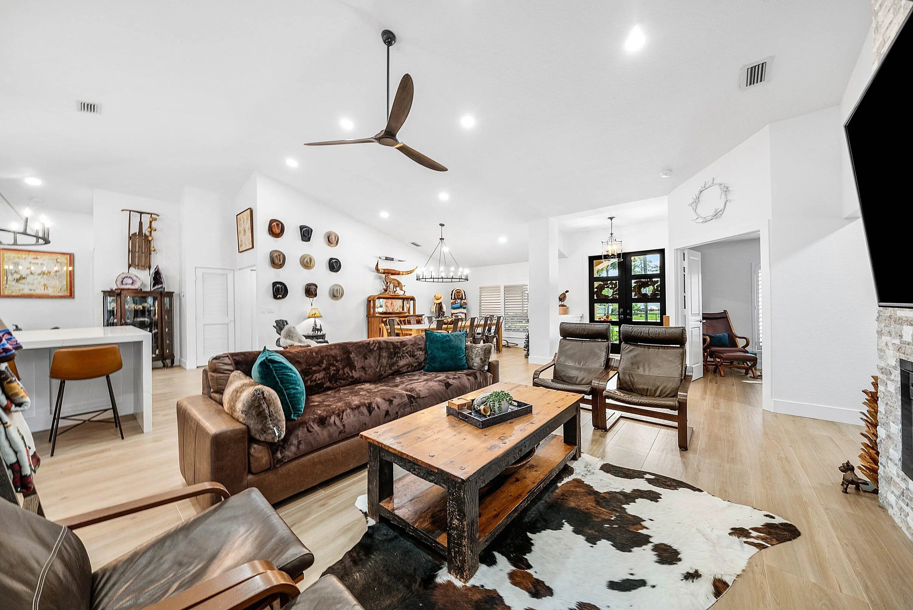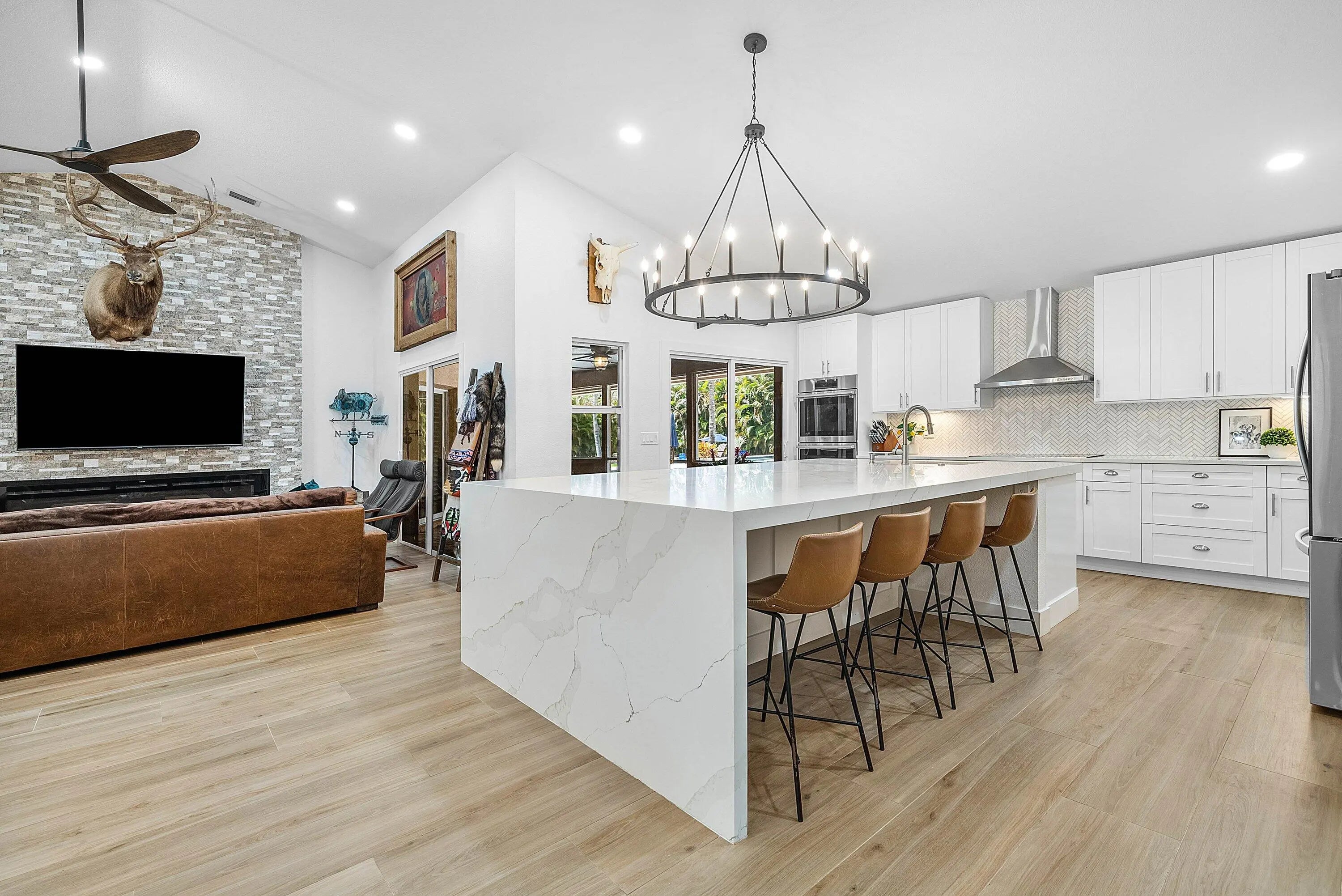 Elevated, ESTATE HOME appointed with every high-end feature you can think of! Completely remodeled and reimagined in 2023/2024! Premium, 1.37acre lot bordered by canal and on a PAVED ROAD! 4 bedrooms, 3 baths, 2 car garage + 1,200 CBS GARAGE/WORKSHOP + POOL/SPA and 725sq ft GAZEBO! 2019 ROOF. Completely fenced property w/ circular driveway and (2) gates for easy ingress/egress. Everything is NEW inside making this a ONE-OF-A-KIND property! Custom glass double IMPACT door entry greets guests as they walk into soaring ceilings and an open concept floor plan. Great room is impressive with floor-to-ceiling stacked stone fireplace. Porcelain wood-plank flooring throughout. Dining room is substantial with room to seat 12+. You will notice thoughtfully chosen details like custom lighting, LED recessed cans, new doors/millwork and neutral on-trend finishes are sure to please anyone. Plantation shutters and IMPACT WINDOWS AND DOORS throughout. Gathering kitchen is a WOW factor with huge 10 ft. island, bar seating for 8 and finishes second to none! Calcutta Quartz counter tops w/ waterfall edge, white shaker style cabinetry, herringbone marble backsplash, undercabinet lighting, deep single bowl sink, 6 burner cooktop, pantry w/ roll-outs, double oven and commercial-style drink/wine fridge. Finally, the kitchen of your dreams and the heart of the home . Primary bedroom is private w/ walk-in custom closet & incredible spa-like bathroom. Freestanding soaking tub, lighted vanity space, double sinks w/ hotel style backlit mirrors, shaker-style cabinetry, Quartz counter tops and dramatic walk-in shower w/ frameless glass enclosure. Adjacent to primary bedroom is the 4th bedroom or office/den. 3rd bedroom is private w/ custom closet and adjacent bath with same quality finishes as the primary. Tucked away but still easily accessible is a guest wing of the home that can stand alone as a guest house/mother-in-law quarter. Features its own entrance, additional living room and full kitchen remodeled to perfection. Additional secondary bedroom feels like a 2nd primary suite including a large walk-in closet and "cabana" door leading out to the pool and yard. En-suite remodeled bath w/ double sinks and large shower complete with high-end touches. Laundry room features built-in cabinetry, deep sink and front-loading washer/dryer. Adjacent 2 car garage is finished with "diamond cut" epoxy flooring. The property is an oasis and must be seen to appreciate! Mature trees, orchid garden, Koi Pond, boulder enhanced fire pit, horseshoes, screened & covered patio + 700 sq ft CBS gazebo is the perfect space for quiet time, cozy family gatherings, entertaining during game time or simply enjoying Florida living at its best! Huge, heated pool & spa for 12 makes this truly a resort-style retreat. Featuring a 1,200 SQ FT (40X30) detached garage/workshop/storage building on its own electrical meter! Built for maximum storage including a second story loft. Workshop is built out with custom shelving, tool storage, ample electric, huge commercial fan, impact windows, motorized 16ft door, dedicated concrete driveway with extra side storage for trailer/additional vehicles & RV HOOKUP. Incredibly rare to have a CBS detached garage built to the same quality as the main house. Bring your toys, pets, business, hobbies and large family - all can be accommodated at this property. No HOA! An oasis in the country but close to everything! Easy commute as it's steps away from Northlake and the Beeline. Convenient and close to all the new Avenir shops and restaurants open now and more opening in 2026!