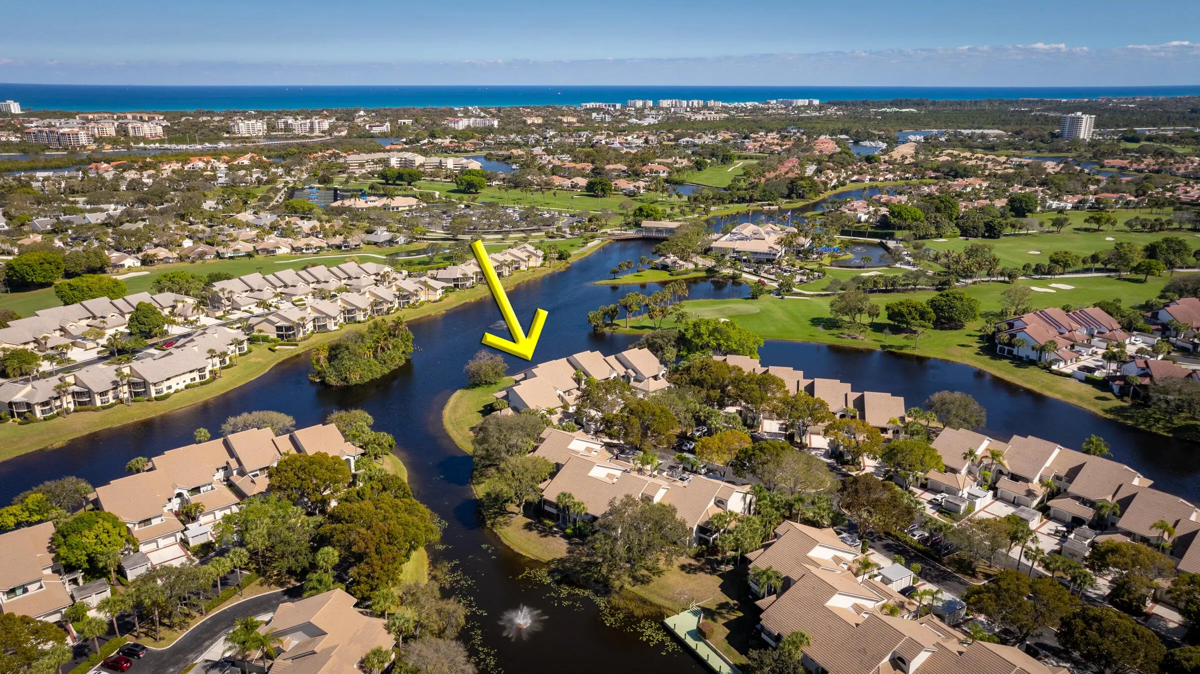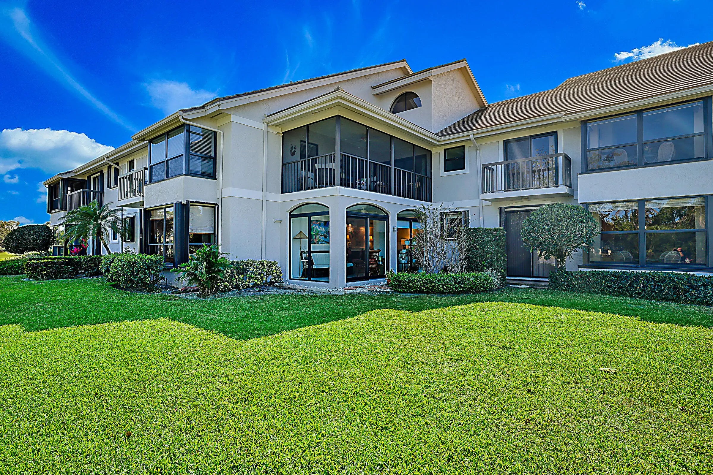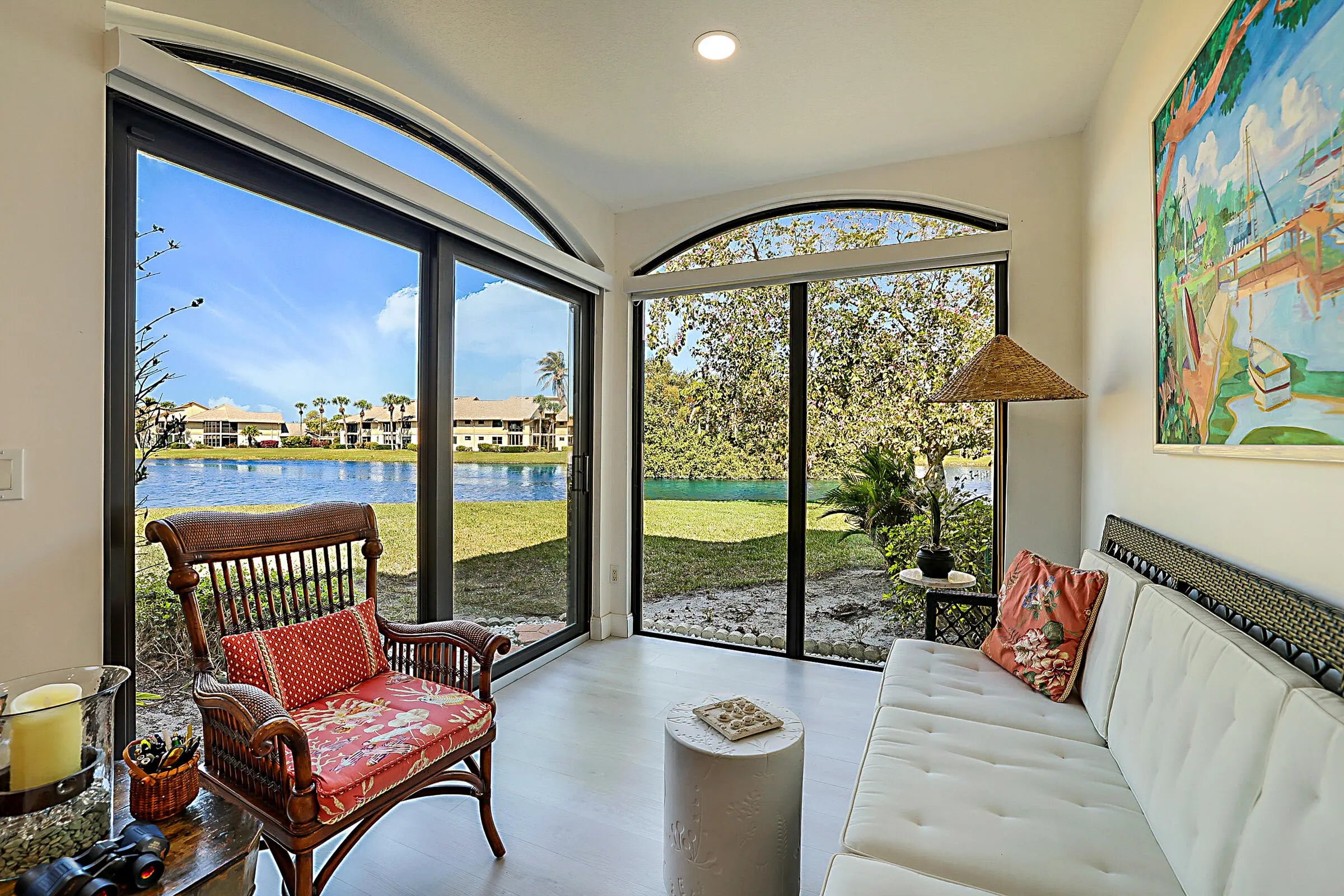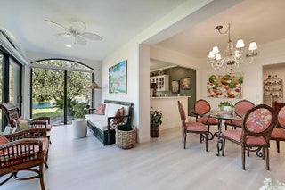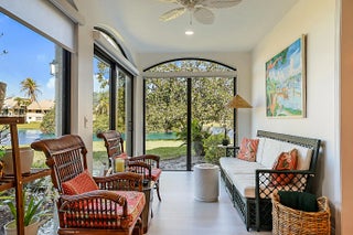 Best location in West Bay! Welcome to this beautiful, waterfront villa with serene unobstructed water views in one of Jonathan's Landing's most sought after neighborhoods. This unit sits on the point, at the end of the cul de sac, offering panoramic views of the lagoon. These first floor units are hard to find, and this one is a true gem, featuring two bedrooms, two full baths, fully renovated and meticulously maintained. The open concept floor plan also features a glass enclosed porch that greatly increases the living space to more than 1600 square feet. The light and bright sunroom features new impact glass throughout, perfect for birdwatching or just relaxing. Other features include a hurricane impact front door, luxury vinyl plank flooring throughout, new AC, attached one car garage with storage, whole house water purification system, and a separate covered golf cart storage shed. Perfect home for year round Florida living or as a second home, close to beaches, shopping, restaurants, golf and all that Jupiter has to offer.