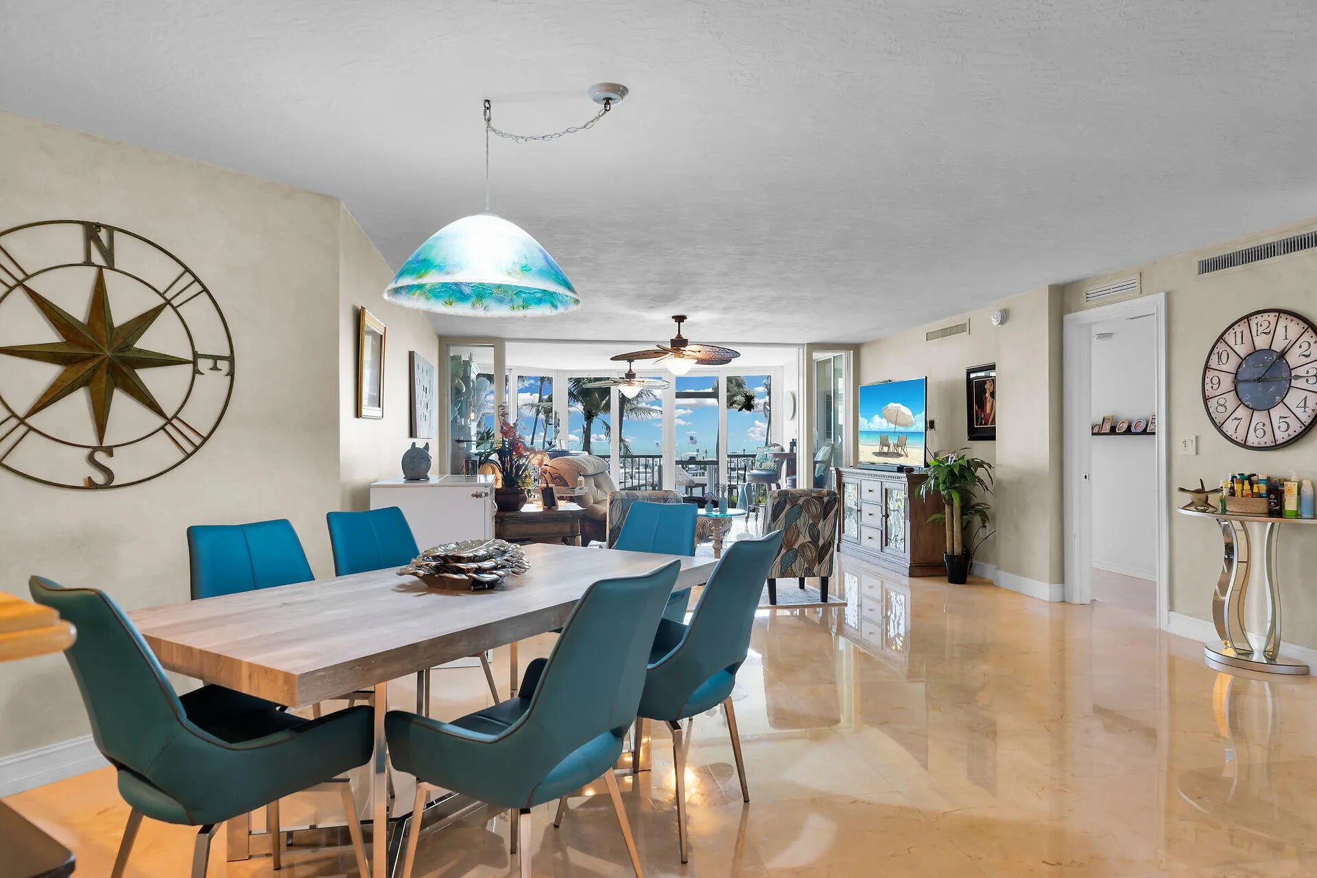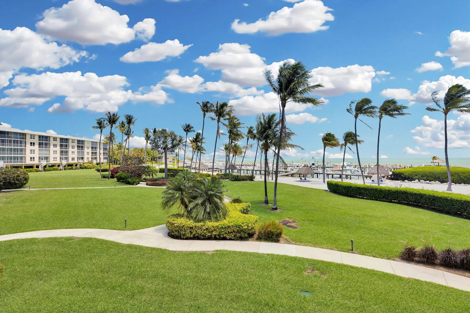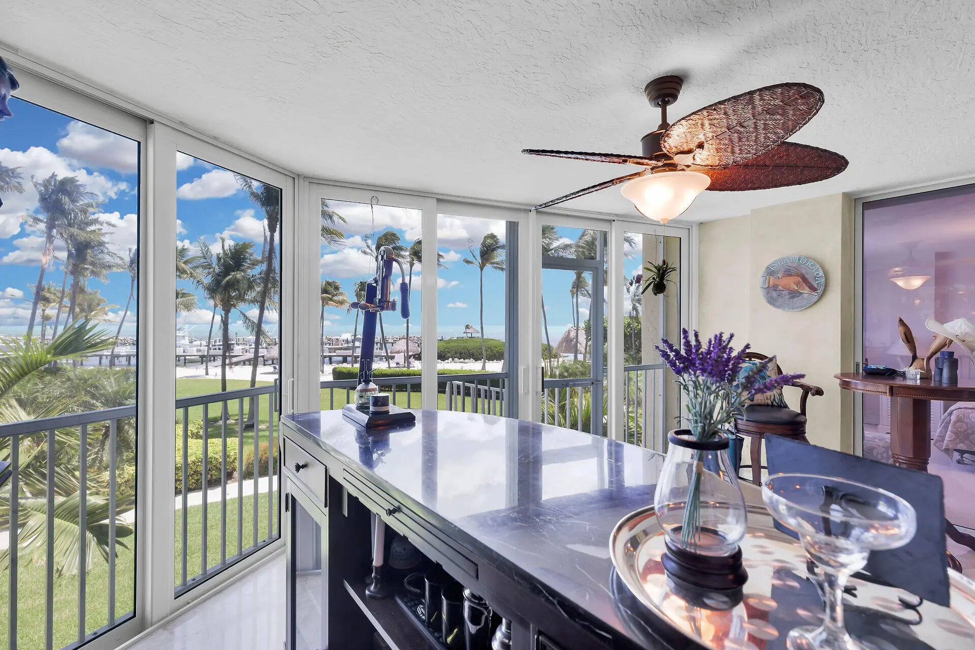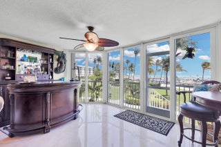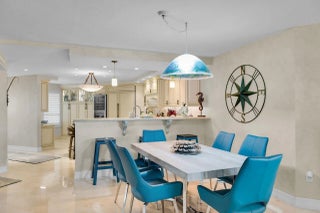A New Standard of Paradise - Live with views of the Atlantic Ocean everyday. This home has been updated and beautified from top to bottom. Marble flooring throughout living areas. Eat in kitchen offers large island, snack counter and full size wine cooler. Dishwasher installed 12/25. There is also a hot water dispenser. Dining area and living area open to enclosed patio with private spiral staircase leading to resort styled amenities. Impact glass on all windows. Primary bedroom offers more spectacular views, built in furnishings and is 14x14. Modification in primary bathroom leads to large walk in closet. Washer replaced 2025, dryer 2024, AC 2021. Building inspections complete with no pending assessments. Private Marina dredged 2025. Outside storage cage included. RARE covered parking. Enjoy resort style pool, hot tub, tennis, pickleball, nature trails, gazebos, boat ramp, clubhouse with fitness, pavilion with ice machine, docks rentable for up to 30ft boat (almost always available), tiki huts, electric vehicle chargers, guest parking, open lot for boat storage, and private marina. Chandelier in dining area excluded. Beach area overlooks marina. Owner agent.