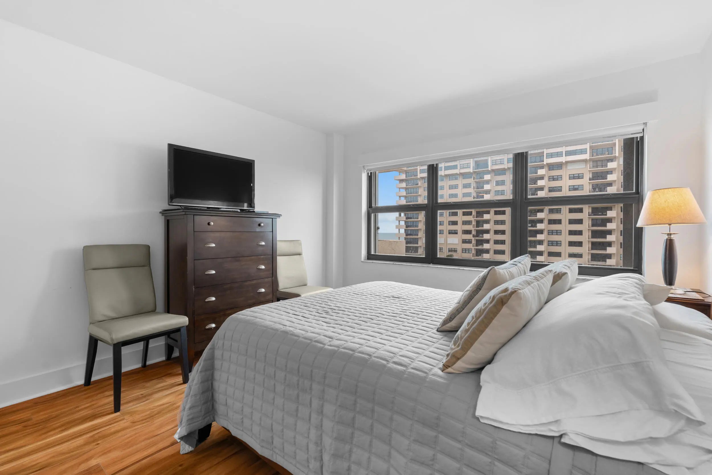 Bright south facing two bedrooms with beautiful views of Ocean and City. Features wood floors, a remodeled kitchen with stainless steel appliances, and tasteful furnishings. Enjoy true beachfront living, literally on the sand with a wide, tranquil shoreline right outside your door in a private beachfront setting. Set within 34 acres of beautifully maintained grounds, this retreat offers eight tennis courts, three pools, gym, two dog parks, and lush gardens. Perfect for morning walks on the sand or relaxed afternoons by the pool. Entertain with ease at the BBQ areas or the cabana featuring a fully equipped kitchen, ice maker, and more. All just moments from shops and restaurants.