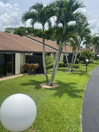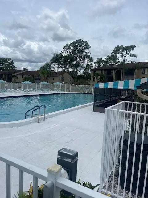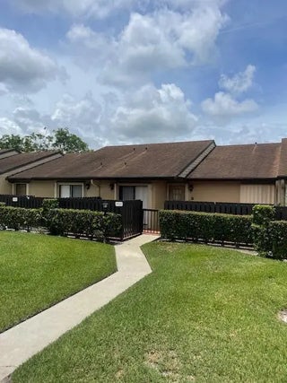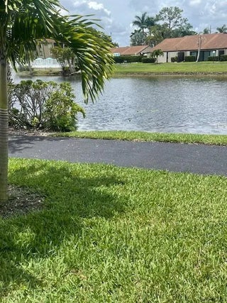 Don't miss this charming 2-bedroom, 2-bath first-floor villa featuring peaceful lake views and desirable hurricane shutters for added protection. Enjoy the convenience of being just a short walk to the community pool, clubhouse, tennis courts, and shuffleboard. This well-maintained home offers vinyl plank flooring in the living room, a stackable washer and dryer, and central A/C (only 7 years old). The roof is approximately 10 years old, providing added peace of mind. Relax outdoors with both a front patio and a rear patio overlooking the tranquil lake—perfect for morning coffee or evening unwinding. The HOA fee covers basic cable, exterior maintenance, exterior insurance, roof upkeep, and access to all community amenities—making for easy, low-maintenance living. Pet-friendly 25LB MAX