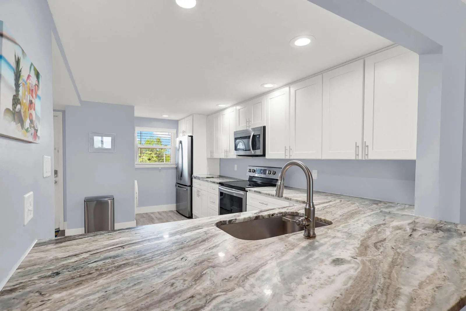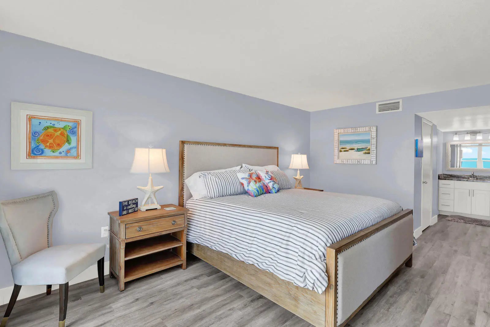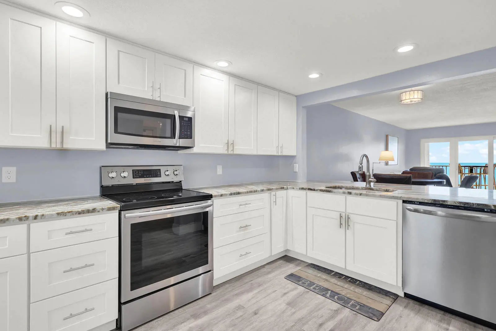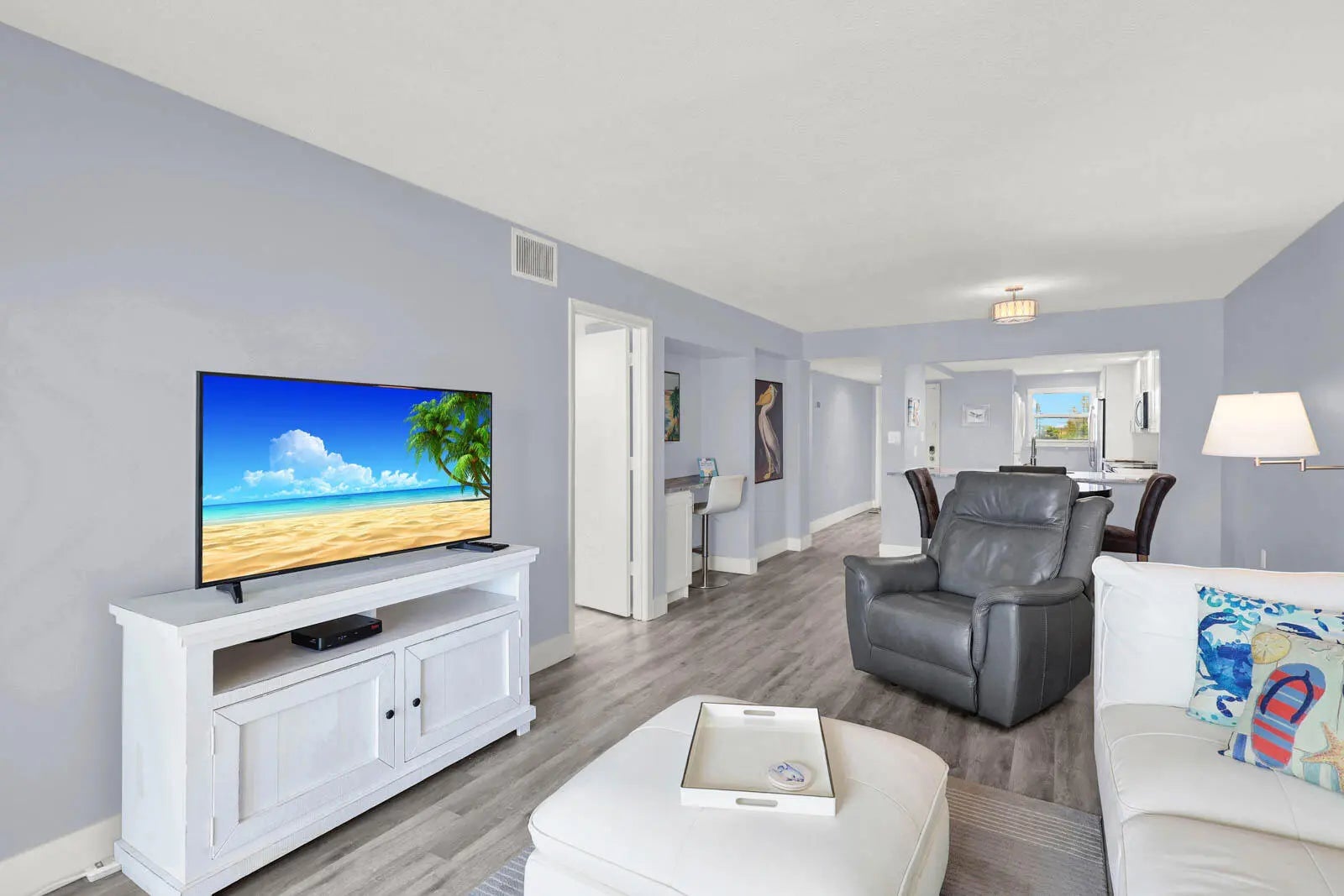 Wake up to sweeping ocean views in this beautifully remodeled 2-bedroom 2-bath beachfront condo on Hutchinson Island.This turnkey residence features luxury plank vinyl flooring throughout, newer hurricane-impact windows, newer air-conditioning system & water heater, offering both style and peace of mind. The updated kitchen showcases white shaker cabinetry, granite countertops, and stainless steel appliances, while a full-size stackable washer and dryer provide added convenience. Offered fully furnished with a tasteful coastal aesthetic and a fully equipped kitchen and baths-just bring your suitcase. Walking distance to restaurants and convenience store. Ideal as a primary residence, vacation retreat, or income-producing property with a desirable one-month minimum rental requirement.