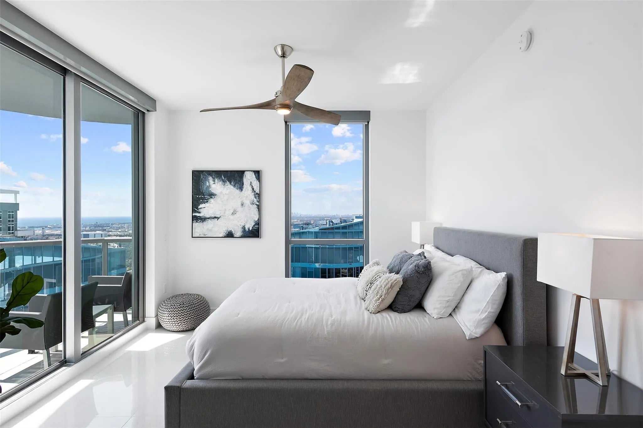 NEWLY REPRICED! This Penthouse level condo at 100 Las Olas could finally be yours. With wrap-around views of the ocean, Hard-Rock casino and all of the Western skyline! This is truly a one-of-a-kind Palace in the Sky. Finishing touches include upgraded porcelain tiling throughout, electric blinds and top of the range appliances. Designed as a 3-bedroom condo, it is currently configured as a 2-bedroom all en-suite with a large office and additional full bathroom. Multiple walk-in closets with built-in cabinetry. Two terraces, one East-facing, the other West, provide an additional 544 sq. ft of living space. 100 Las Olas is newly built, and swanks five-star amenities like club room, huge pool and cabana area, coffee lounge, gym, valet parking etc etc. Bonus 2 car spaces included in price!
