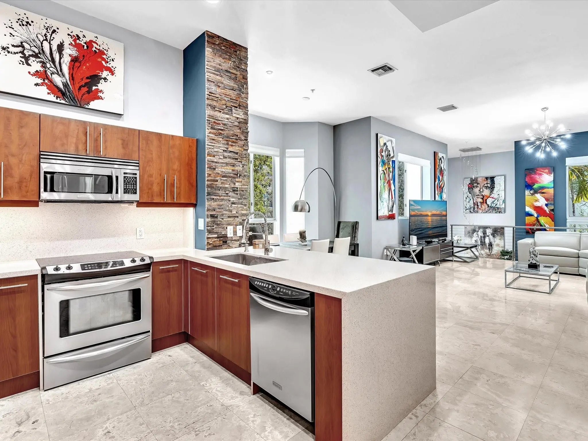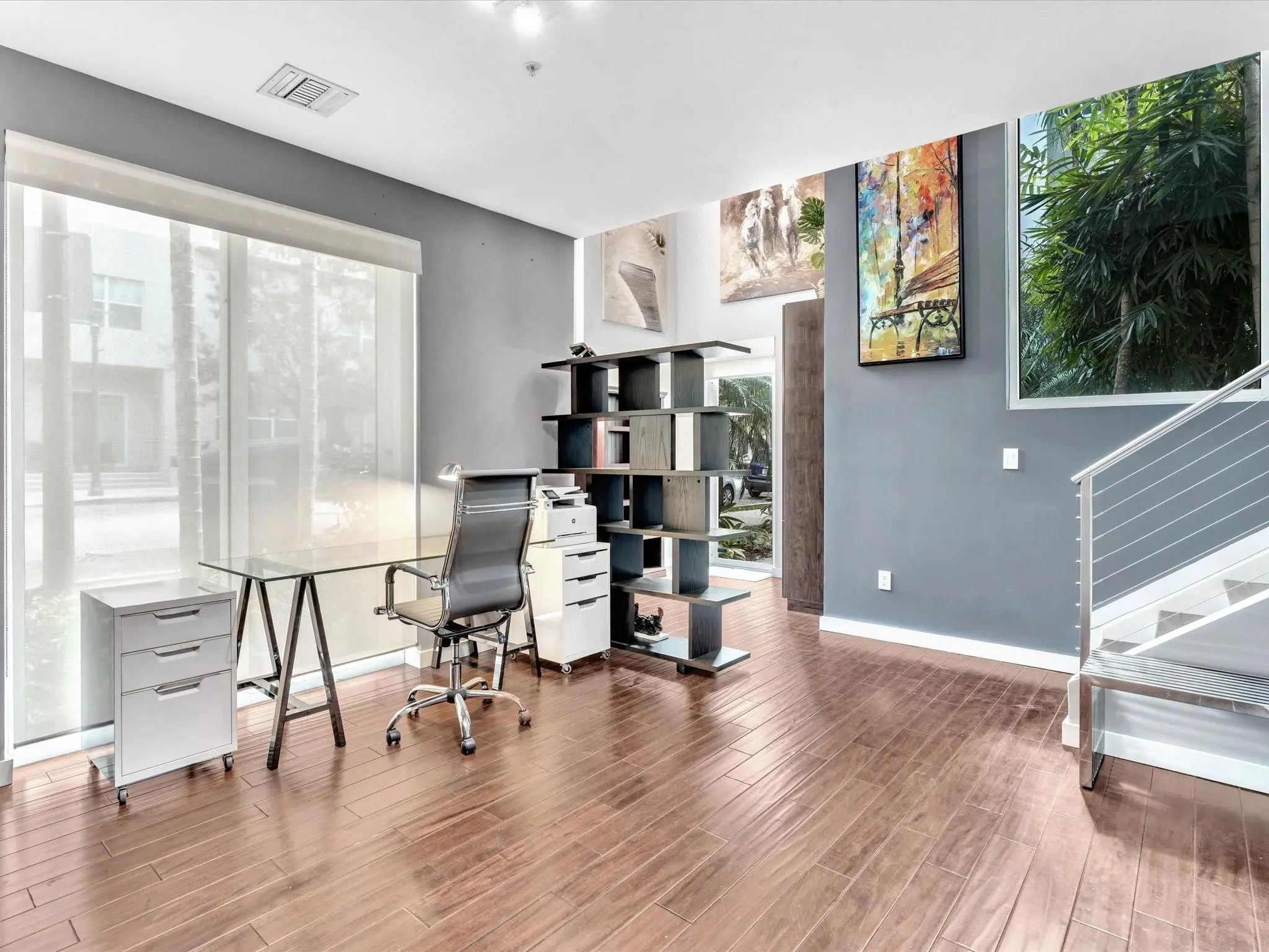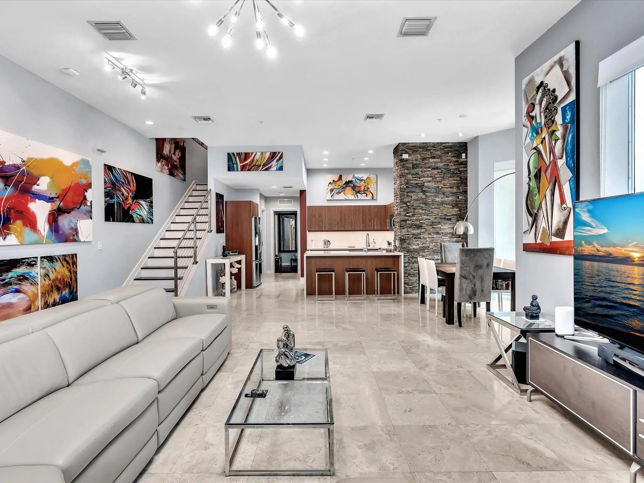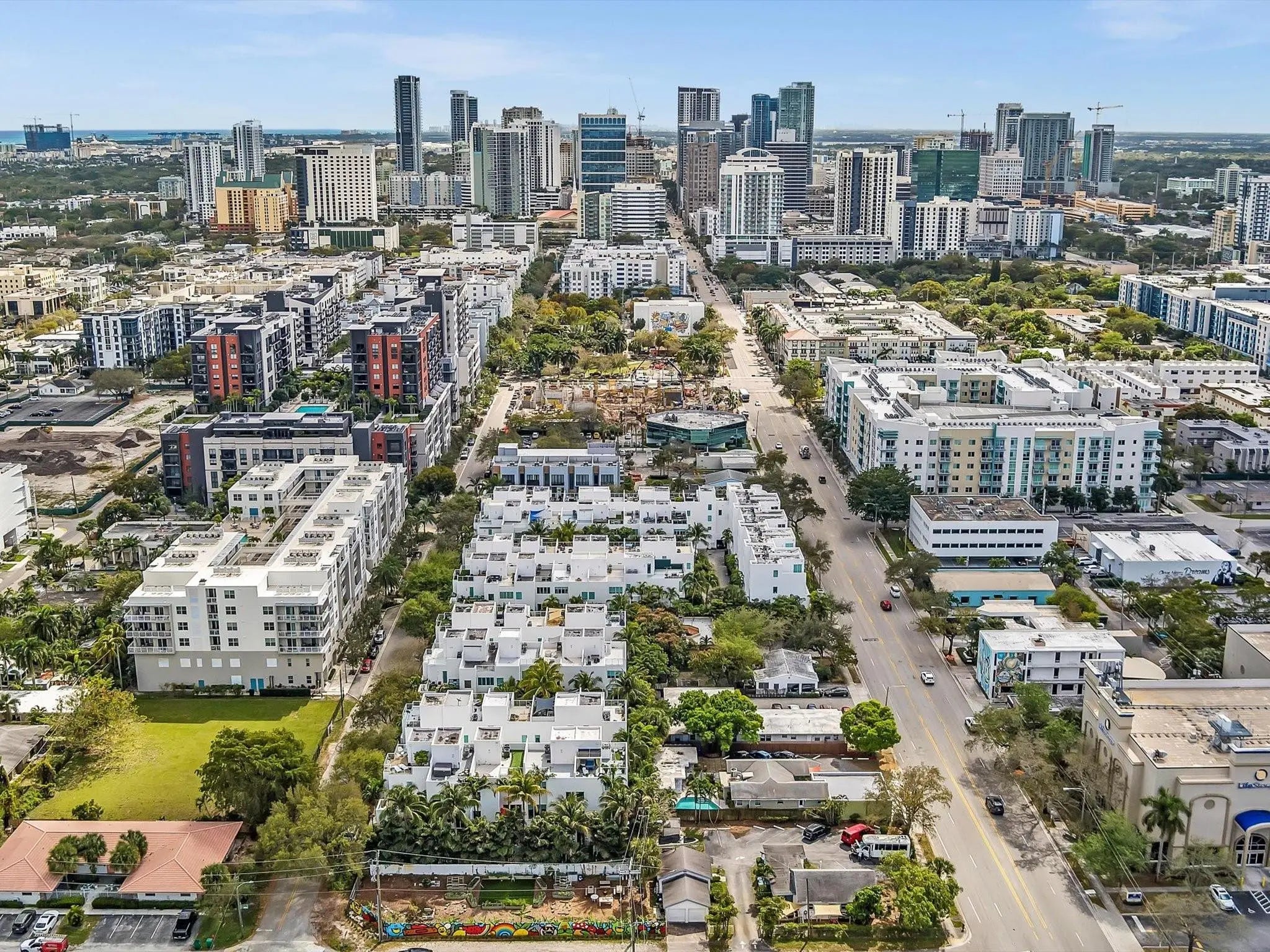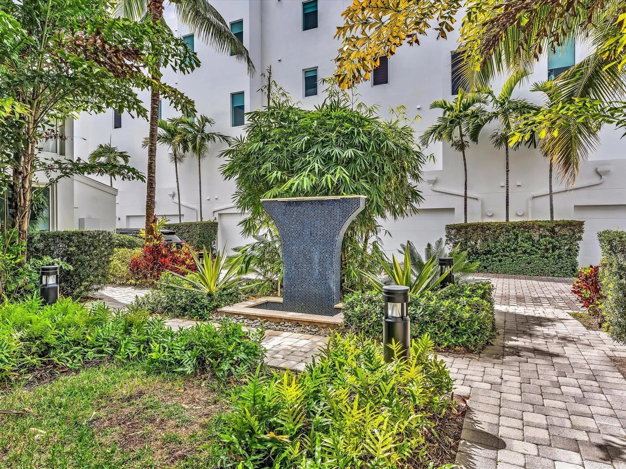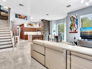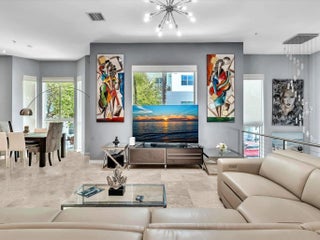 Elegant 4-story, fully furnished townhome with 50 paintings. Bamboo Flats community in the vibrant Flagler Village, downtown FTL. This property features 3 bedrooms, one could be used as office space on the ground floor, 3 full bathrooms, and a half bath, all designed with a modern aesthetic. The home boasts open, spacious living areas with 9 to 11-foot ceilings, large windows, and abundant natural light, complemented by custom-built cabinetry. The layout includes a 2-car garage and an office/den on the 1st floor, a kitchen and living area, plus one bedroom on the 2nd floor, and the master bedroom with ensuite bathroom, walk-in closet, terrace, washer/dryer (3rd floor). A large rooftop terrace (4th floor). Secure, gated community with lush tropical gardens and a beautiful pool area. Fully Furnished with 50 paintings