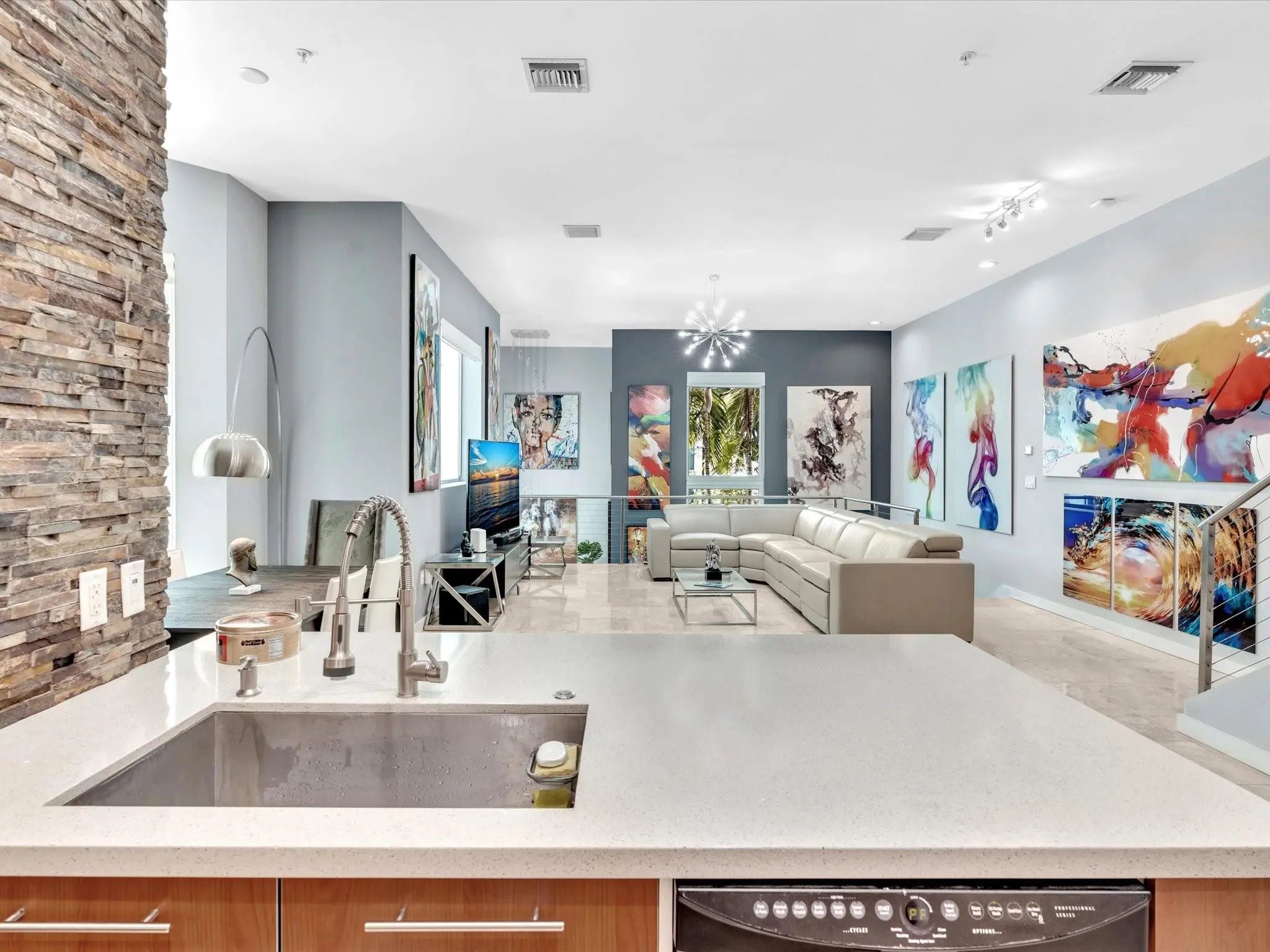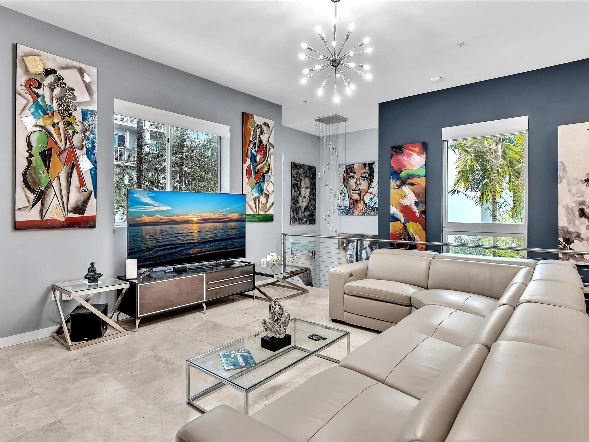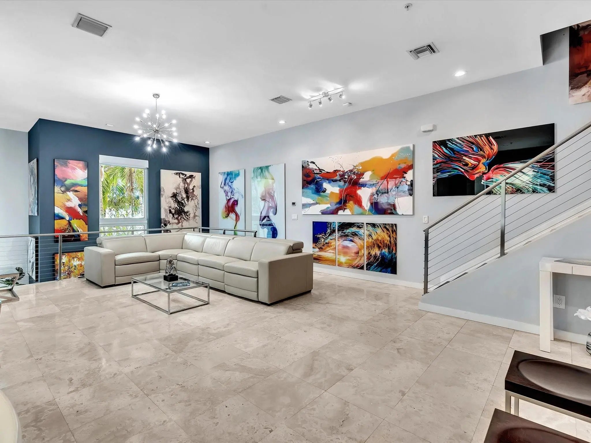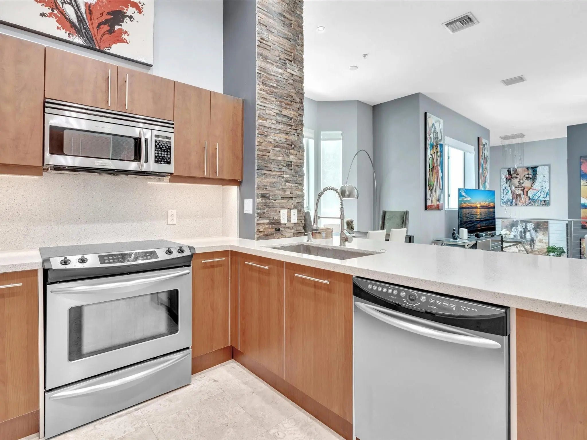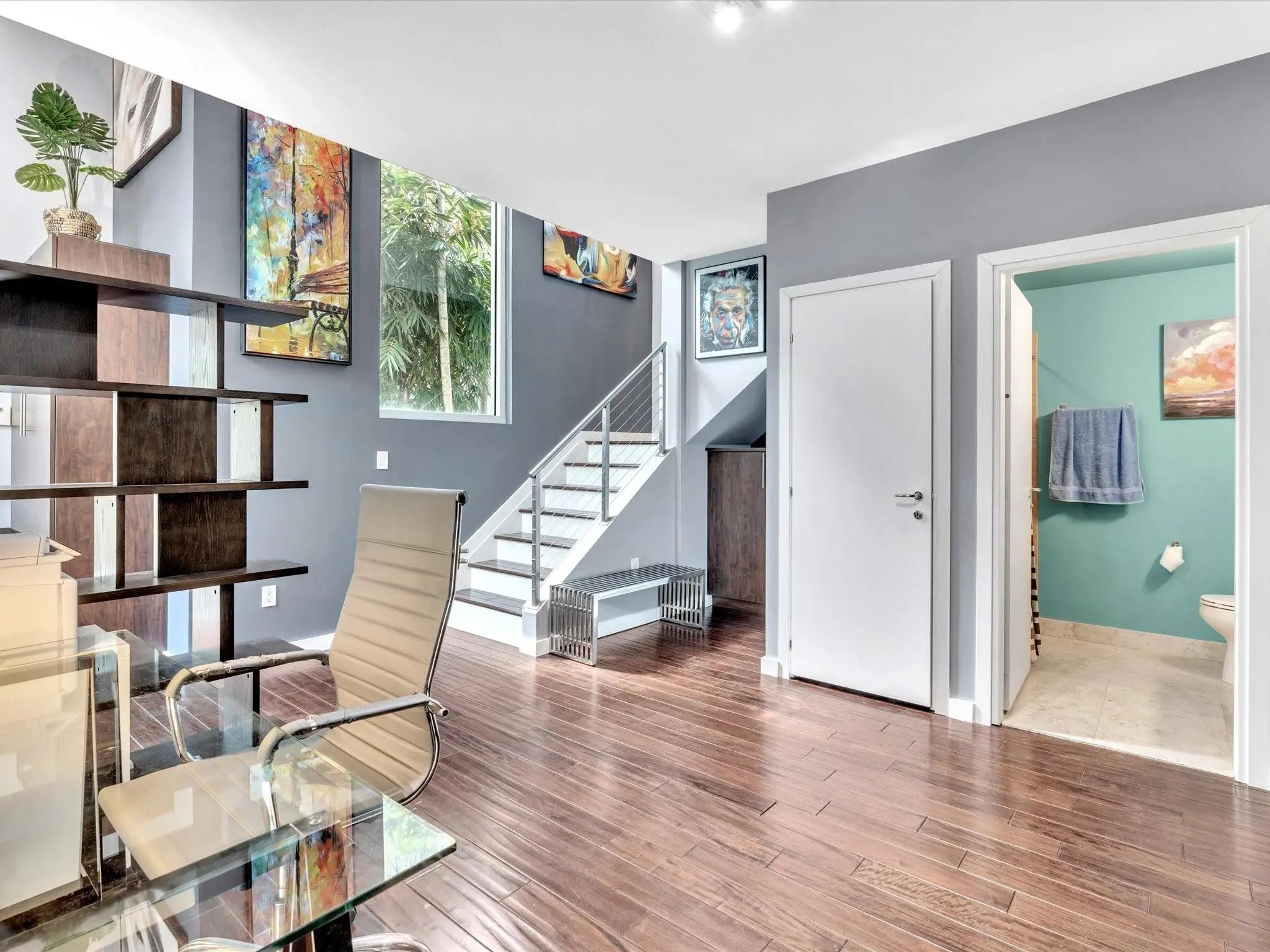 Elegant 4-story, fully furnished townhome with 50 paintings. Bamboo Flats community in the vibrant Flagler Village, downtown FTL. This property features 3 bedrooms, one could be used as office space on the ground floor, 3 full bathrooms, and a half bath, all designed with a modern aesthetic. The home boasts open, spacious living areas with 9 to 11-foot ceilings, large windows, and abundant natural light, complemented by custom-built cabinetry. The layout includes a 2-car garage and an office/den on the 1st floor, a kitchen and living area, plus one bedroom on the 2nd floor, and the master bedroom with ensuite bathroom, walk-in closet, terrace, washer/dryer (3rd floor). A large rooftop terrace (4th floor). Secure, gated community with lush tropical gardens and a beautiful pool area. Fully Furnished with 50 paintings