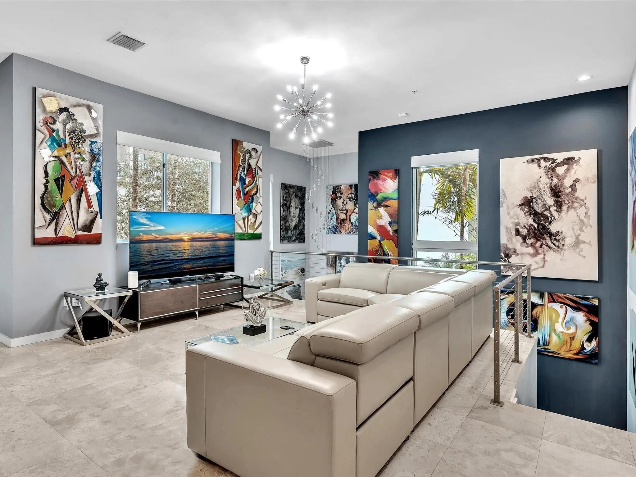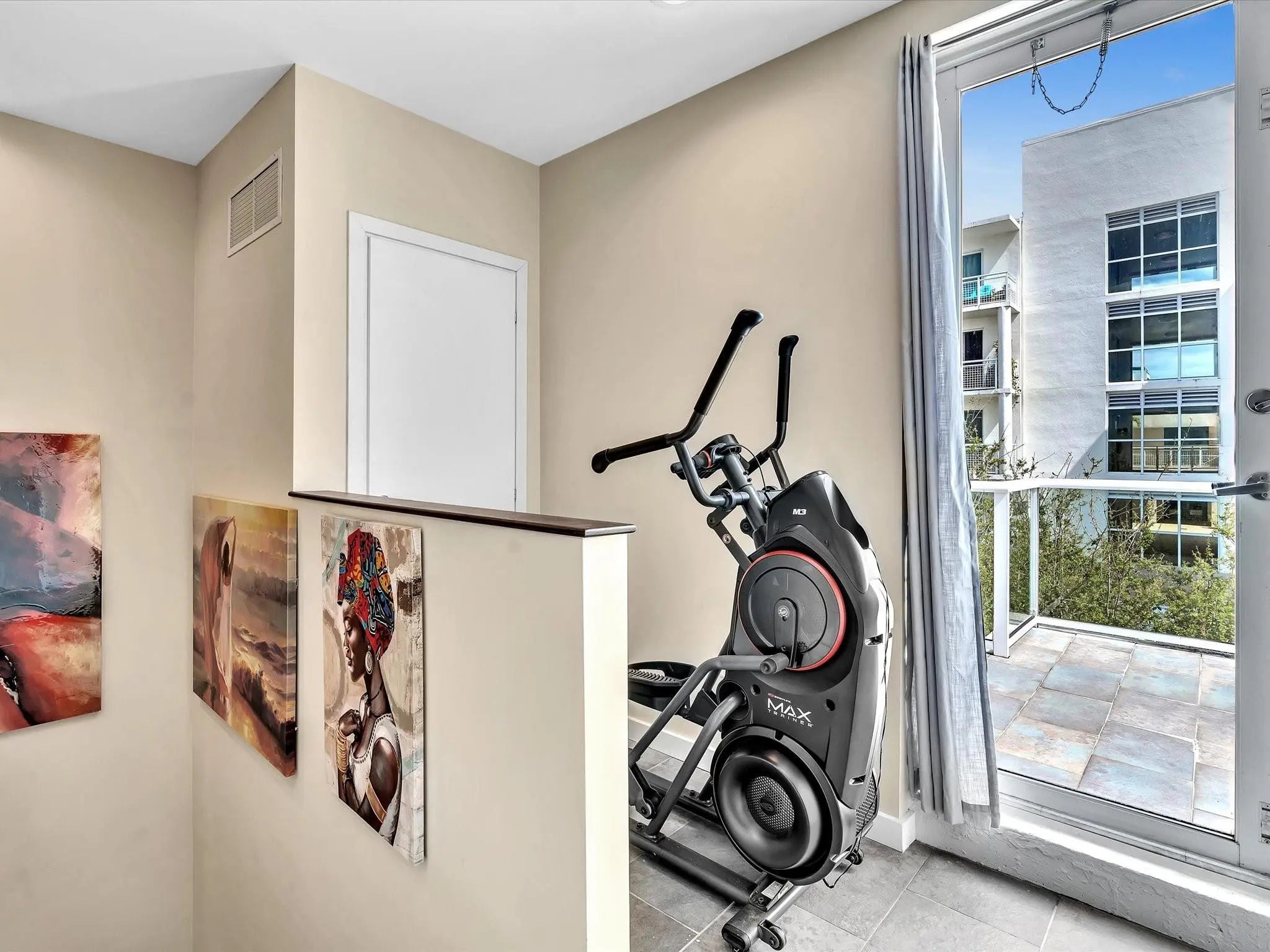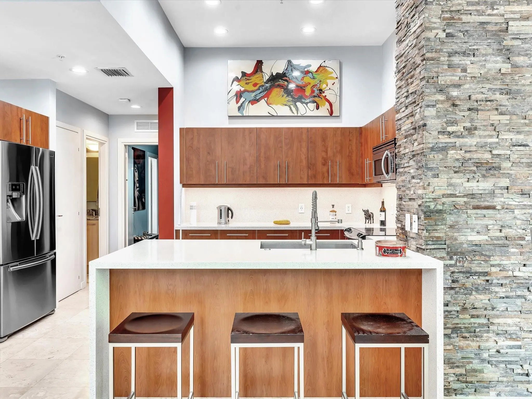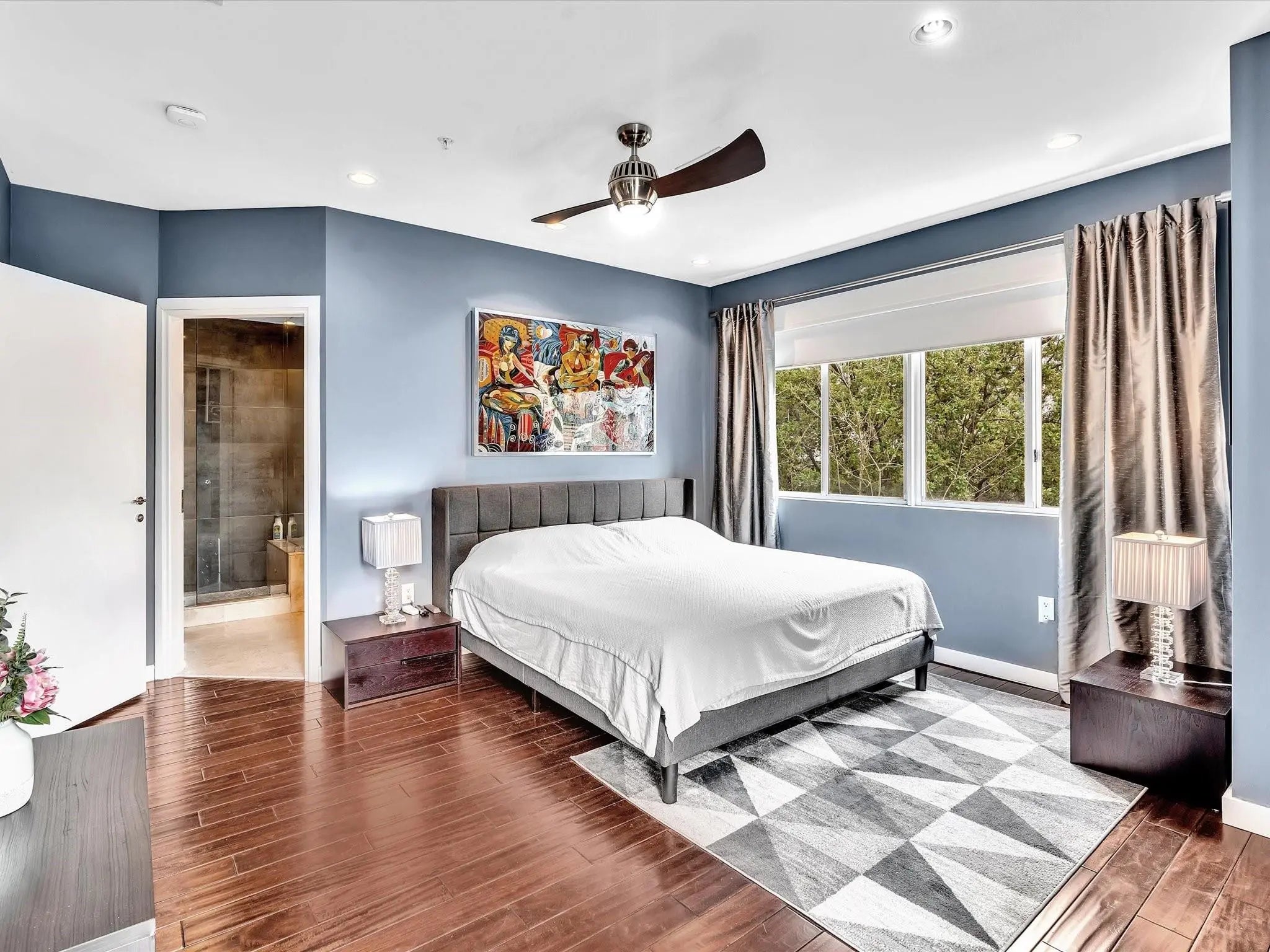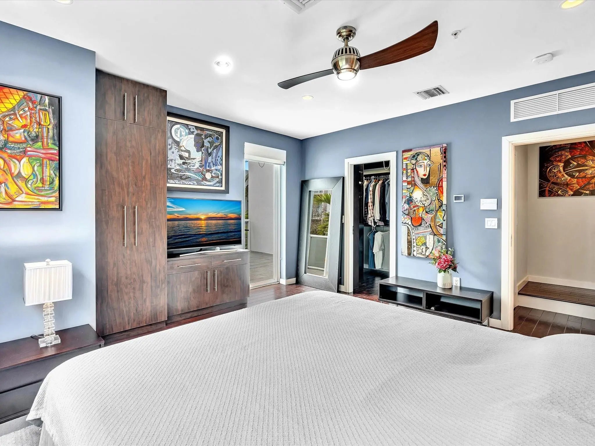 Elegant 4-story, fully furnished townhome with 50 paintings. Bamboo Flats community in the vibrant Flagler Village, downtown FTL. This property features 3 bedrooms, one could be used as office space on the ground floor, 3 full bathrooms, and a half bath, all designed with a modern aesthetic. The home boasts open, spacious living areas with 9 to 11-foot ceilings, large windows, and abundant natural light, complemented by custom-built cabinetry. The layout includes a 2-car garage and an office/den on the 1st floor, a kitchen and living area, plus one bedroom on the 2nd floor, and the master bedroom with ensuite bathroom, walk-in closet, terrace, washer/dryer (3rd floor). A large rooftop terrace (4th floor). Secure, gated community with lush tropical gardens and a beautiful pool area. Fully Furnished with 50 paintings