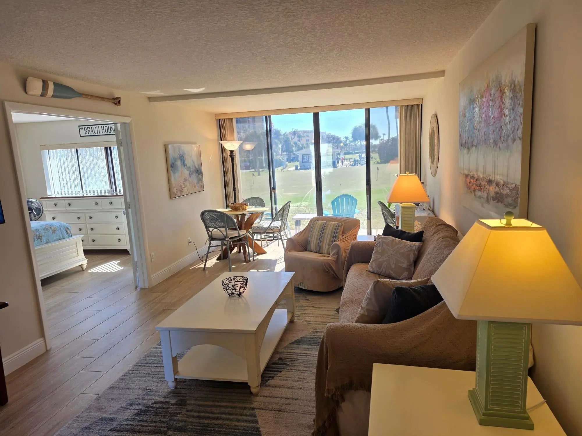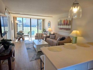 Beautiful TOTALLY Updated condo on the first floor. No stairs to Climb ! The patio has been enclosed for additional interior AC area. This Unit comes COMPLETELY FURNISHED ! TURN KEY !! EVERYTHING you see in the unit comes with the sale and includes all pots, pans, towels, bed, sofa, sheets, art work, beach chairs, small electrical appliances, cooler etc.. This unit can be rented IMMEDIATELY with a minimum of 7 days. View is of the putting green. Next to the NEW Clubhouse and VERY Close to the Ocean. Closest condo within walking distance to the Main pool, Tiki Bar, Restaurant, 1st golf tee and tennis courts. New roof 2023. There's a 9 hole executive golf course, 10 lighted tennis courts, 4 heated pools, jacuzzi, pool side Tiki and Ocean front dining on premise. Washer and Dryer in Unit.