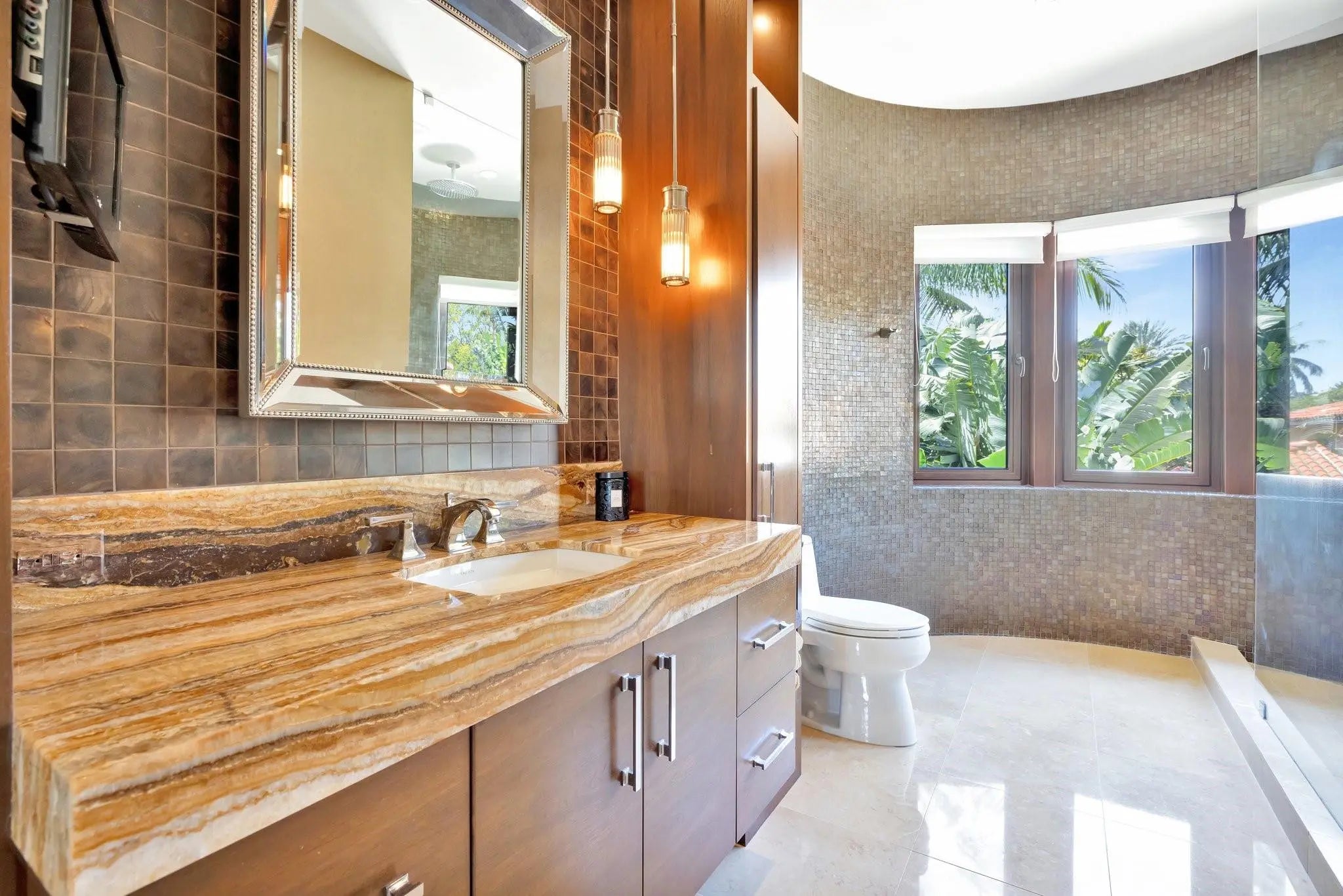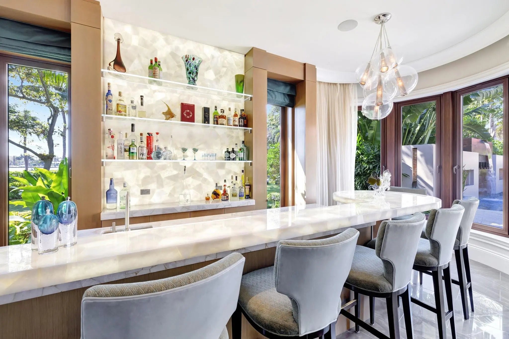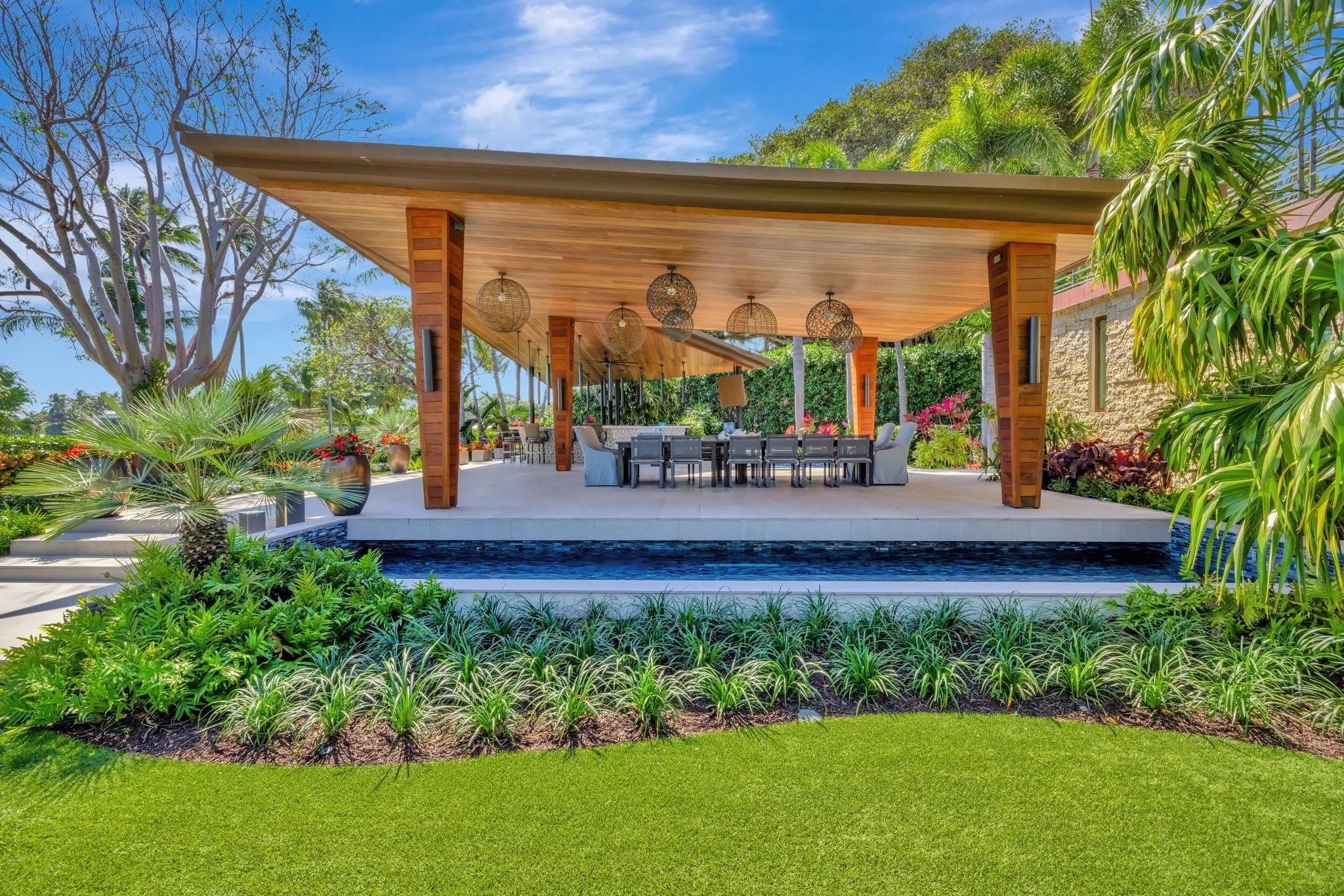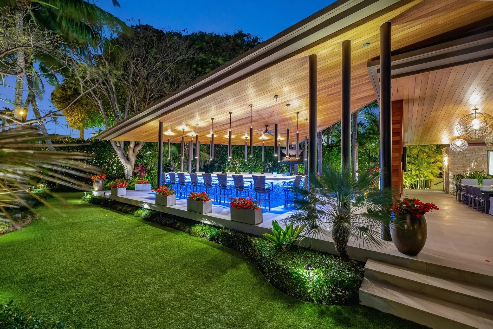 Magnificent two-parcel .82 acre Idlewyld waterfront estate with over 14,000 sf in total. Ultimate deep water compound! 338ft+/- straight-line waterfront (no wake) with two docks. Main house 6,336 sf under air with 2,050 sf covered outdoor living off Chef’s kitchen, fully renovated and expanded in 2012 with option for apartment over garage. In 2018, guest house with pool pavilion added, 1,330 sf under air plus 2,504 sf terraces with dining bar for 18, caterer’s kitchen, cabana, gym, and office. Estate includes 2,029 sf of air-conditioned garage space for seven cars. Walled and gated for privacy, award-winning grounds and rare tropical landscaping surround two pools and spa. Timeless Marc Michaels design with custom detailing and high-quality finishes throughout. Most desirable & extremely private South end of Idlewyld Drive. Estate is entirely walled & gated, creating a Four Seasons type environment that must be seen to be appreciated! Main House 815 Idlewyld Certificate of Occupancy with 2012 renovation which included entire Primary Suite with separate baths & closets, plus large private balcony intracoastal facing. 2012 new roof over entire main residence & all air conditioners replaced in last 12 months. First Level: formal living room with gas fireplace & covered front terrace overlooking the intracoastal. Separate bar area with 1,000-gallon saltwater live aquarium. Back-lit custom onyx bar, ice maker, refrigeration & storage. Overlooks the totally private courtyard pool (one of two pools).Elegant & welcoming formal dining room (access to pool area), custom wine refrigeration & storage. First level bedroom suite 1, library/home office (potentially bedroom suite 2)Cabana bathroom off the 2,000 sf covered outdoor living area/terrace with Summer Kitchen, grill & refrigeration, cabana bathroom & outdoor shower. Easy access to garage for caterers. 4 bay garage includes 1 lift. Potential apartment over garage for housekeeper or boat captain. Totally private & heated court yard pool with spa. Second level comprises loft area, primary suite, club room & bedroom 5 suite. Club room (potential VIP bedroom suite 4) with acoustic soundproofing built-in, including large projection theater with automatic/motorized black out shades & private balcony. Bathroom with sauna - potential to be a VIP bedroom suite & included in bedroom count. Expansive & ultra-luxurious primary suite offers private intracoastal facing balcony, separate spa style baths and custom closets/dressing rooms.833 Guest House & Pool Pavilion - Award Winning Architectural & Landscape Design Incredible intracoastal views while still enjoying privacy! Professional landscape lighting, outdoor speakers & fountains. Connected by wide open lawn areas & surrounded by tropical landscaping. Covered area includes water feature & secondary splash pool/spa. Stunning bar seats 18 with refrigerator, sink & storage.. Dining loggia with seating for 14, all covered with beautiful, beamed ceilings to create a tropical & private resort oasis. Large separate BBQ area separate to bar. The Guest House offers a full caterer's kitchen, cabana bath & access to the additional 3 car garage (potential 7 car when garages are combined). Stair access to second level of Guest House, terrace opens to gym and home office, both with amazing views. Spa style bathroom. Potential for additional bedrooms if required. DOCKS - Two separate docks, 70' & 90' both with 100amp/2 x 50 amp service 17,000 lb boat lift. Please note approximate measurements obtained from the builder & should be verified by the buyer for accuracy.