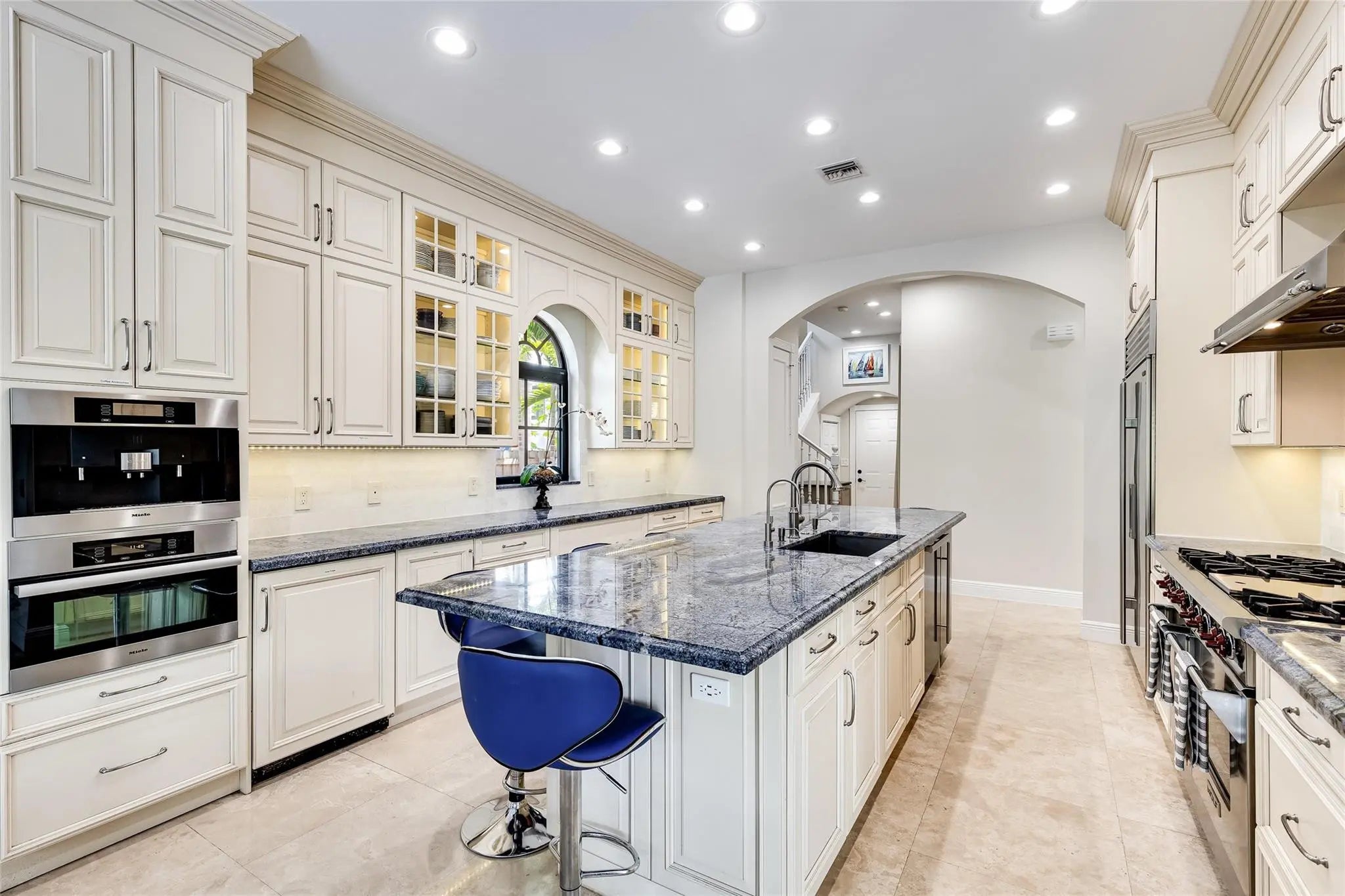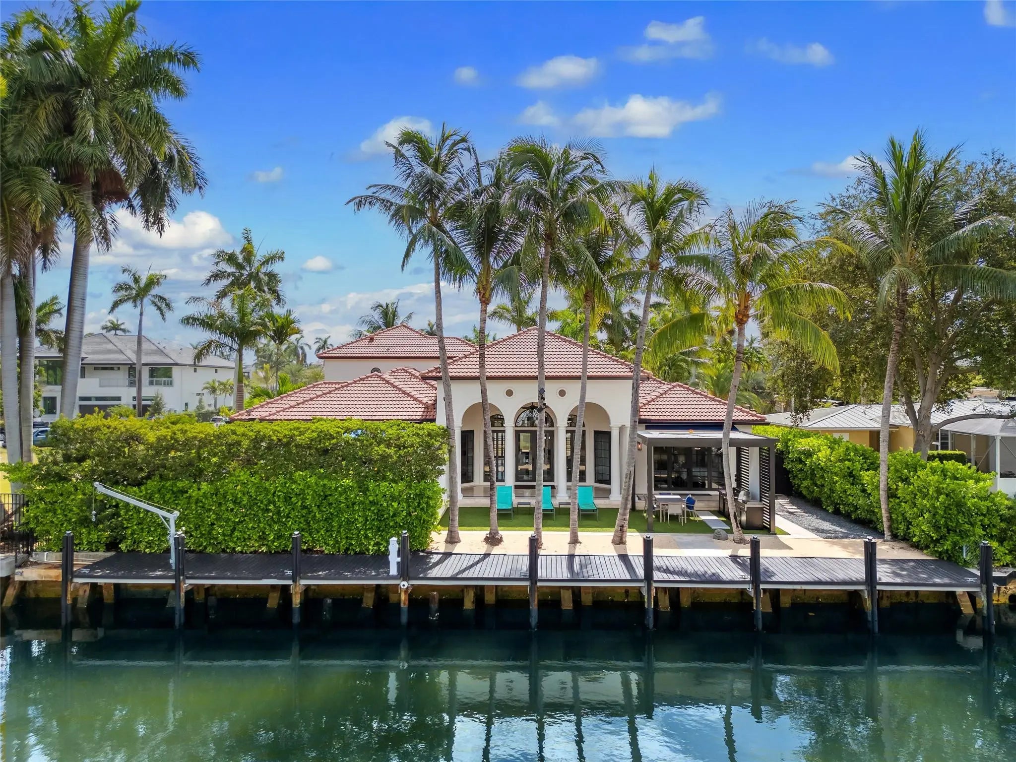 Waterfront Gated Estate in heart of the Las Olas Isles. Elegant Mediterranean-Contemporary that features exceptional Great Room with volume ceilings. Abundance of natural light. Great layout with 3+1 beds on first floor and 3 beds on 2nd floor. Marble and wood floors, granite countertops, chef's kitchen with Sub-Zero fridge and Wolf gas range open to family room. Primary Suite on 1st floor with 2 walk-in closets and spa-like bathroom. Large Guest/In-Law Suite with sitting room. Stunning heated salt water pool w/ new summer kitchen is ideal for entertaining. 90 ft dock w/ ocean access and no fixed bridges. Equipped with gas generator. 2 car garage. Freshly painted inside and out. Walking distance to beach and Las Olas Blvd. Perfect for private waterfront enclave or a luxury vacation rental!