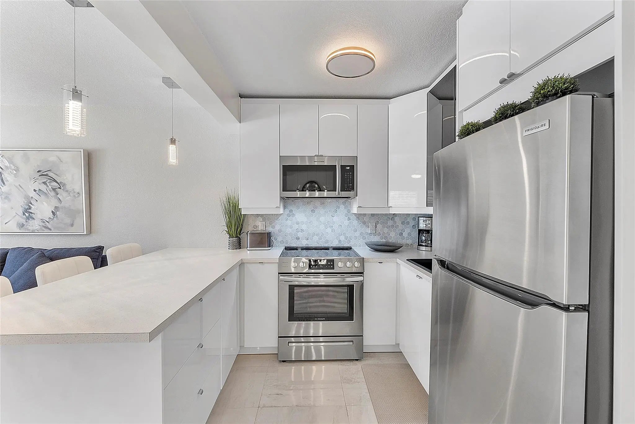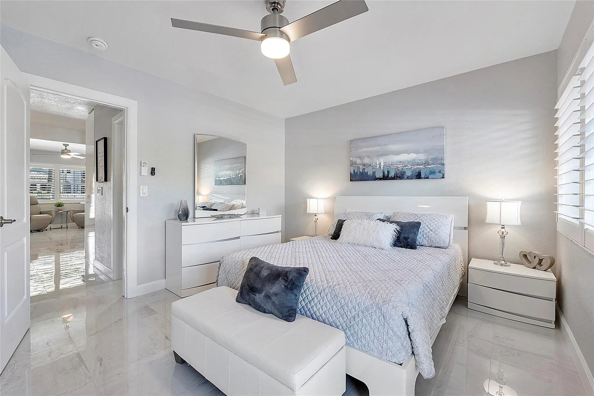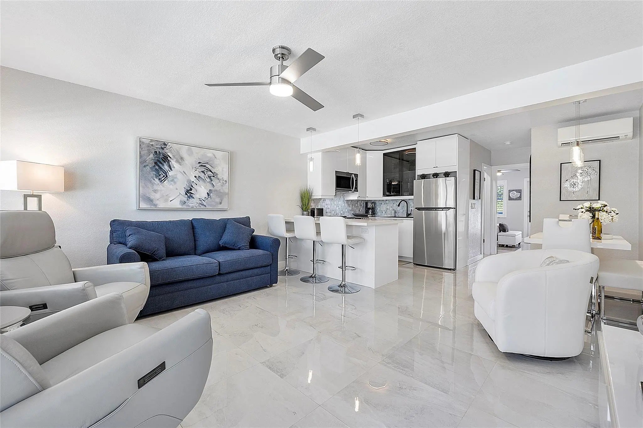 This stunning, fully furnished unit has been tastefully updated with impact windows and doors, exquisite tile flooring, and an open kitchen featuring stainless steel appliances and modern bathroom. The property includes convenient features such as a central vacuum, portable washer, and gorgeous furniture. Access to the complex is through the gated community of Golden Isles, which is surrounded by magnificent waterfront homes worth millions. Enjoy the convenience of walking distance to the beach, restaurants, and entertainment options.