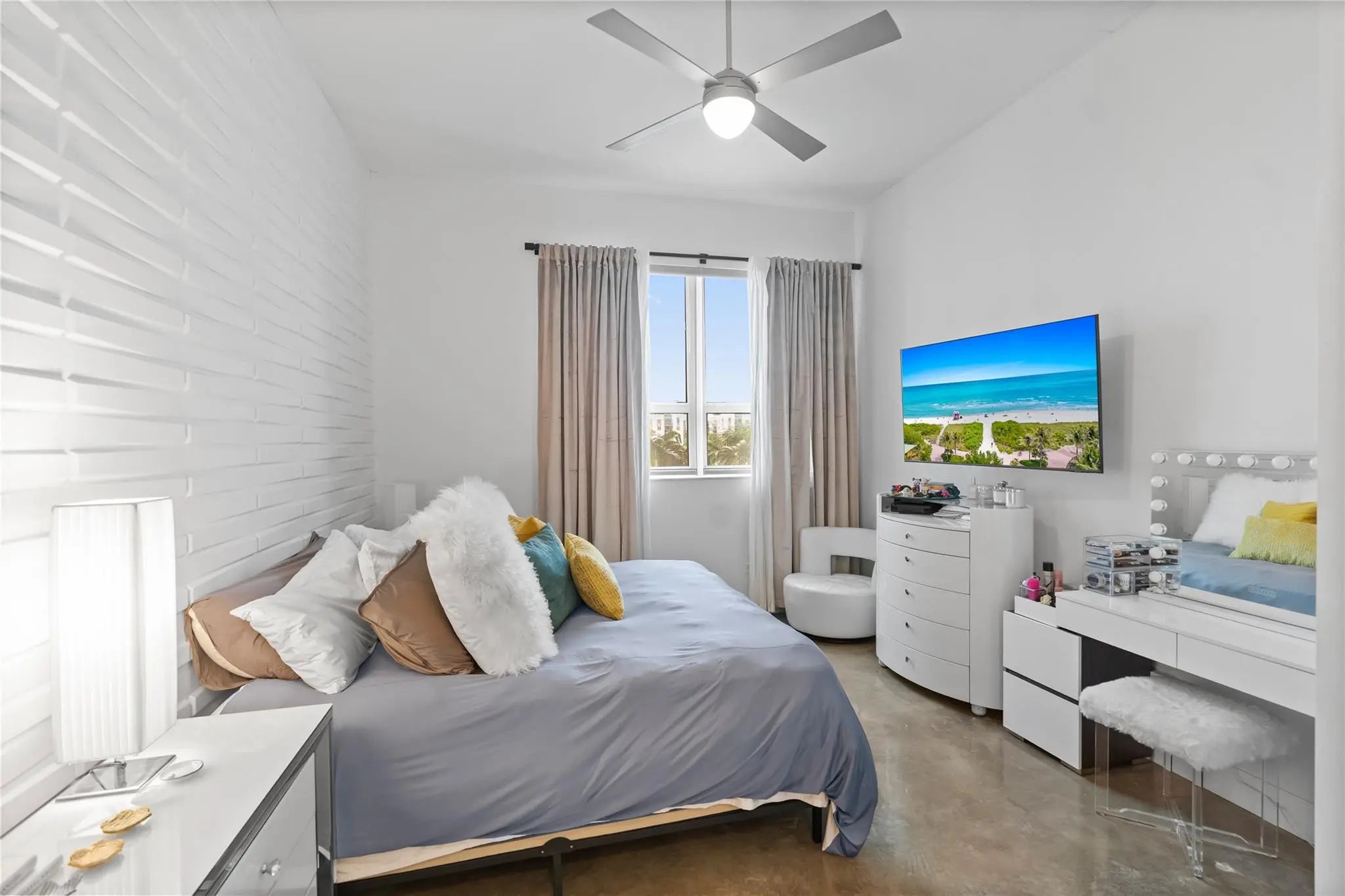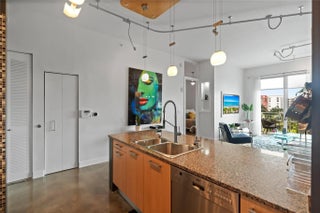 Experience the epitome of urban sophistication in this true industrial-style loft, featuring soaring 11-ft ceilings painted crisp white for a bright, airy feel. Polished concrete floors enhance its authentic city vibe, while 2 bedrooms and 2 full baths offer comfort and style. The gourmet kitchen boasts granite countertops, a glass mosaic backsplash, instant hot and filtered water, plus a brand-new premium refrigerator and LG washer/dryer. A custom room divider with a dual-sided swivel TV separates the living area and guest room, with a recessed TV for sleek appeal. The master retreat showcases a designer accent wall and an opaque glass door for privacy. Modern luxury meets industrial charm in this stunning loft designed for contemporary living.