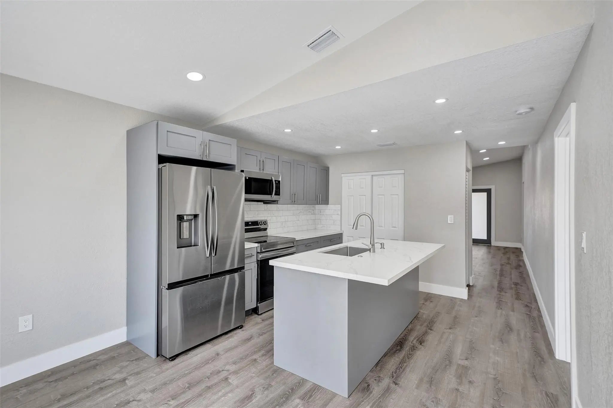 Turnkey perfection in gated El Prado by the Lake! FULLY upgraded 3-bed, 2-bath home checks every box: NEW ROOF, NEW hurricane impact doors, windows & sliders, NEW A/C, and NEW tankless water heater—peace of mind, security, insurance savings. NEW designer kitchen shines: quartz countertops, soft-close cabinetry, custom island, stainless steel appliances. Both bathrooms have been beautifully remodeled with frameless showers, modern vanities, and premium finishes. You’ll love the luxury vinyl plank floors, LED lighting, knockdown ceilings, and fresh paint throughout. Enjoy a large fenced yard for outdoor living plus community perks including 24/7 security, pool, basketball, and playground. Low HOA and a prime location near shopping, dining, major highways—don’t wait, this one is a must-see!!