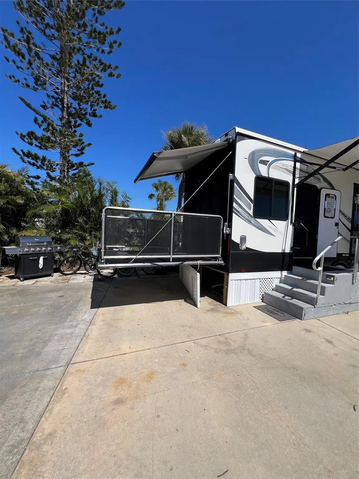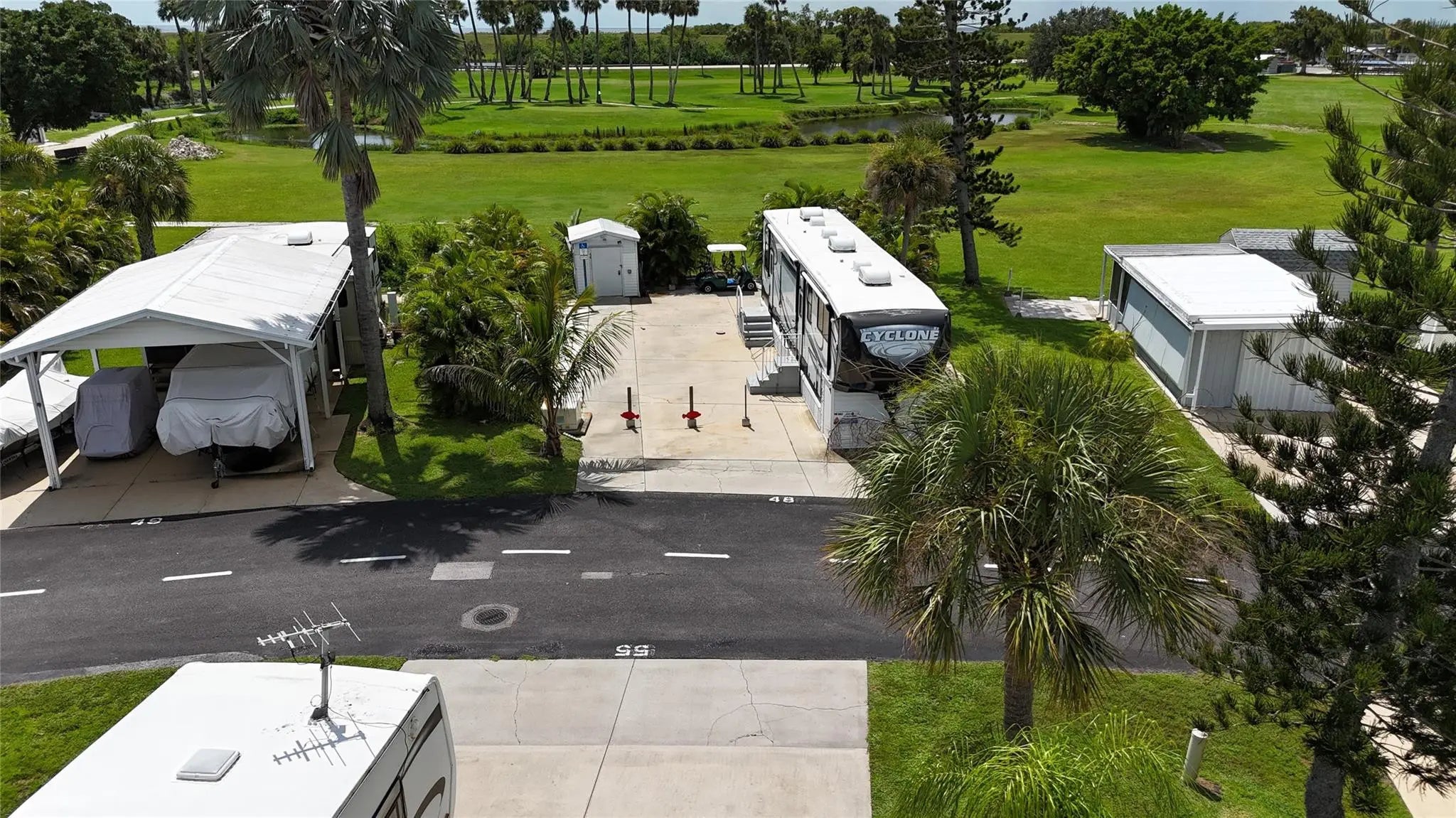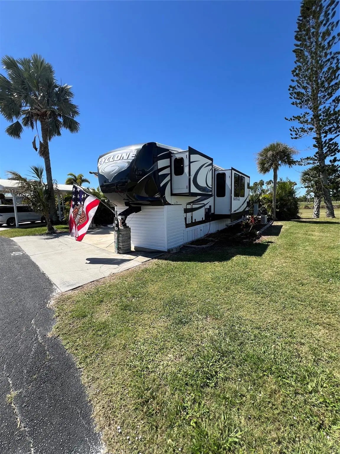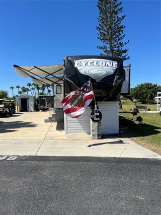 ~Blue Cypress Golf & RV Resort~ 55+ Community. 9 hole golf course. 2015 Heartland Cyclone 4200- 5th wheel RV- 43" length overlooking the golf course. Furnished w/ King size bed. New Fiberglass roof in 2024 (Transferrable warranty). Balconies in front & rear, new awnings & Hot water heater. Pavers- large patio & grilling area. Storage area with electric & water. washer & dryer plus a freezer. Community clubhouse with heated pool, new pickleball courts, shuffleboard, and many more activities. Public boat ramp is steps away for some great Okeechobee trophy fishing! Unit also comes with a generator. This is the luxury model!! New Seminole casino- Brighton Bay is a short distance away as is shopping and restaurants.