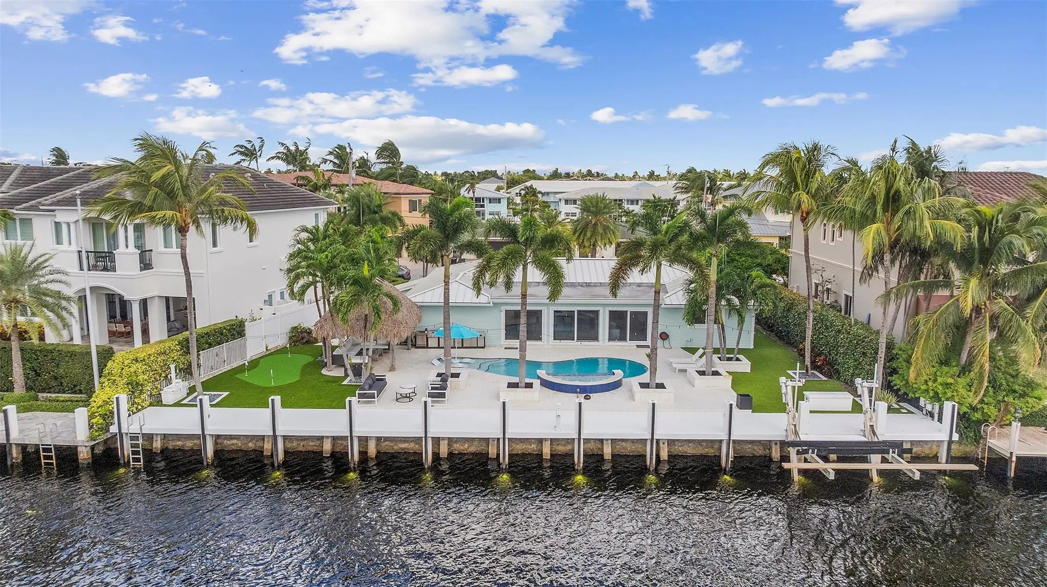 Experience coastal luxury on 110 ft of deepwater in prestigious Lighthouse Point! This reimagined waterfront home spans 2,254 sqft with 3 bedrooms & 3 baths, blending timeless design with modern sophistication. Interiors feature a designer kitchen with quartz counters, custom cabinetry, & Thermador appliances. Outdoor living is unmatched, boasting a new 110' concrete dock raised to 5.0 NAVD, underwater dock lighting, a resort-style pool with sun shelf and spa, putting green, & tiki hut for effortless entertaining. Additional features include impact windows & doors, a metal roof, SWAT mosquito system, & 2-car garage. Ideally located just 1.2 nautical miles 1.5 nautical miles to the open ocean thru the Hillsboro Inlet, this residence defines the ultimate South Florida waterfront lifestyle!