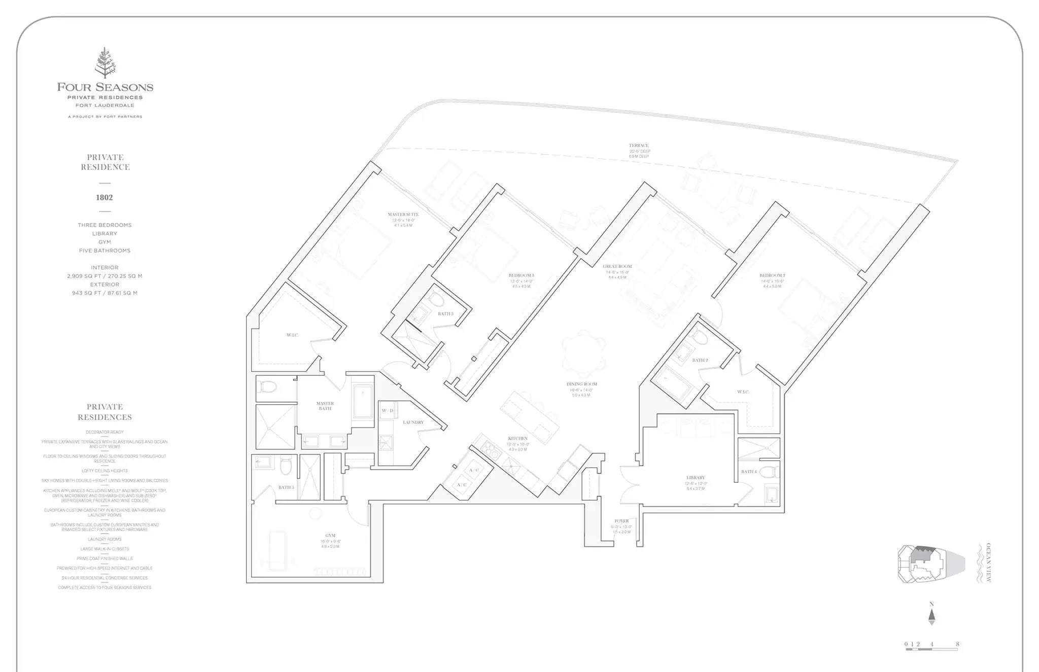 Four Seasons Private Residences Fort Lauderdale offers unparalleled oceanfront living. This 18th-floor 3-bedroom home with a library and gym (all with en-suite baths) features 2,909 sq ft of interior space and an expansive 943 sq ft terrace (22' deep) with ocean and Intracoastal views. Highlights include floor-to-ceiling glass, an open kitchen with Sub-Zero and Wolf appliances, laundry room, 2 deeded parking spaces plus valet. Residents enjoy dual oceanfront pools, beach service, Michelin-starred dining, world-class spa, and renowned 24-hour concierge synonymous with Four Seasons. Nearby Las Olas Marina accommodates superyachts to 315 ft and property is minutes from intl. and executive airports—luxury, privacy, and prestige at their finest. Notice required for showings -3D tour available Information provided is believed to be accurate but buyer and buyer agent are responsible for verifying all information.