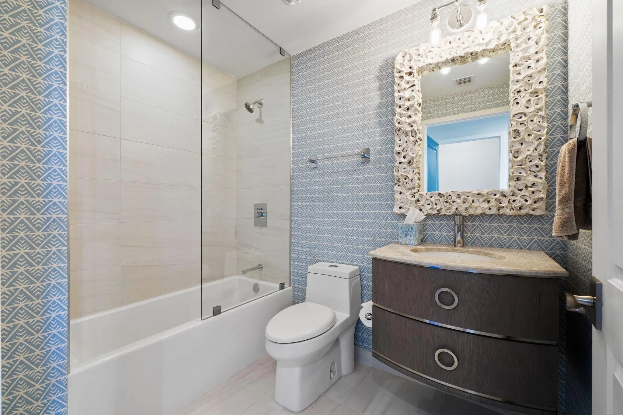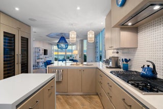 Experience opulent coastal living in this showstopping corner flow-through residence with panoramic exposure from ocean to city. Floor-to-ceiling glass nearly wraps the entire home, capturing direct sunrise ocean views to sunset Intracoastal and skyline vistas, with spacious terraces on both sides. Enter through a private foyer to blue porcelain herringbone floors, custom millwork, and an octagonal dining ceiling framing a designer chandelier. Features include 3 bed, media lounge & office, 5 baths, expanded primary suite with quartz dressing room, Control4 smart system for seamless luxury living. Auberge delivers the ultimate resort lifestyle with world-class amenities, beach and pool attendants, on-site dining at the new oceanfront restaurant Delmar, and holistic treatments at Evara Spa.