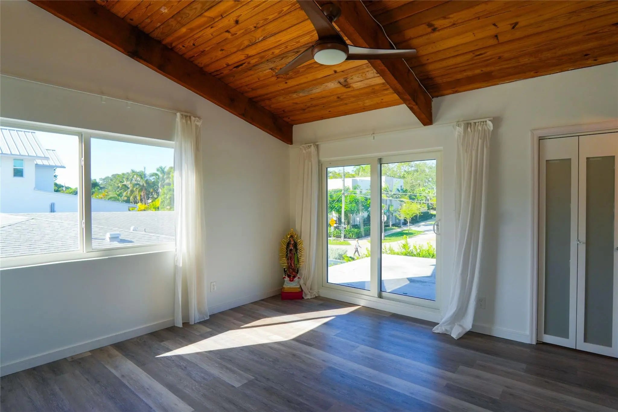 Discover this beautifully remodeled waterfront residence perfectly situated in the prestigious Victoria Park neighborhood. Enjoy no fixed bridges and just minutes to the open ocean, offering an ideal location for boating enthusiasts. Feauturing a spacious first-floor primary suite and two additional master suites on the second floor, each with private terraces. Vaulted wood ceilings and an impressive two-story living room with a fireplace create an airy, elegant ambiance with serene water views throughout. Every detail has been thoughtfully updated including a new roof, impact windows, and travertine pavers surrounding the sparkling pool. The 56-foot private dock accommodates your yacht or sailboat with ease, providing seamless access to the Intracoastal and beyond.