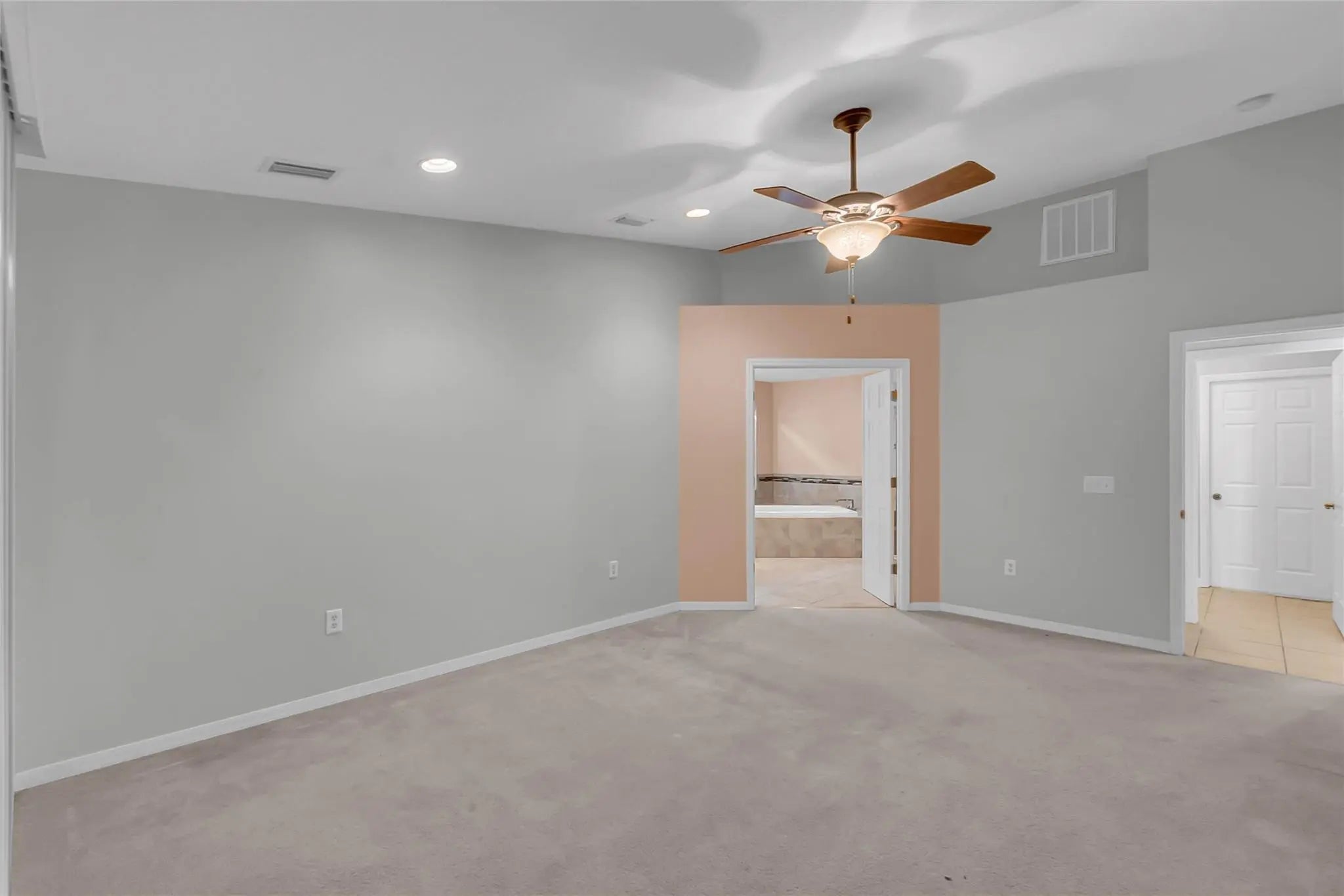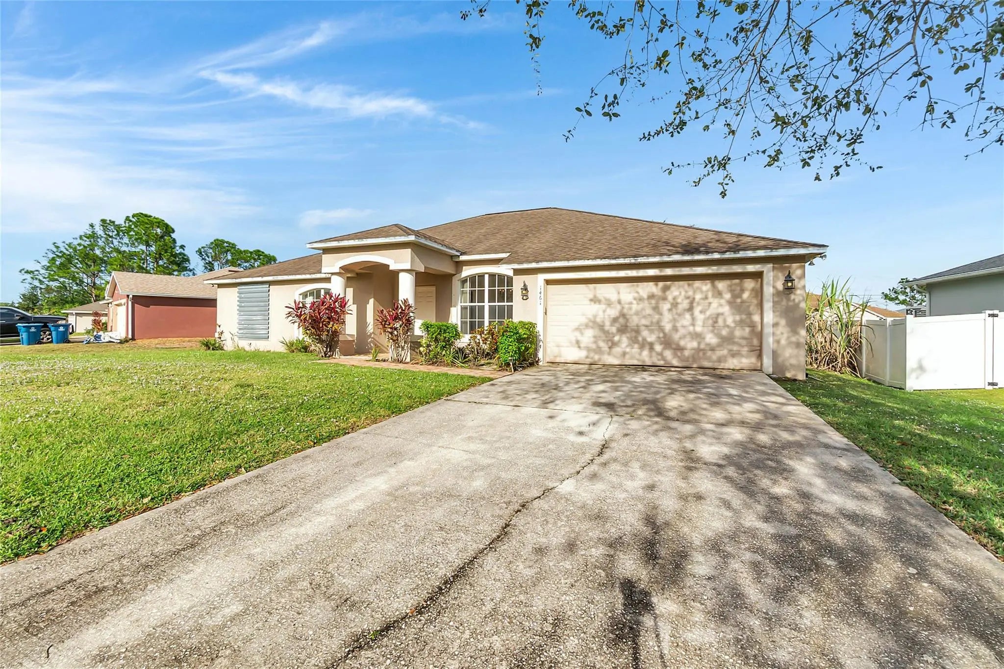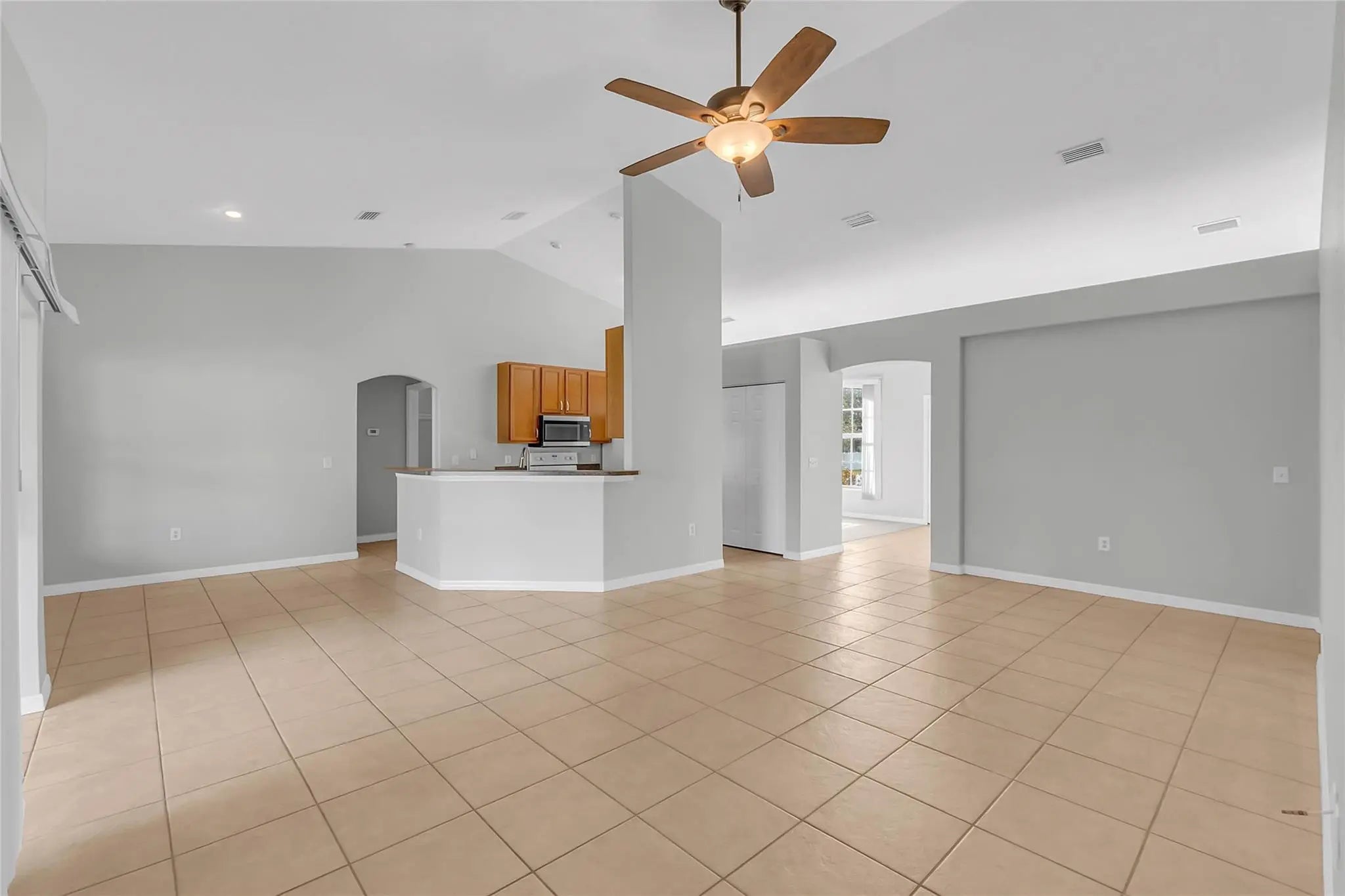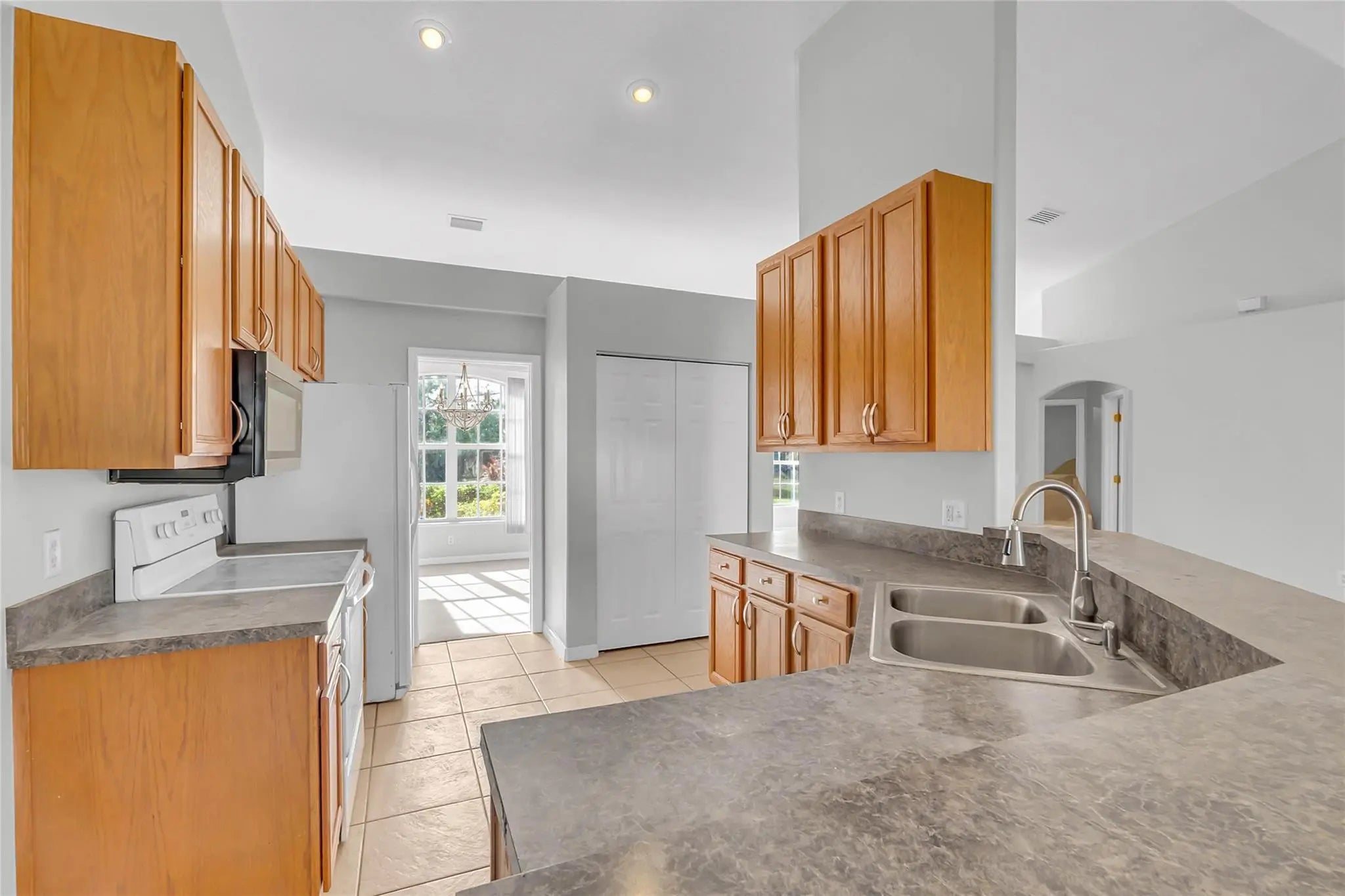 Bright, spacious home featuring vaulted ceilings, fresh paint, and an open layout perfect for modern living. The large living and dining areas flow into a generous family room with sliding doors to the screened patio and private backyard. The kitchen offers ample cabinets, bar seating, and a cozy breakfast nook. The split-bedroom design includes a roomy primary suite with a beautifully updated bath featuring a double vanity, soaking tub, walk-in shower, and an oversized closet. Move-in ready with tile in main areas and carpet in bedrooms—ideal for comfort and entertaining.