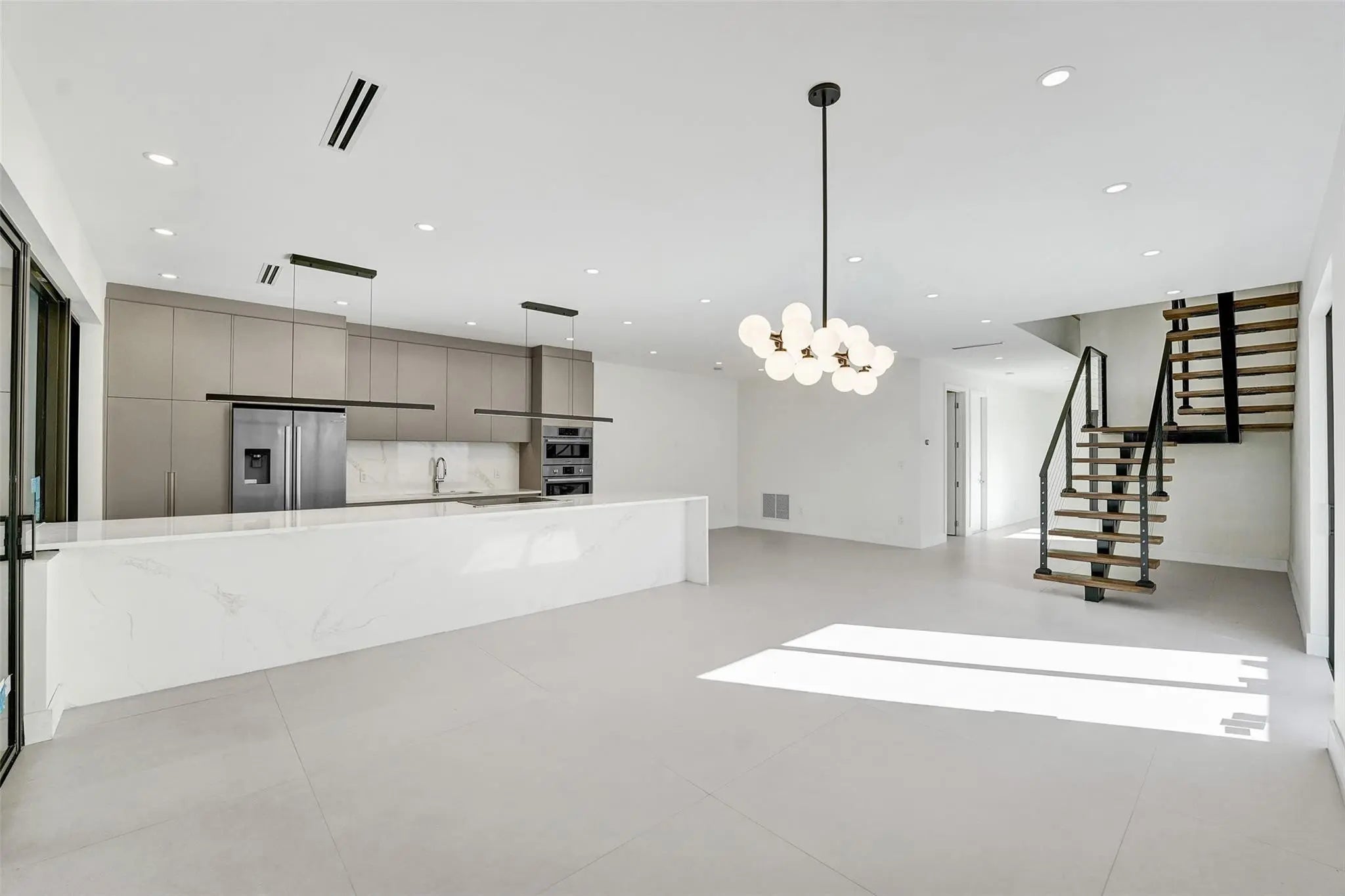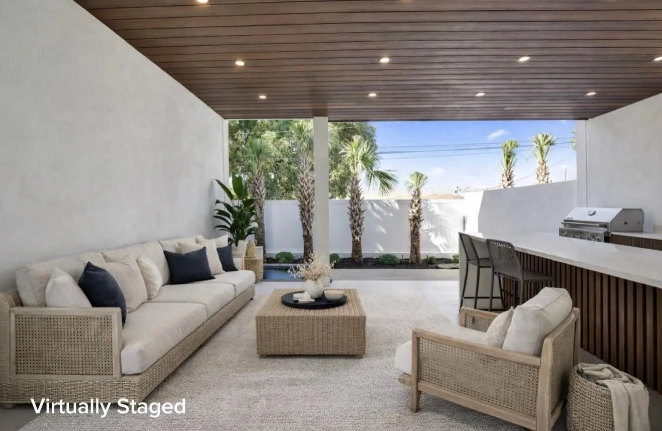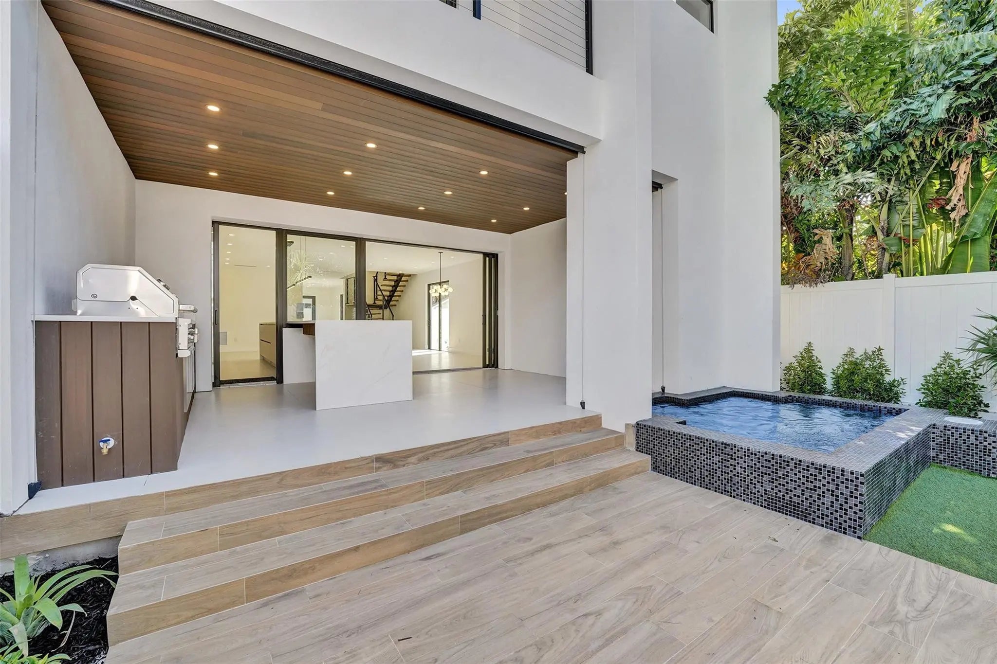 New construction luxury home w/ 2,775 sqft, built w/ a reinforced structural system, interior solid concrete walls for sound prevention, & an elevated foundation. High-end finishes include designer Florence cabinetry, Bosch appliances, LED recessed lighting, Italian porcelain tiles, & a floating staircase. Enjoy seamless indoor–outdoor living w/ sliding glass doors that retract into the wall, a fully equipped summer kitchen, hot tub, integrated mosquito screen, exterior lighting, & designer landscaping. 3 bedrooms, 4 bathrooms, office/den, & a laundry room. All bedrooms offer walk-in closets and ensuite bathrooms with Kohler fixtures, including a primary suite with 2 walk-in closets. Home also includes high-impact windows & doors, 2 AC units, & a rainwater drainage system.