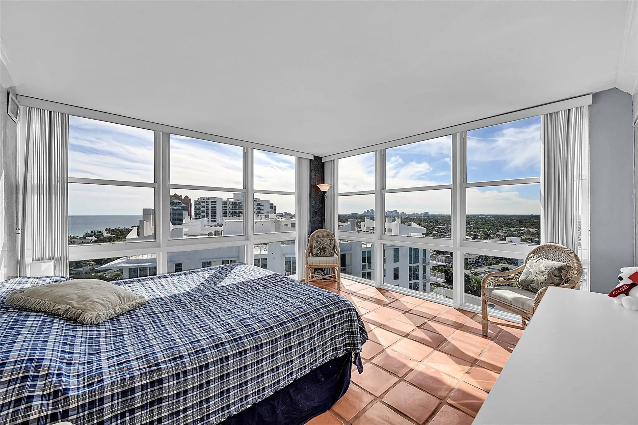 Rarely available south-facing end unit on high floor, offered as a fully furnished annual rental. This 2 bed/2 bath condo features 1,200 square feet of bright living space with imported Italian terracotta tile flooring throughout and hurricane impact windows. Enjoy an expansive balcony with breathtaking ocean, Intracoastal, and city views. The spacious living area with abundant natural light, while the open kitchen offers tile countertops and a breakfast bar. The primary suite features floor-to-ceiling windows, a walk-in closet, and an ensuite bath. Additional conveniences include an in-unit washer and dryer. The building is currently undergoing extensive repairs, and not all amenities will be available during rental period. Ideally located just minutes from beaches, dining, and nightlife.
