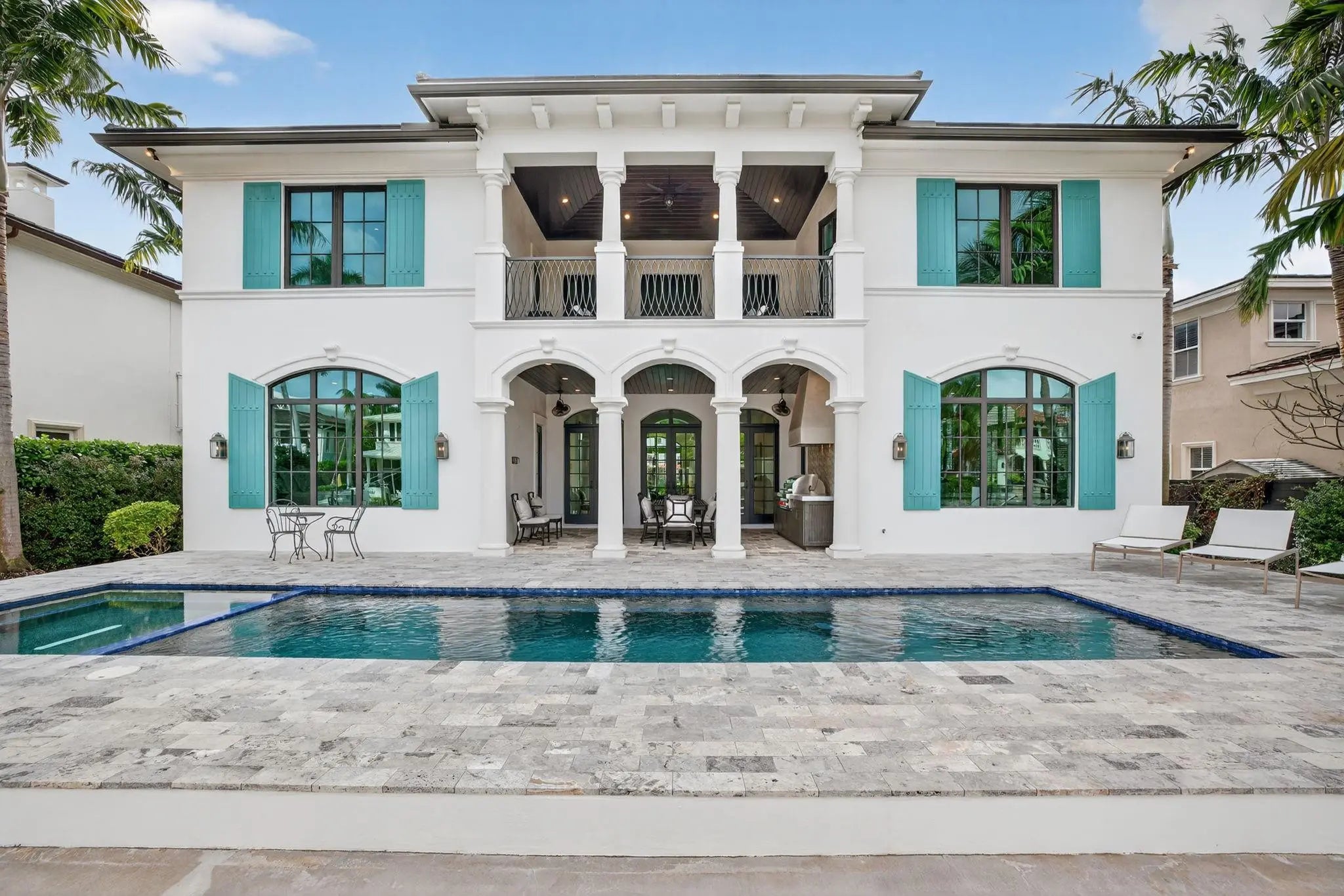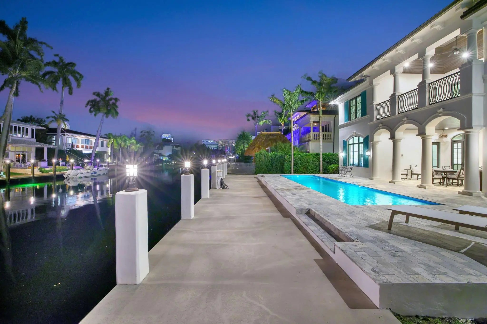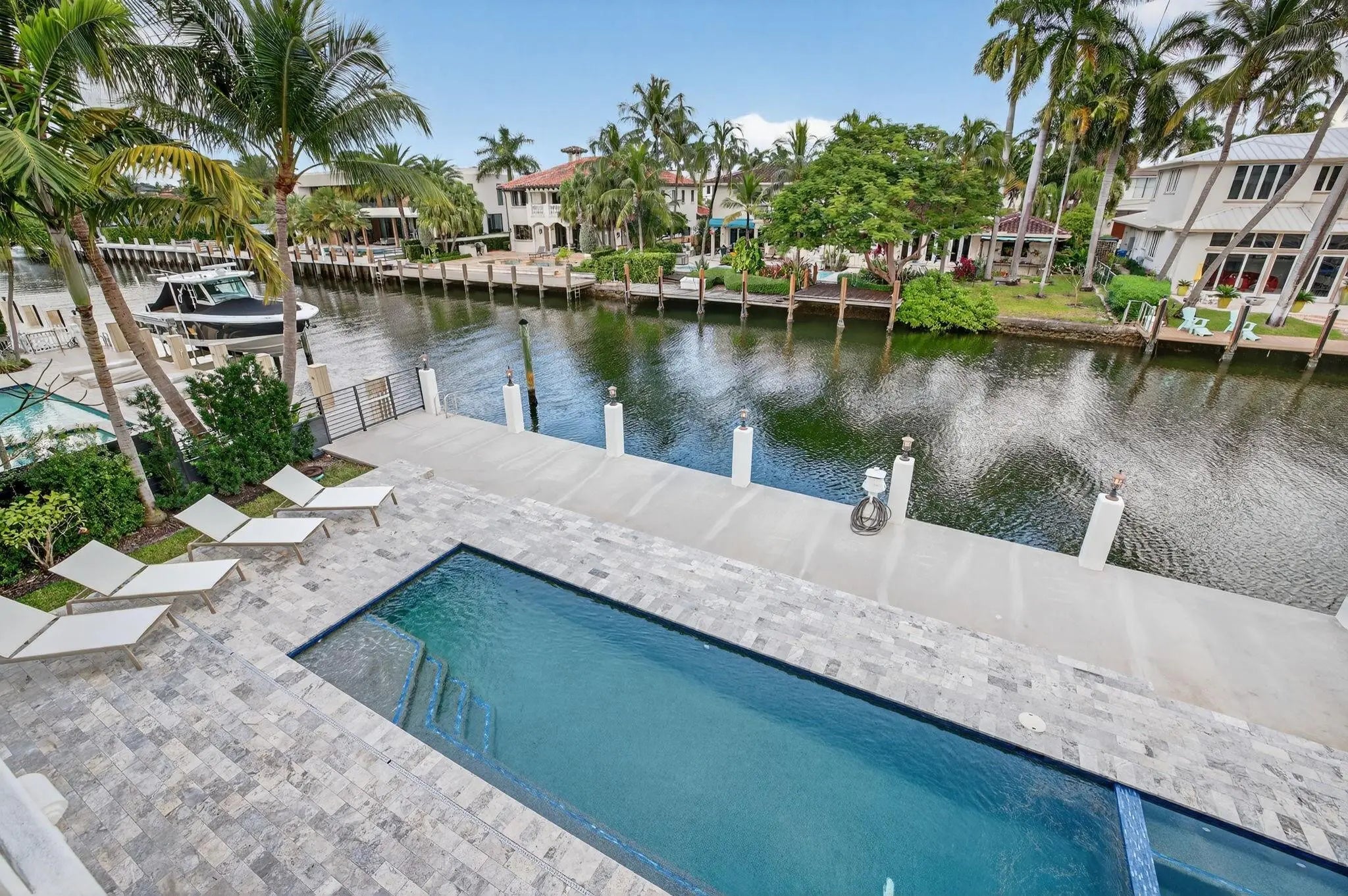 Located in highly desirable guardhouse secured Seven Isles! Elegant, newer British West Indies-inspired 75 ft deepwater residence has much to offer the avid boater & entertainer. Abundant natural light, high ceilings, balanced formal & living areas includes formal living room, lounge, amazing eat-in Chef's Kitchen, marble island & counters, Wolf & Sub-Zero appliances. Ample storage throughout. Superior floorplan includes rare 1st level primary suite, large dual closets & spa bath. Large home office or potential 5th bedroom. 2nd level loft/media area & wet bar opening to large, covered balcony capturing waterfront & pool views. Expansive secondary bedroom suites. Salt-water heated pool & BBQ area. Close to beaches, shopping & dining on Las Olas. Available for quick closing. *Garage is Lift Compatible