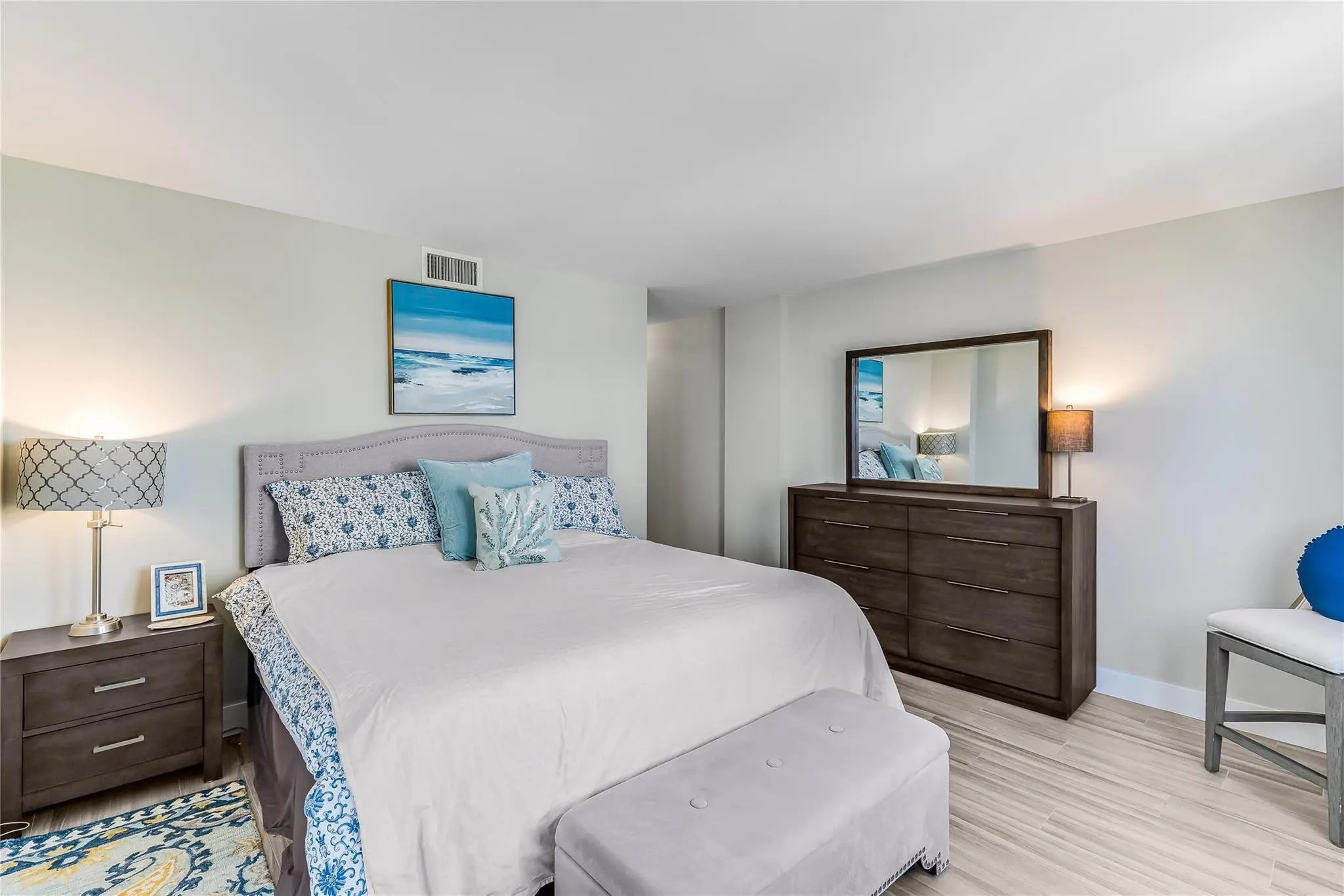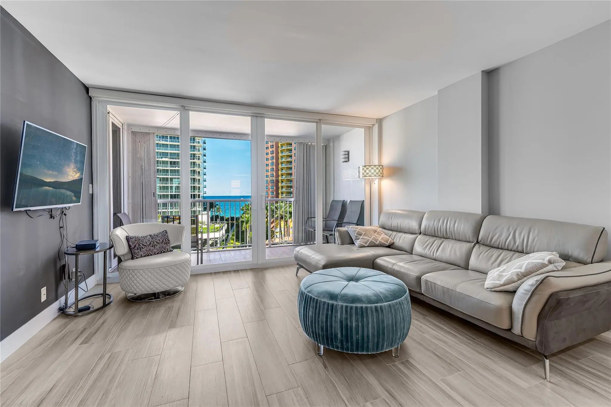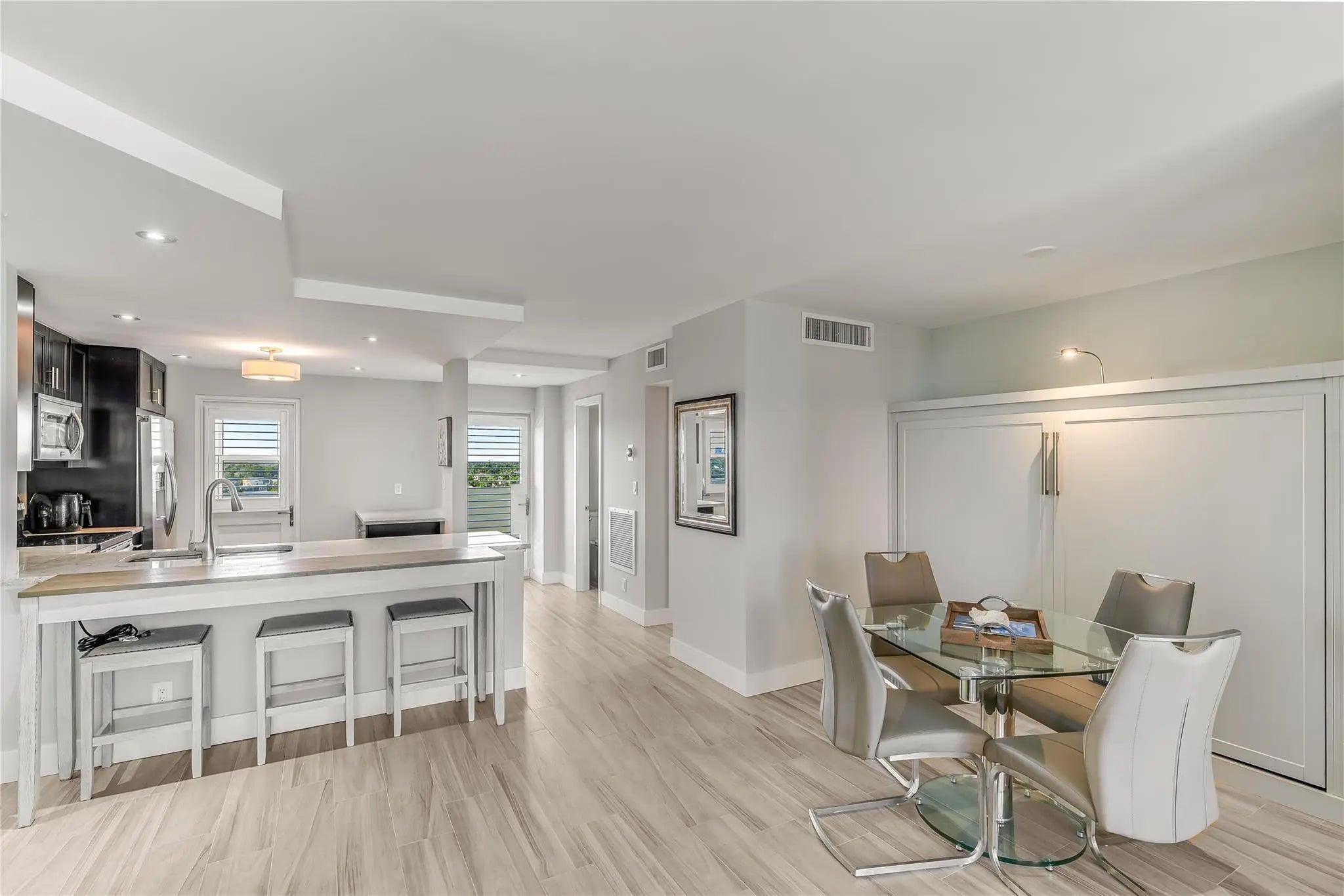Beach Lifestyle~Completely Remodeled & furnished! Ocean views when entering. Huge 1 bedroom 1.5 baths Open, flexible floor plan w/contemporary flair. Parking space near entrance door. Beautiful custom kitchen. Spacious primary bedroom suite, custom built walk-in closet, slider opening to balcony. Lots of storage w/custom closets & a wall unit disguised as a queen size Murphy bed. Impact windows, sliders, doors & window treatments. 50 Year inspection completed! 24/7 desk & security, gym, pool, clubhouse & BBQ area. Pet friendly. WIFI, cable & water included in fees. Enjoy the best of both worlds by experiencing gorgeous sunrises & intercoastal views w/spectacular sunsets! Tropical lifestyle in-convenient location walk to restaurants, shopping & parks close by.