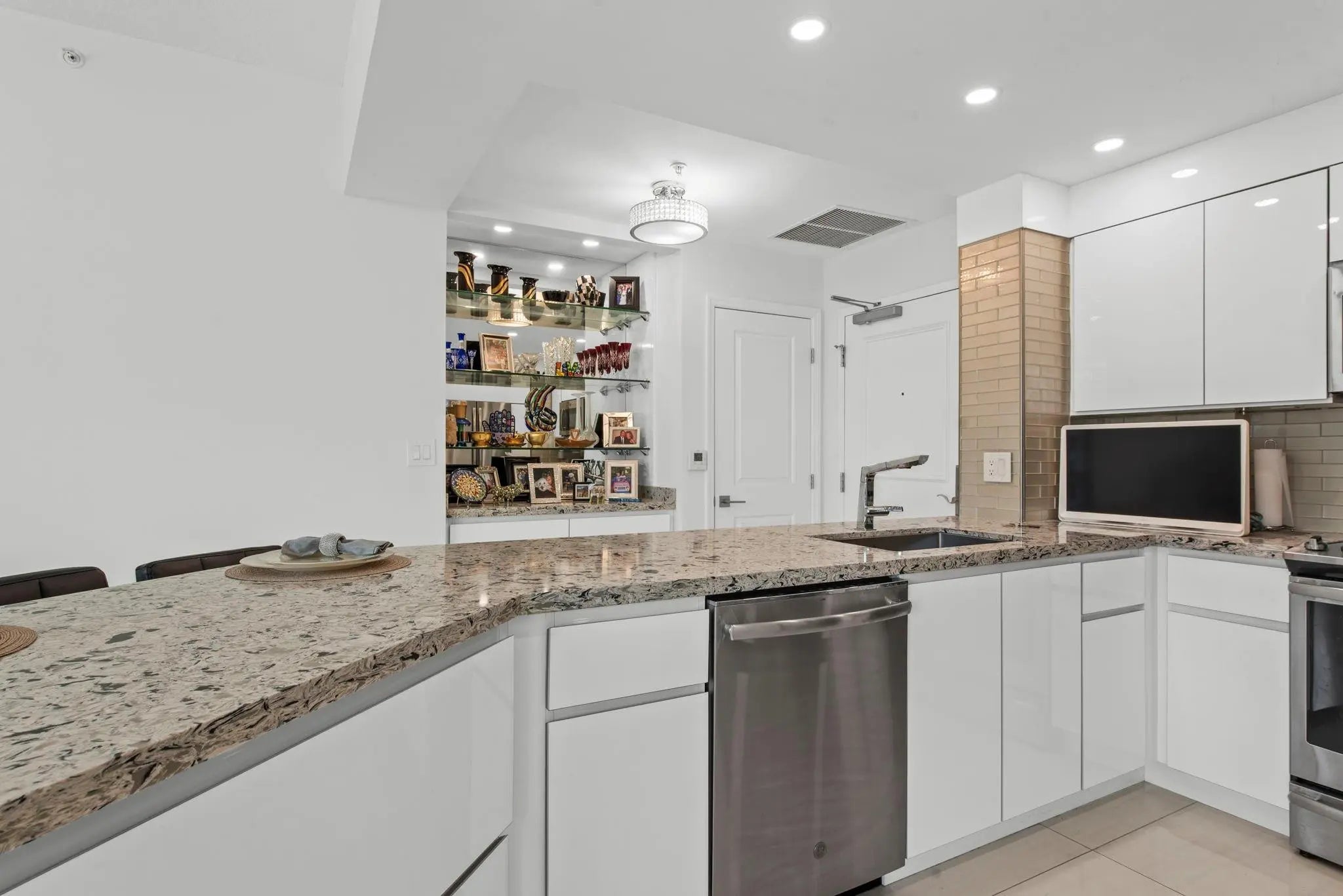 NEWLY PRICED TO SELL!! EAST FACING 2/2 With 10ft Ceilings & Contemporary REMODEL. *** 2 Separate Parking Spaces & Storage Locker included *** Waterfall Quartz Countertop with Italian White lacquer Cabinetry, Brand New White Cabinets in Both Bathrooms, Stainless Appliances, Glass Tile Backsplash, Ceiling Raised in Kitchen with added High Hats, 24x48 Italian Porcelain Tile Throughout the unit & Bathrooms, Newer Washer/Dryer, Extended Balcony with River & Garden Views. 5* LIFESTYLE INCLUDE CONCIERGE,TROPICAL POOL DECK/HOT TUB, CLUBROOM, BUSINESS CENTER, THEATER MOVIE SCHEDULE, PET FRIENDLY, 2 STORY GYM,24 HR VALET/SECURITY. ALL WALKING DISTANCE TO ALL RESTAURANTS,SHOPS, ART EVENTS,PUBLIX MARKET ON FAMOUS LAS OLAS BLVD. GREAT LAS OLAS LOCATION