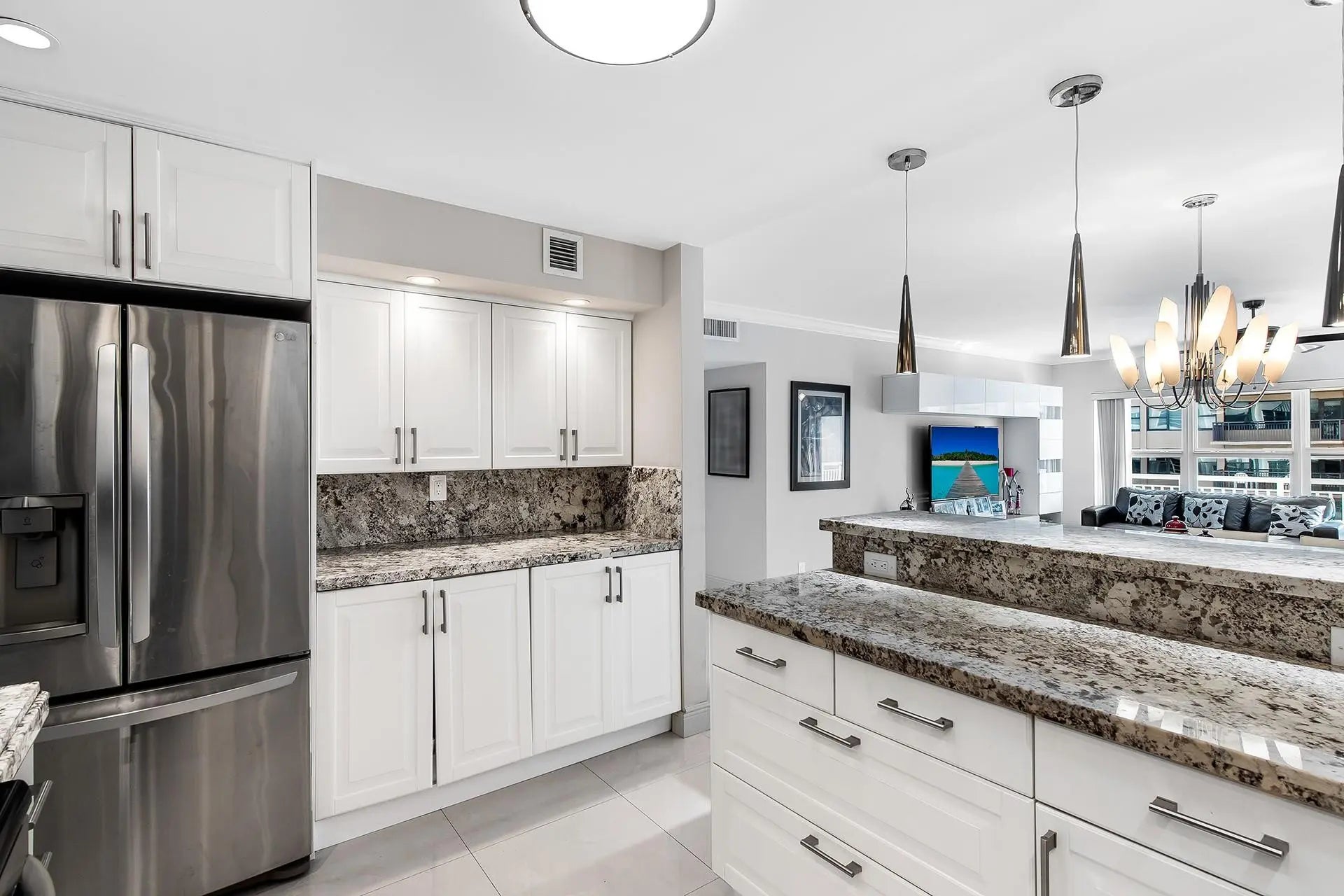 AVAILABLE APRIL 1, 2026 - JANUARY 31, 2027 Beautifully renovated, tastefully furnished contemporary south side unit directly on the sand. Open kitchen, white cabinets, stainless steel appliances, full-size washer & dryer, granite countertops, stylish & contemporary furnishings, large flat-screen TV. Enhanced cable w/HBO & high-speed Wi-Fi included with rent. It is conveniently located in the middle of Galt Ocean Mile directly across from grocery stores, CVS, Dunkin Donuts, restaurants, stores, and more! The building has a large gym, common room with a full kitchen, grilling area, heated pool, game room, bike storage, and more!