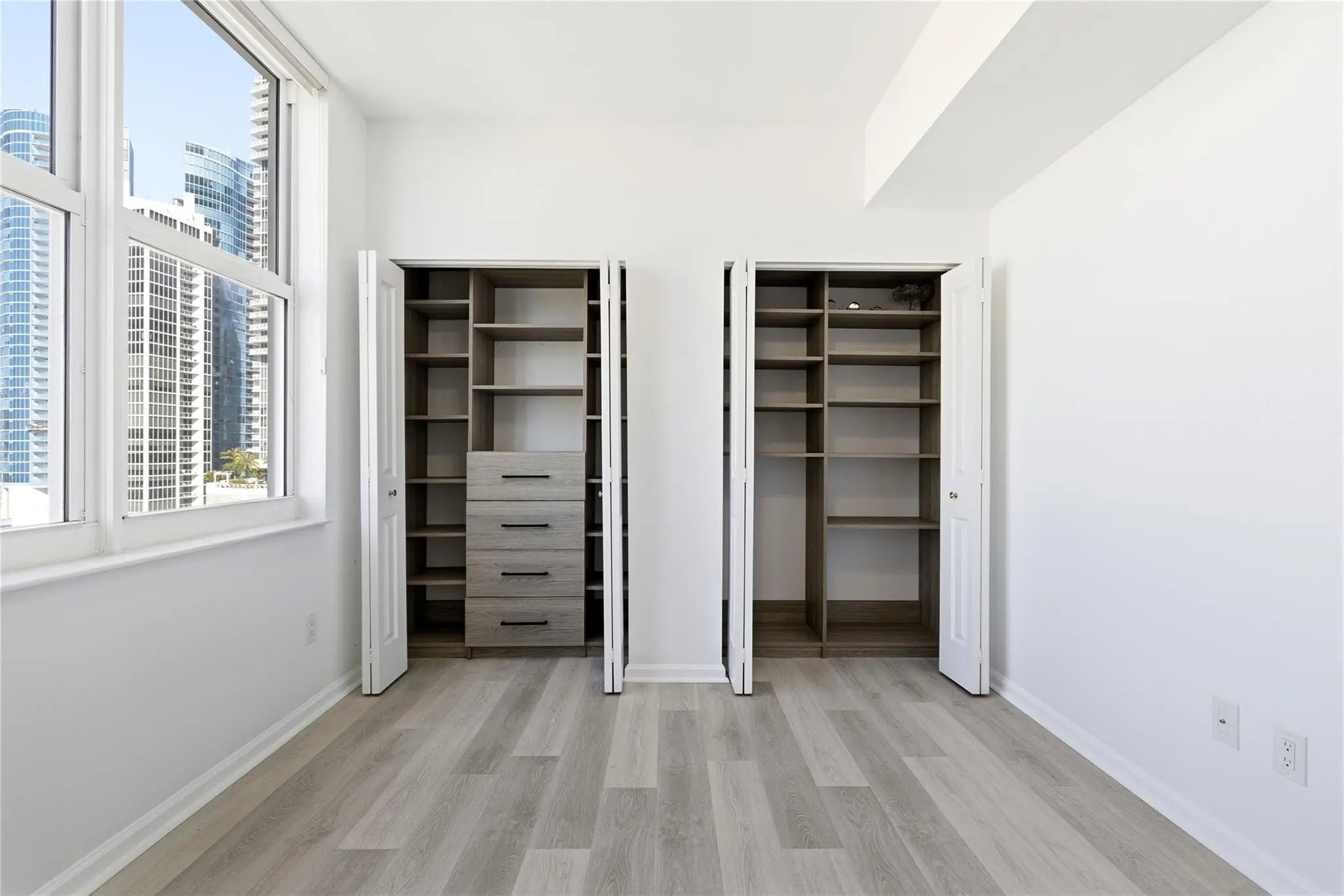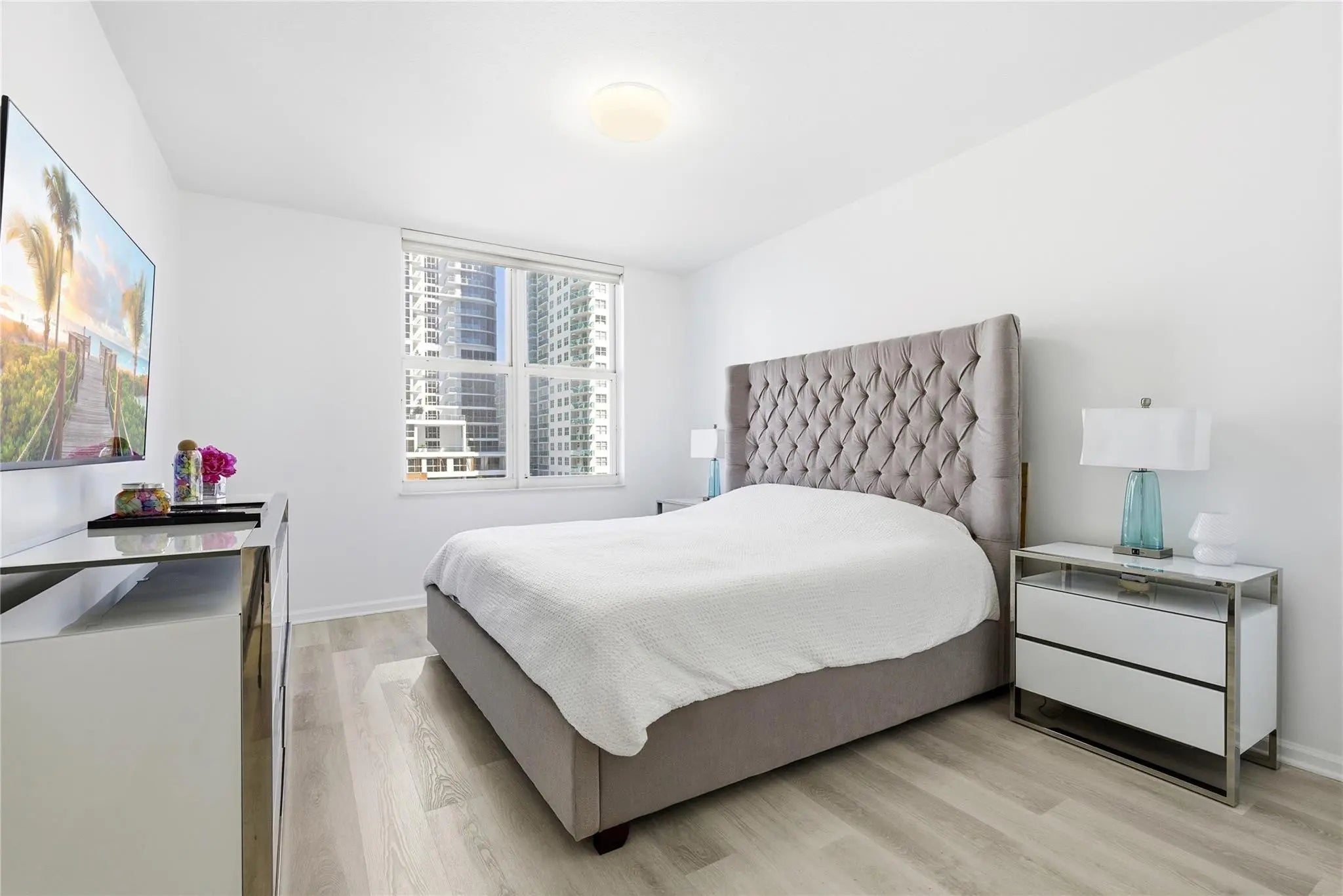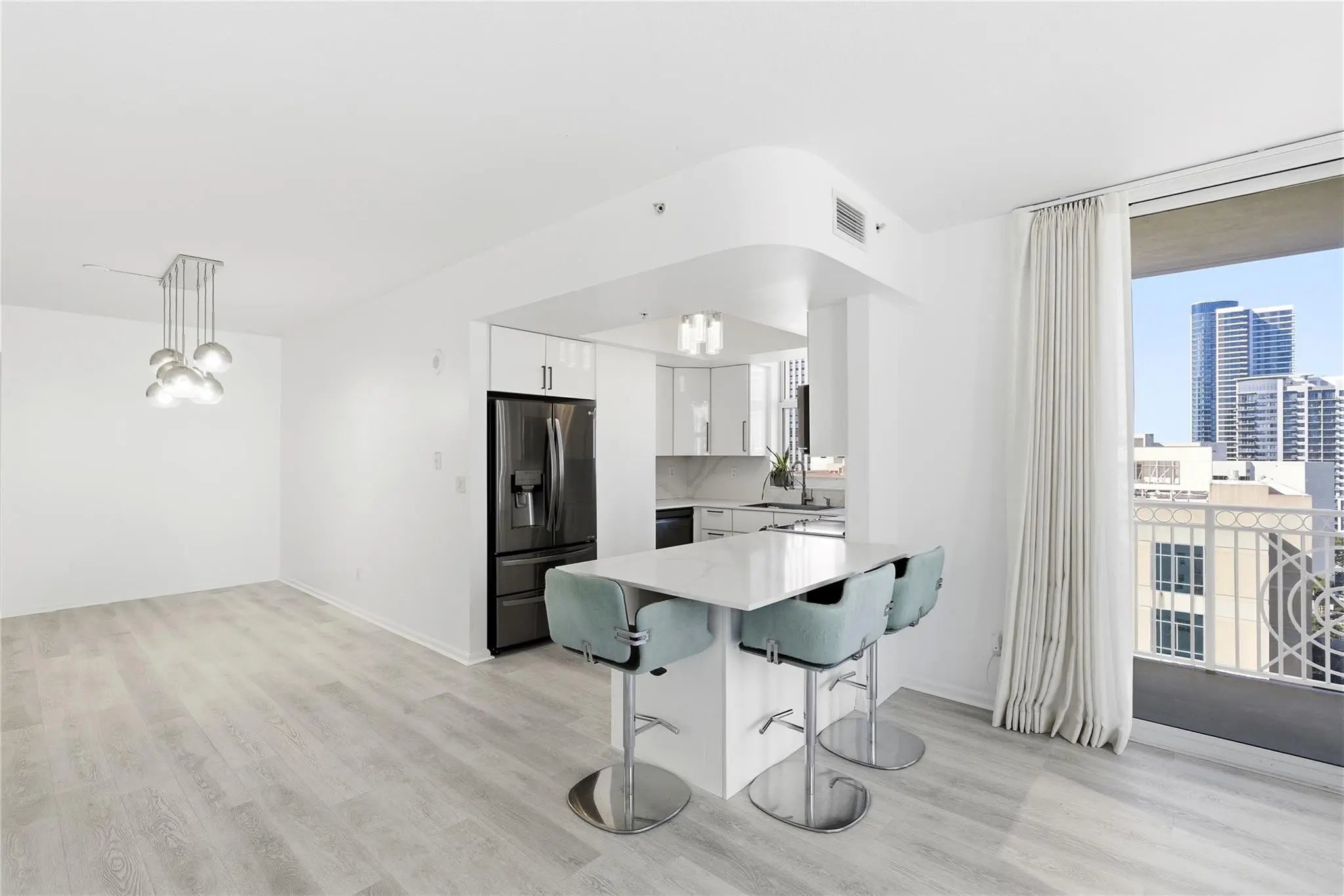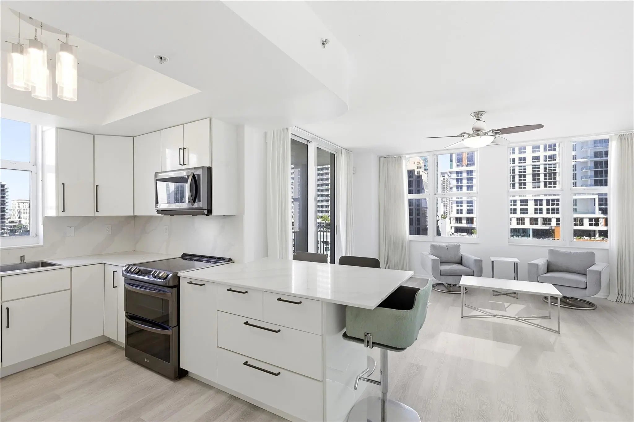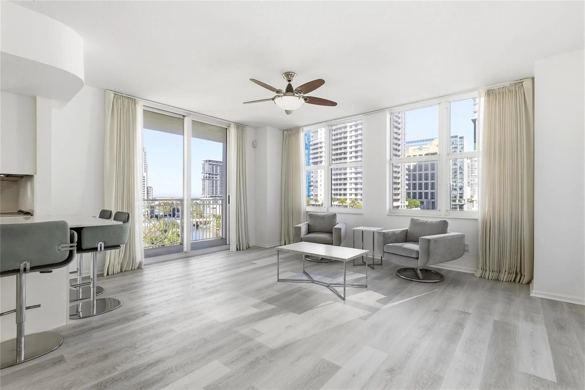 Rare River Facing 3/2 Corner Unit. Stunning River, City, Sunset Views! Completely remodeled kitchen w/ upgraded appliances, custom extended peninsula. Luxury vinyl plank floors. Laundry room w/ full size machines. Custom window shades & closet built-ins all bedrooms. Remote control living room curtains. Primary bedroom walk-in closet. Primary bath dual sinks. Move-in ready. Conveniently located parking space within integrated garage. Monthly HOA $1,414 incl water/sewer/trash, parking, amenities: 24 hour concierge, front desk, package room, rooftop pool/lounge, bbq grills, gym, basketball, racquetball, yoga studio, jacuzzi, steamrooms, saunas, massage room, bike/kayak racks, business center, yoga lawn. Pet & Investor friendly. Walk 5 min to Las Olas dining, shopping, entertainment!