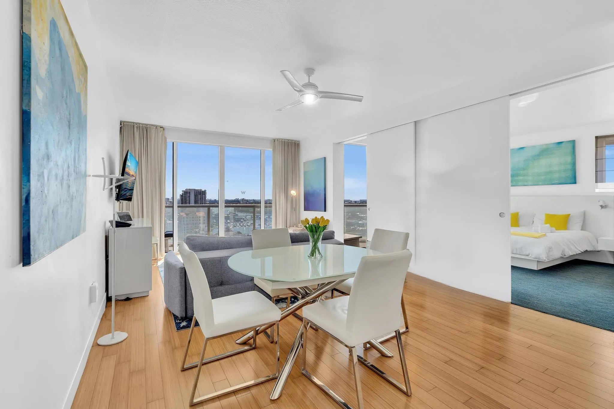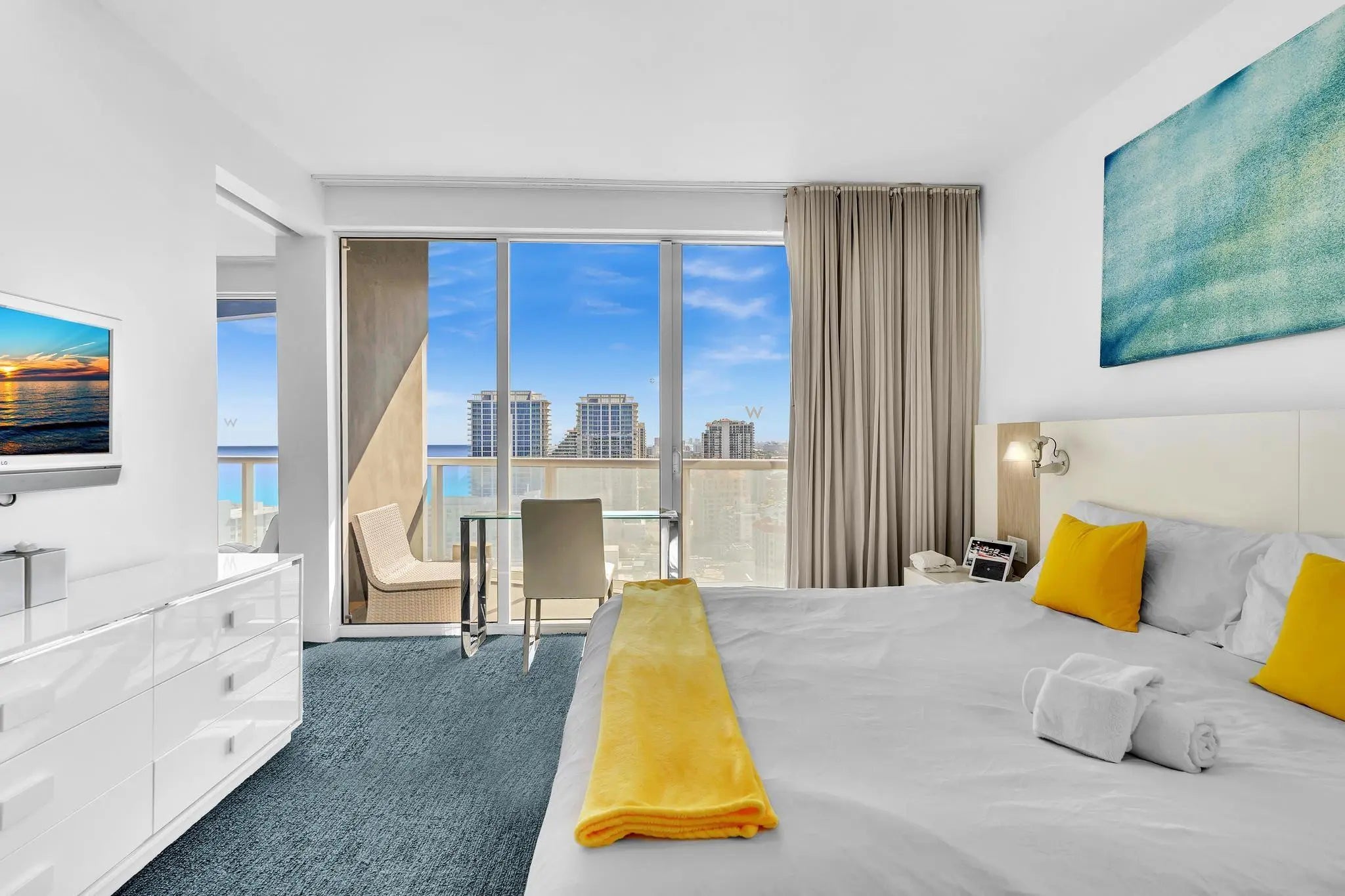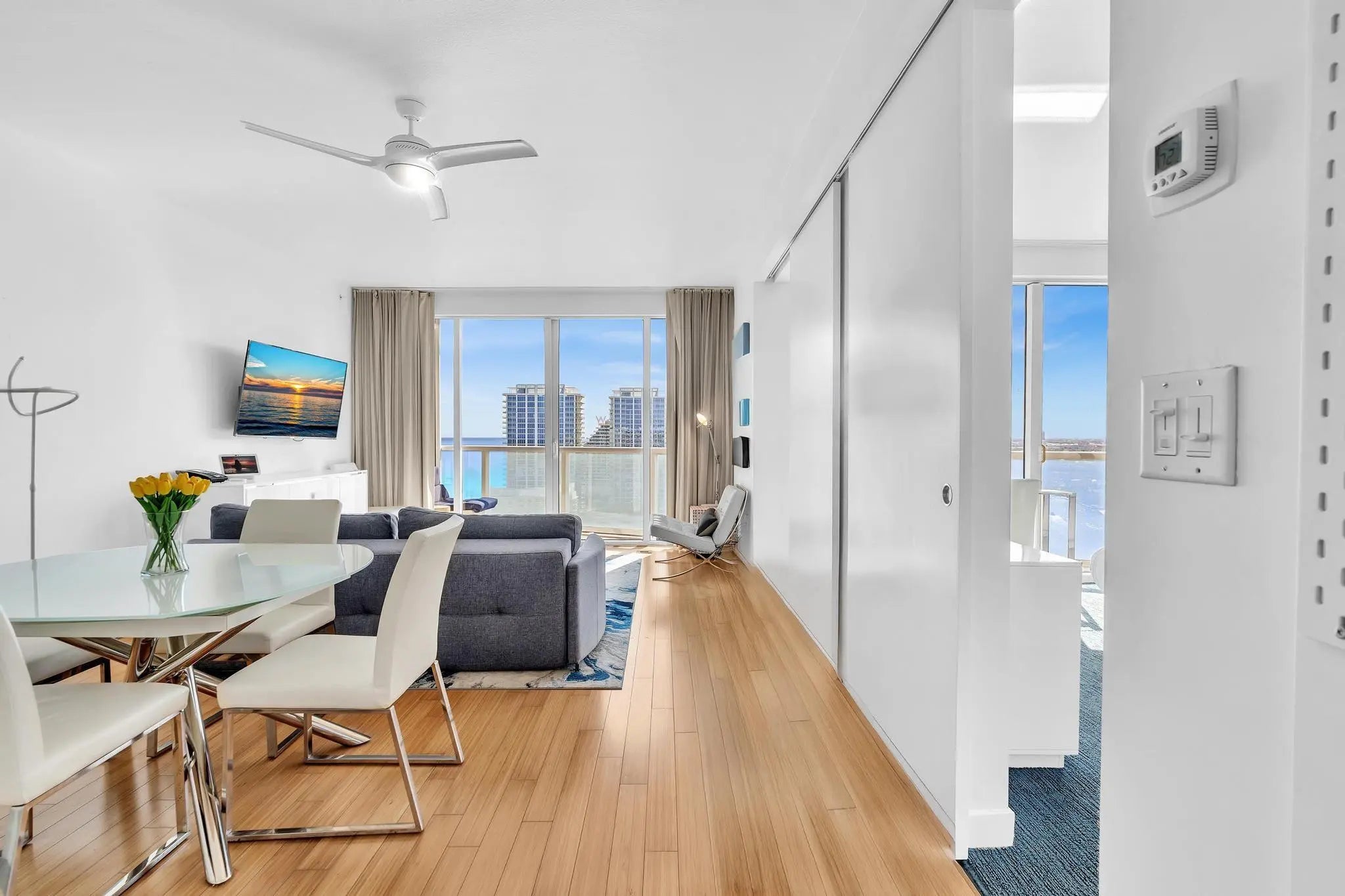 All the way up-sub-penthouse and south-facing at the W, with panoramic ocean views on one side, intracoastal/city views on the other (Miami in the distance). Two private balconies--sunrise coffee , sunset cocktails, every day. Modern interiors feature sleek Italian cabinetry, separate Jacuzzi soaking tub and shower, and an almost-new in-unit front-loading washer and dryer. Resort living: two pools, hot tub, fully staffed spa, 24 hour gym, beach service, valet and world class dining downstairs at Steak 954/ the W Living Room/ El Vez/SoBe Vegan-or order room service when you'd rather relax without going out. No rental restrictions--enjoy full time yourself, as a beach escape, or rent it via the W Hotel Program or AirBnb it yourself. Come see the view in person--photos don't do it justice.