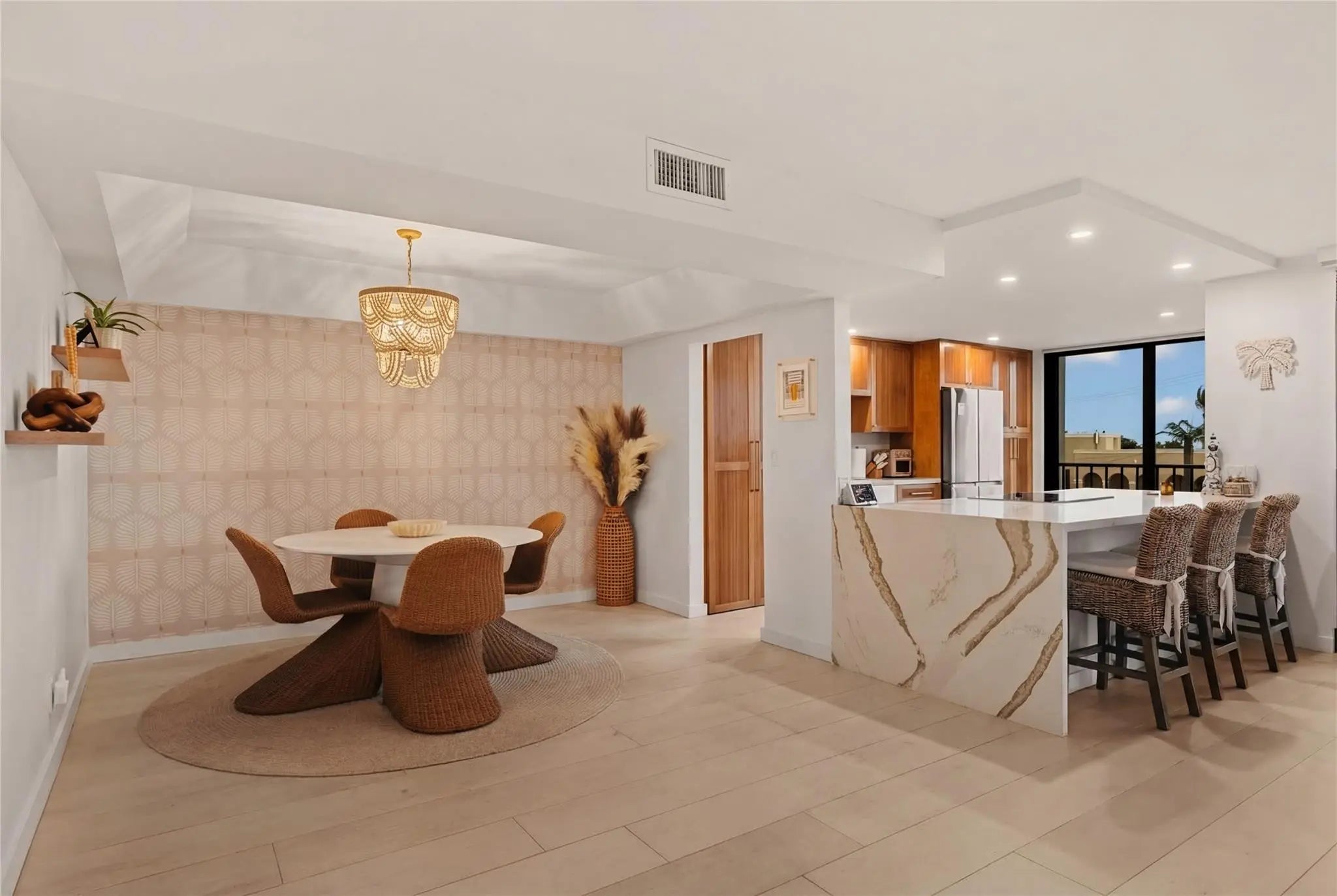 Turnkey renovated, this 2/2 residence at the Shore Club offers an open-concept living with high-end finishes throughout. The redesigned kitchen with quartz waterfall island, custom cabinetry, Samsung Smart stainless steel appliances, and recessed lighting. Italian tile flooring throughout, electric motorized shades, hurricane-rated windows and doors, and an Ecobee smart thermostat. The primary suite includes a custom walk-in closet and spa-inspired bath with herringbone tile. Additional highlights include a private balcony, shared private entrance, custom storage, a deeded covered parking space next to the elevator, and a storage unit. Oceanfront amenities include a pool, fitness center, EV charging, underground tunnel access, 24/7 security, and guest parking. Cable and internet included.