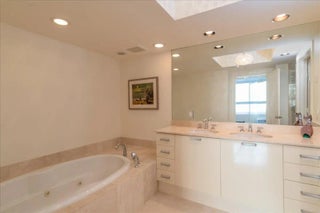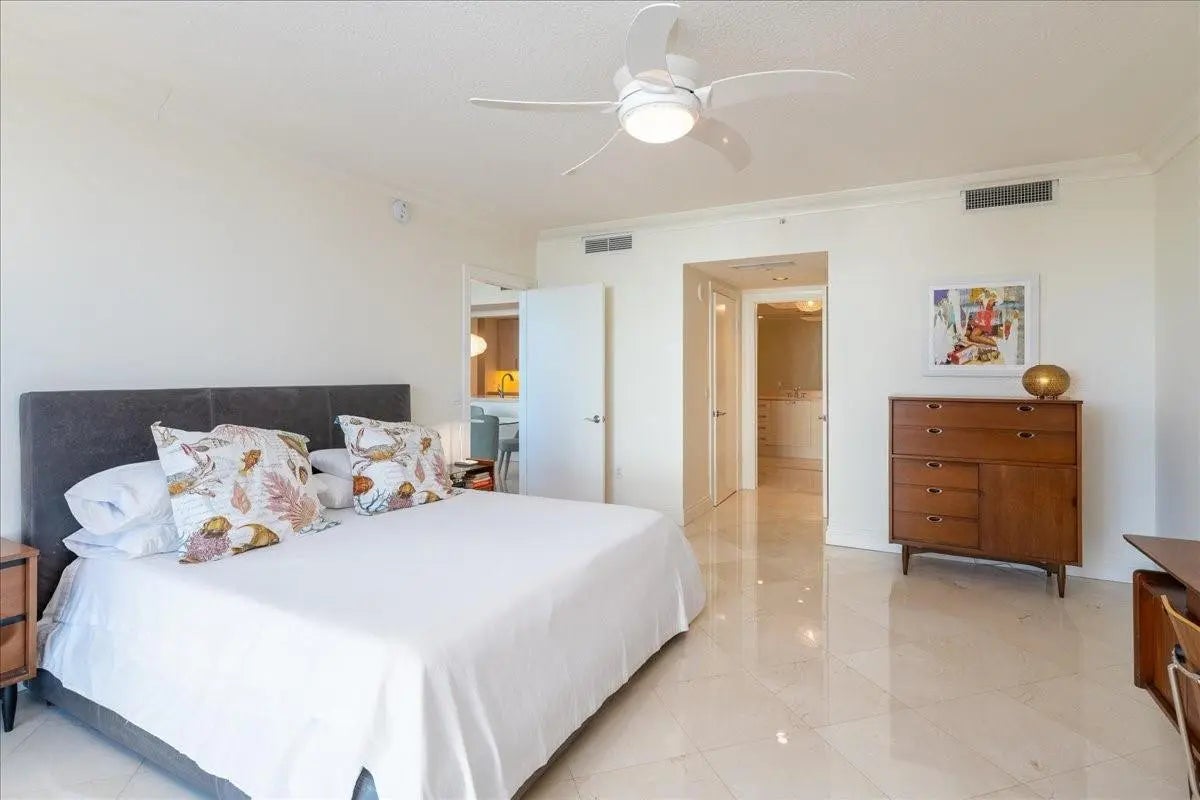 Lovely residence with sweeping views of the Intracoastal Waterway, Sunrise Bridge, and Bonnet House Gardens. This bright, airy unit features elegant marble floors throughout and a versatile den with full ensuite bath and closet, easily convertible to a third bedroom. The chef’s kitchen is a $70,000 upgrade with Intracoastal views, Sub-Zero refrigerator, modern appliances, custom maple cabinetry with imported Austrian veneer, quartzite countertops, and a mother-of-pearl backsplash. Spacious living and dining areas offer an active water view. Split-bedroom layout provides privacy with ensuite baths, walk-in closets, and soundproof party walls. Includes 2 premium deeded corner parking spaces. North-facing exposure delivers abundant natural light without harsh sun for quiet coastal enjoyment.